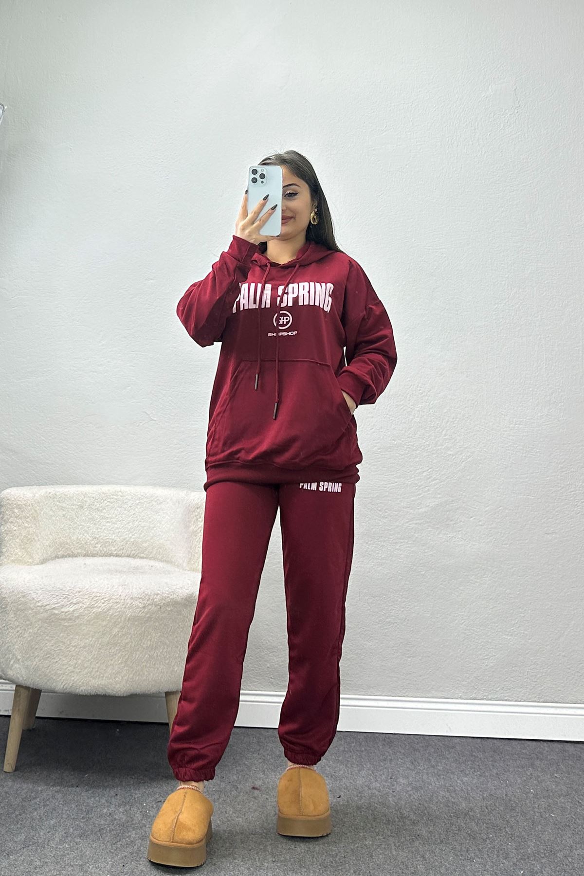 Kapşonlu Crop Eşofman Takımı Bordo - 20965.1878.