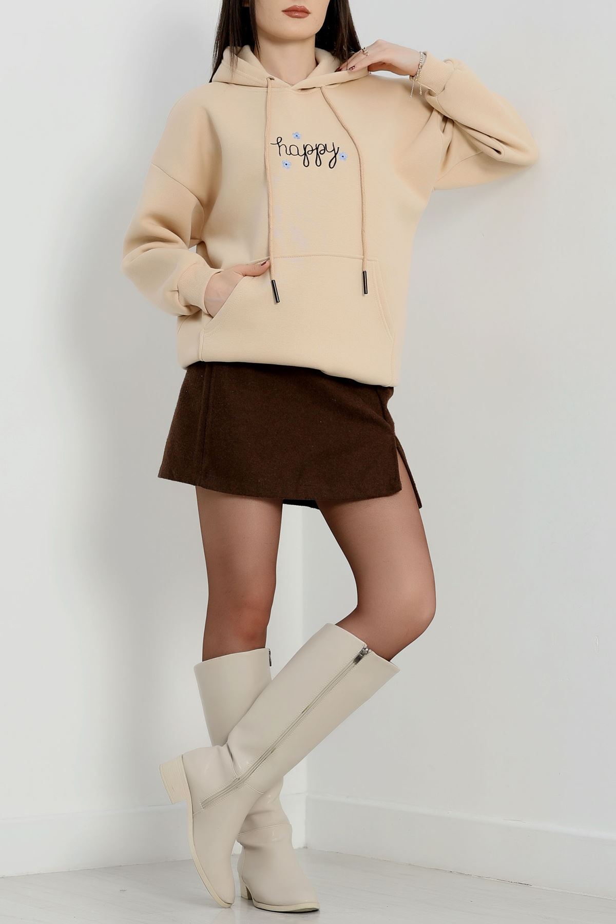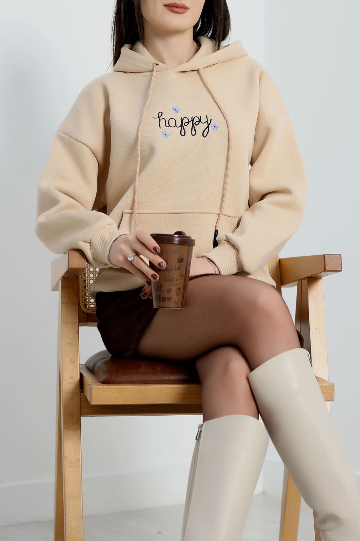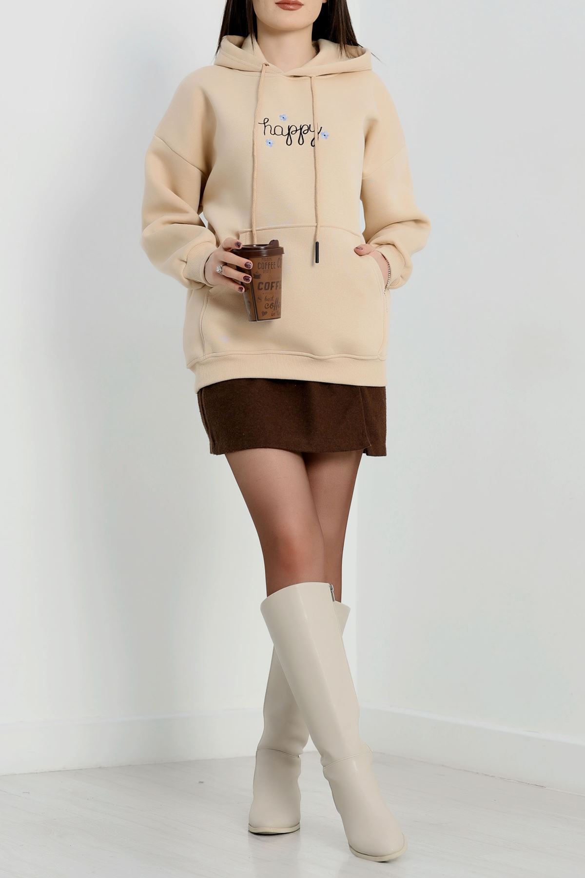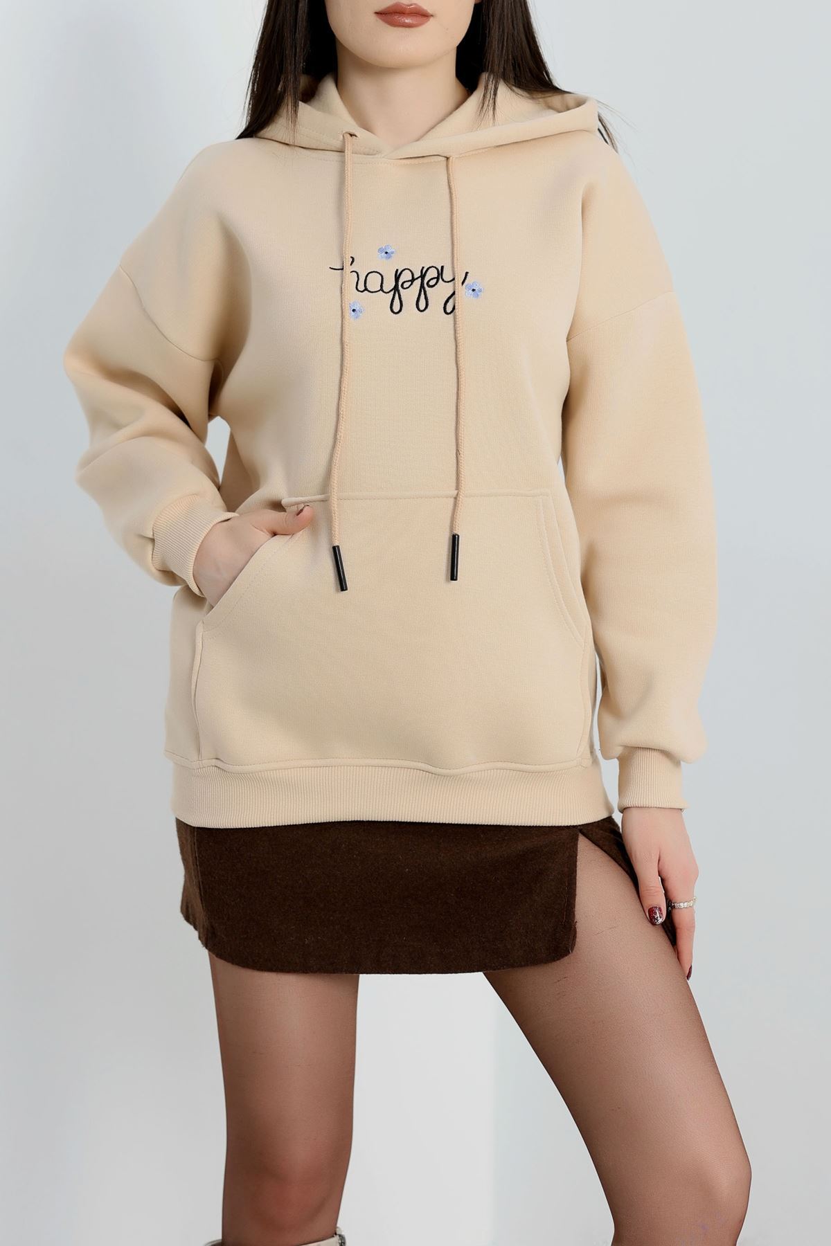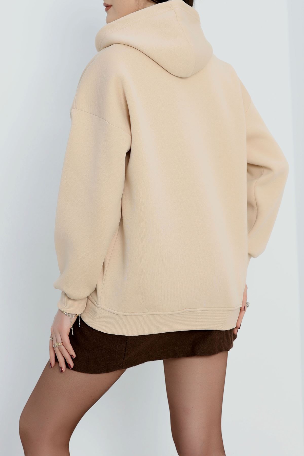3 İplik Kanguru Cepli Kapşonlu Sweat Bej - 42250.1878.