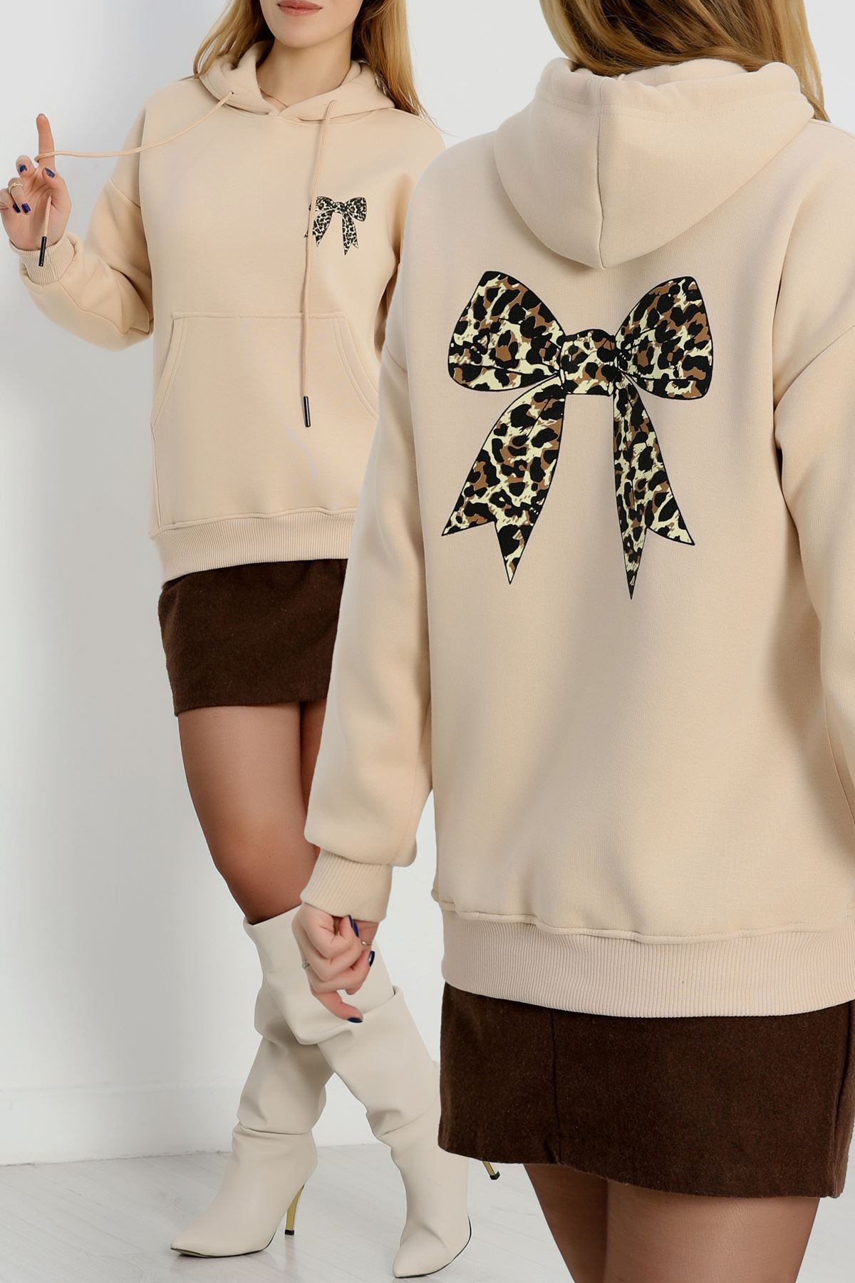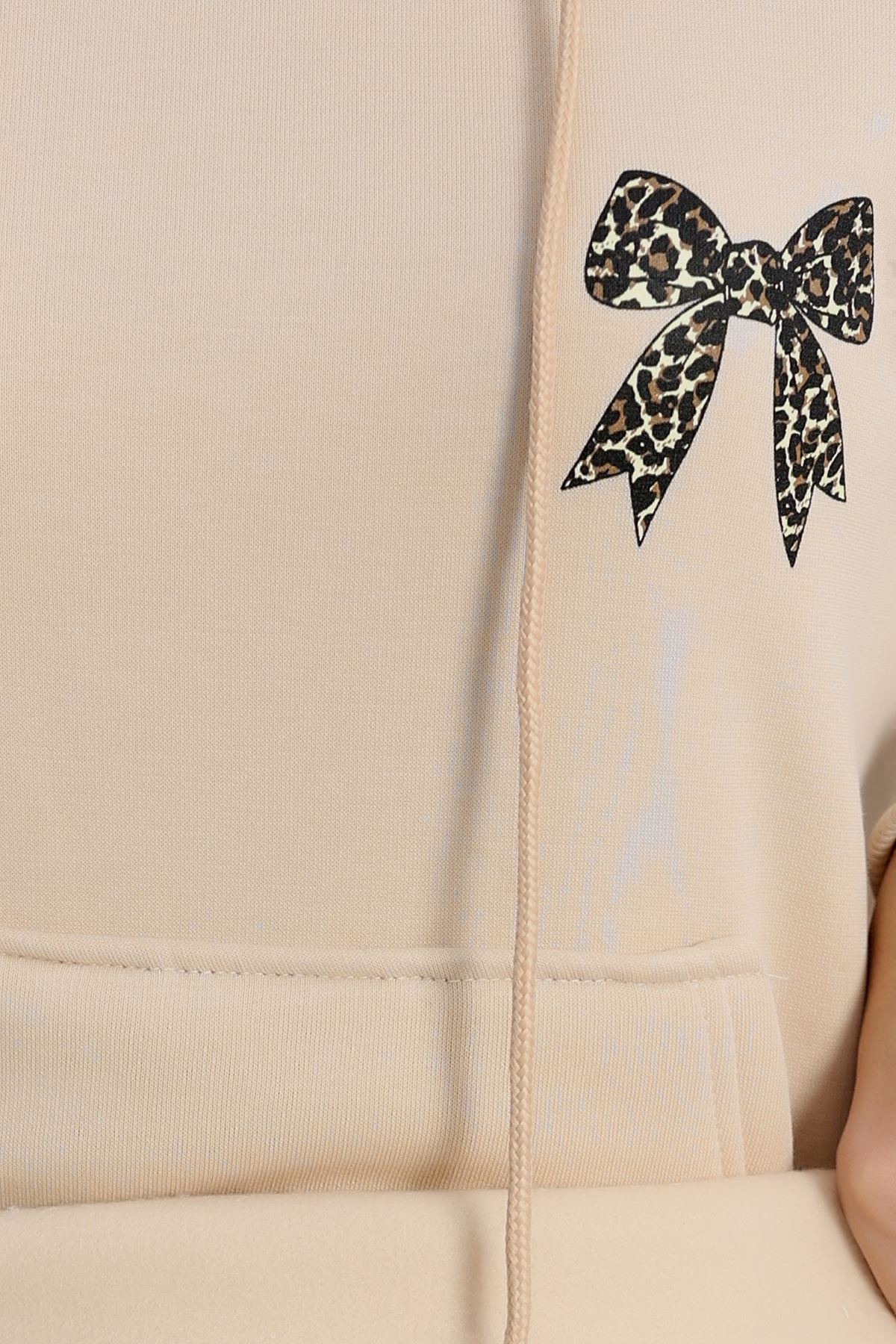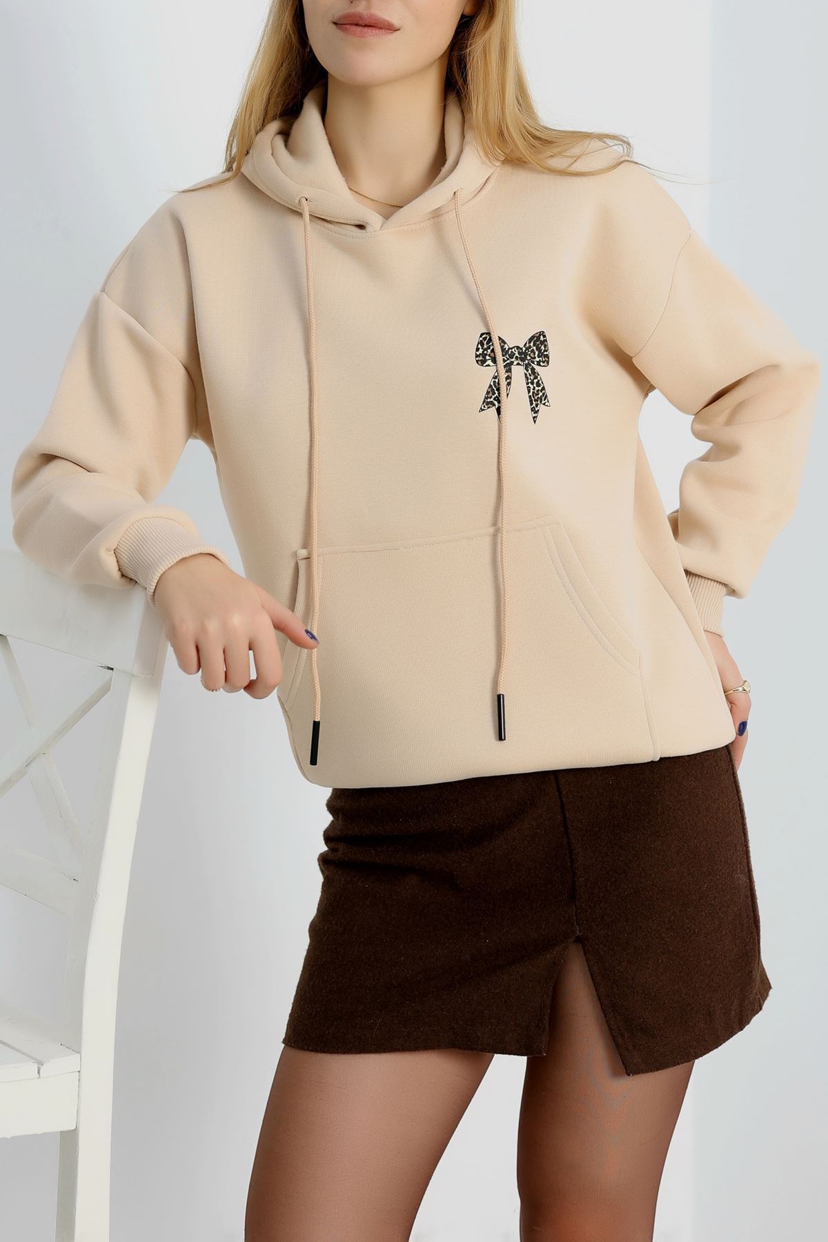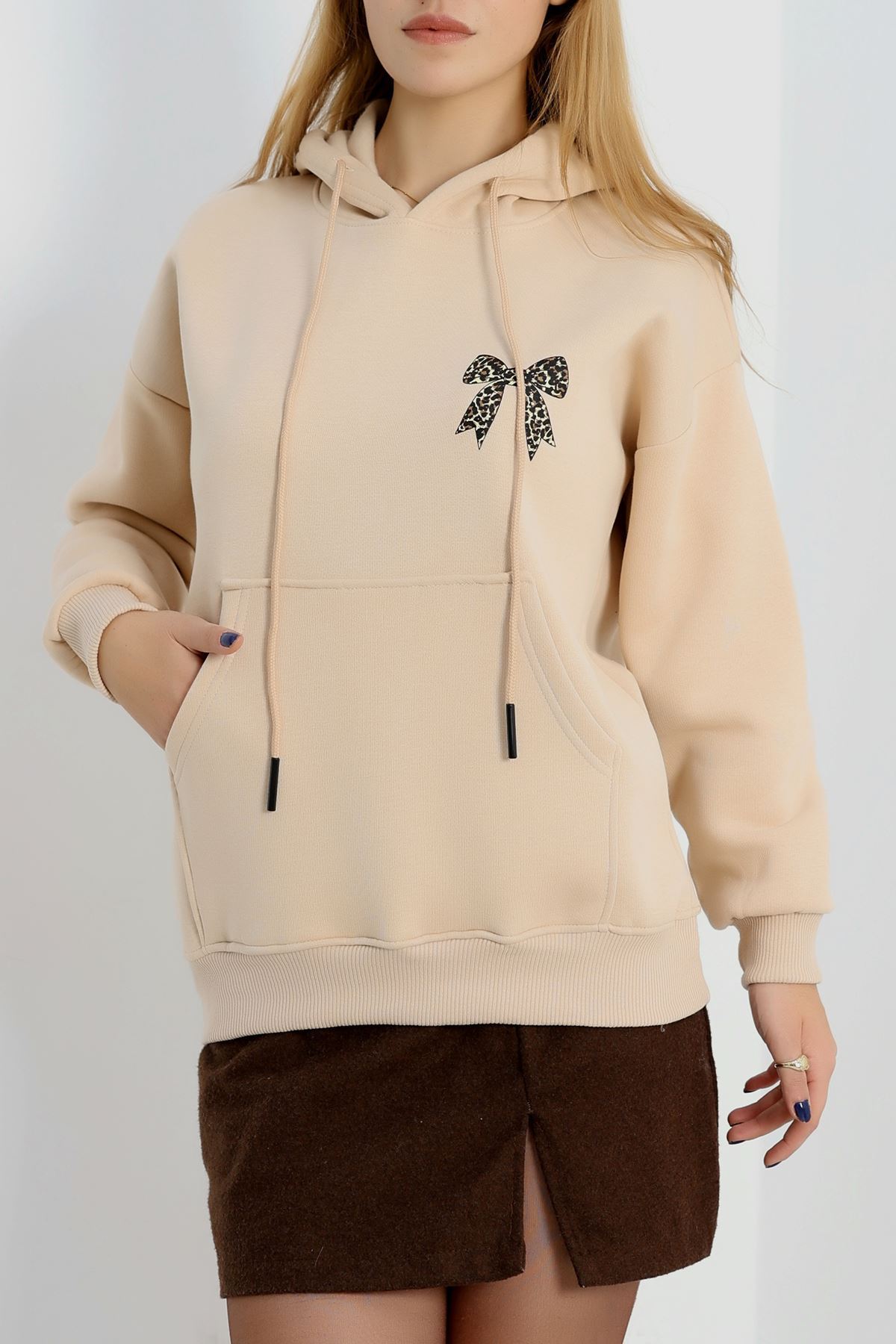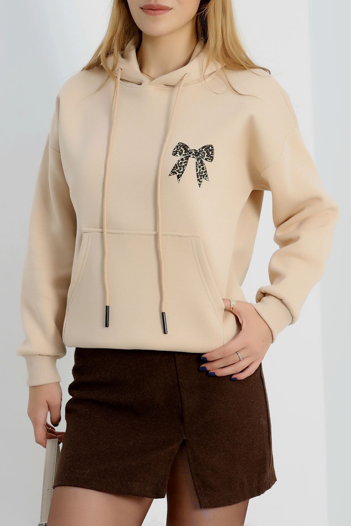 3 İplik Kanguru Cepli Kapşonlu Sweat Bej - 42251.1878.
