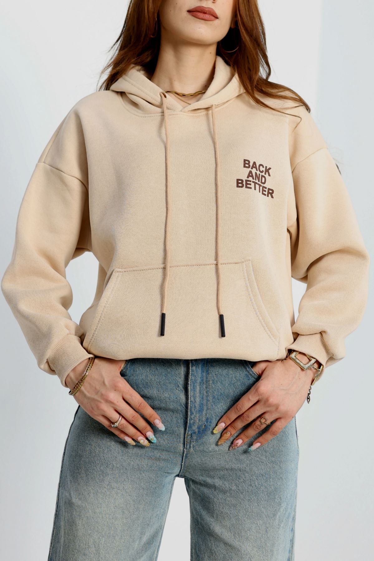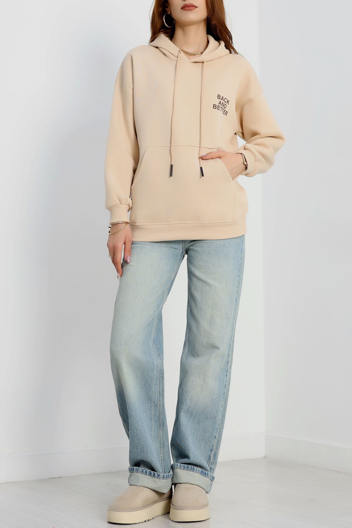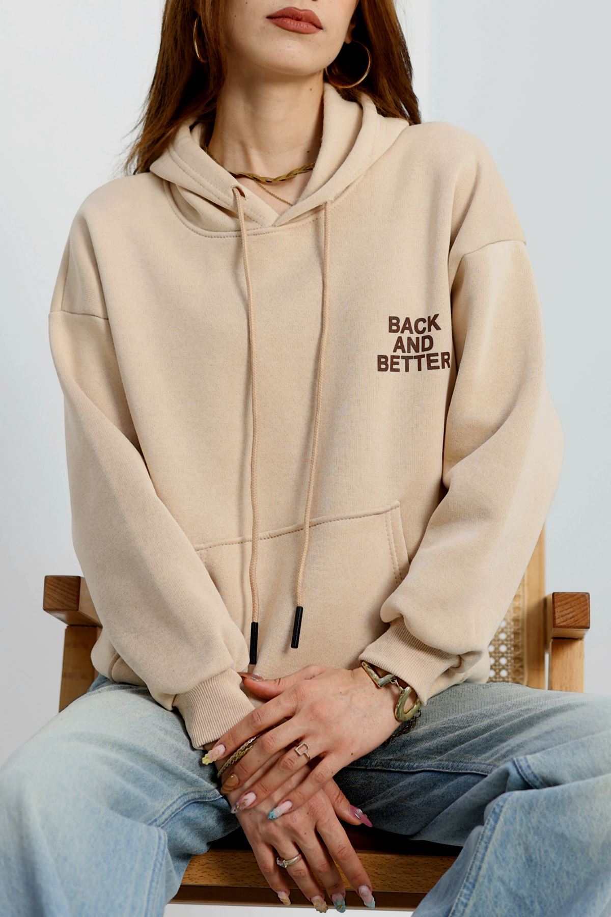 3 İplik Kapşonlu Baskılı Sweat Ekru - 42229.1878.