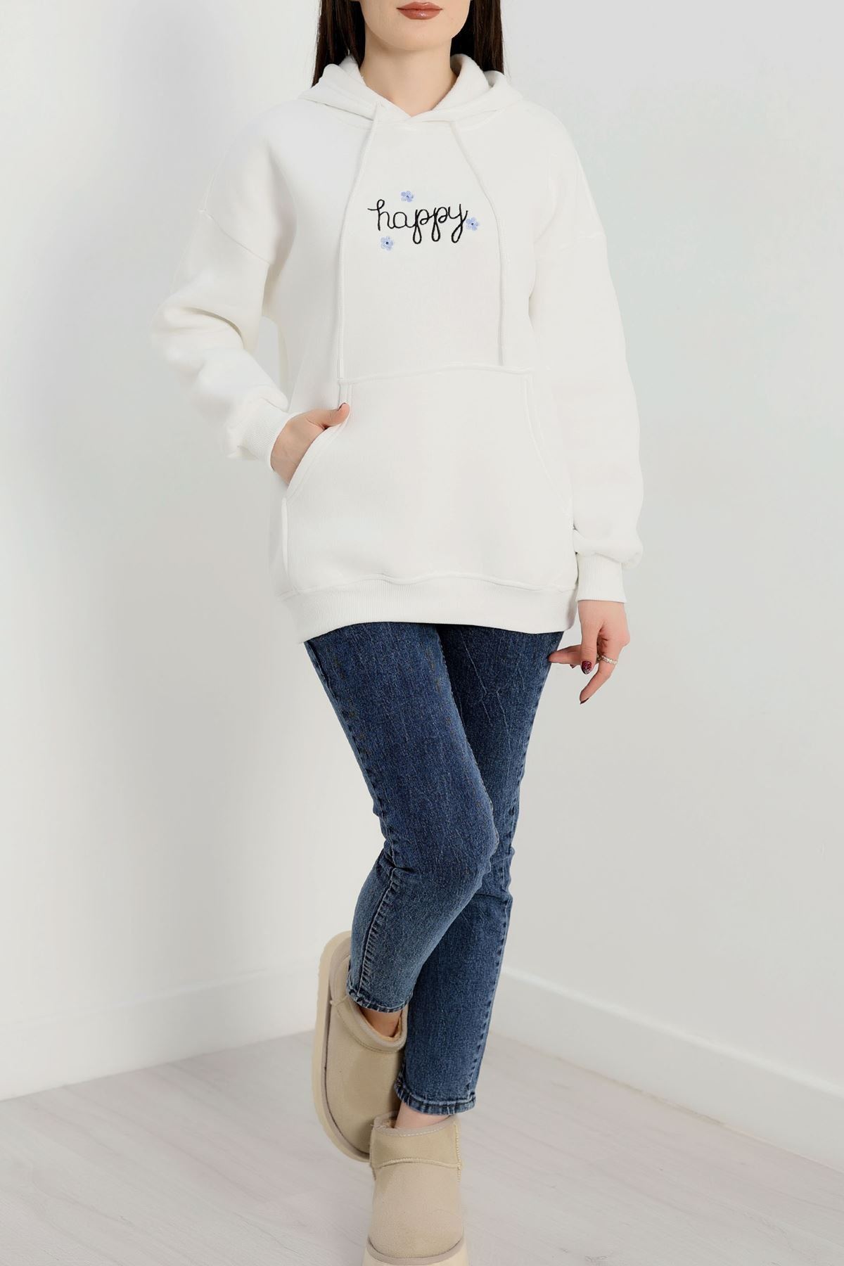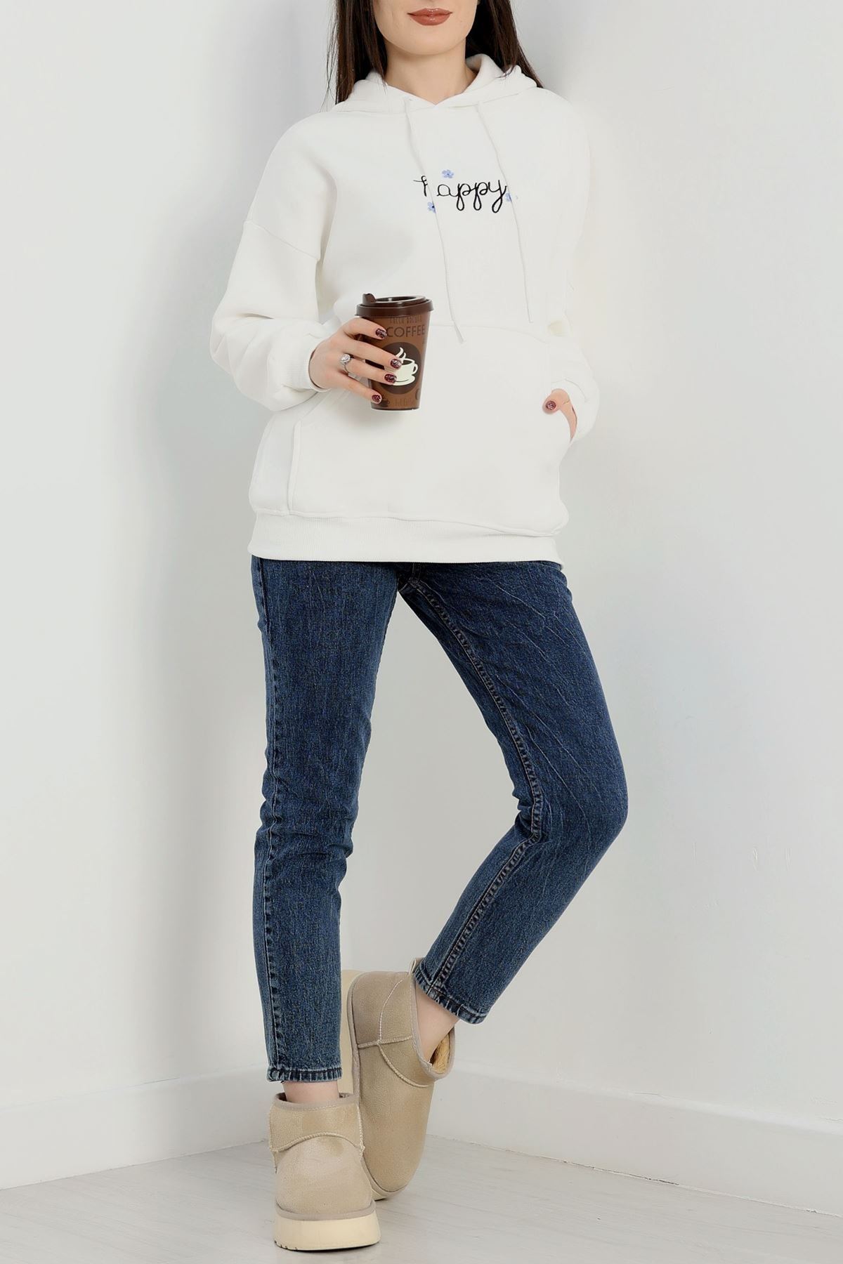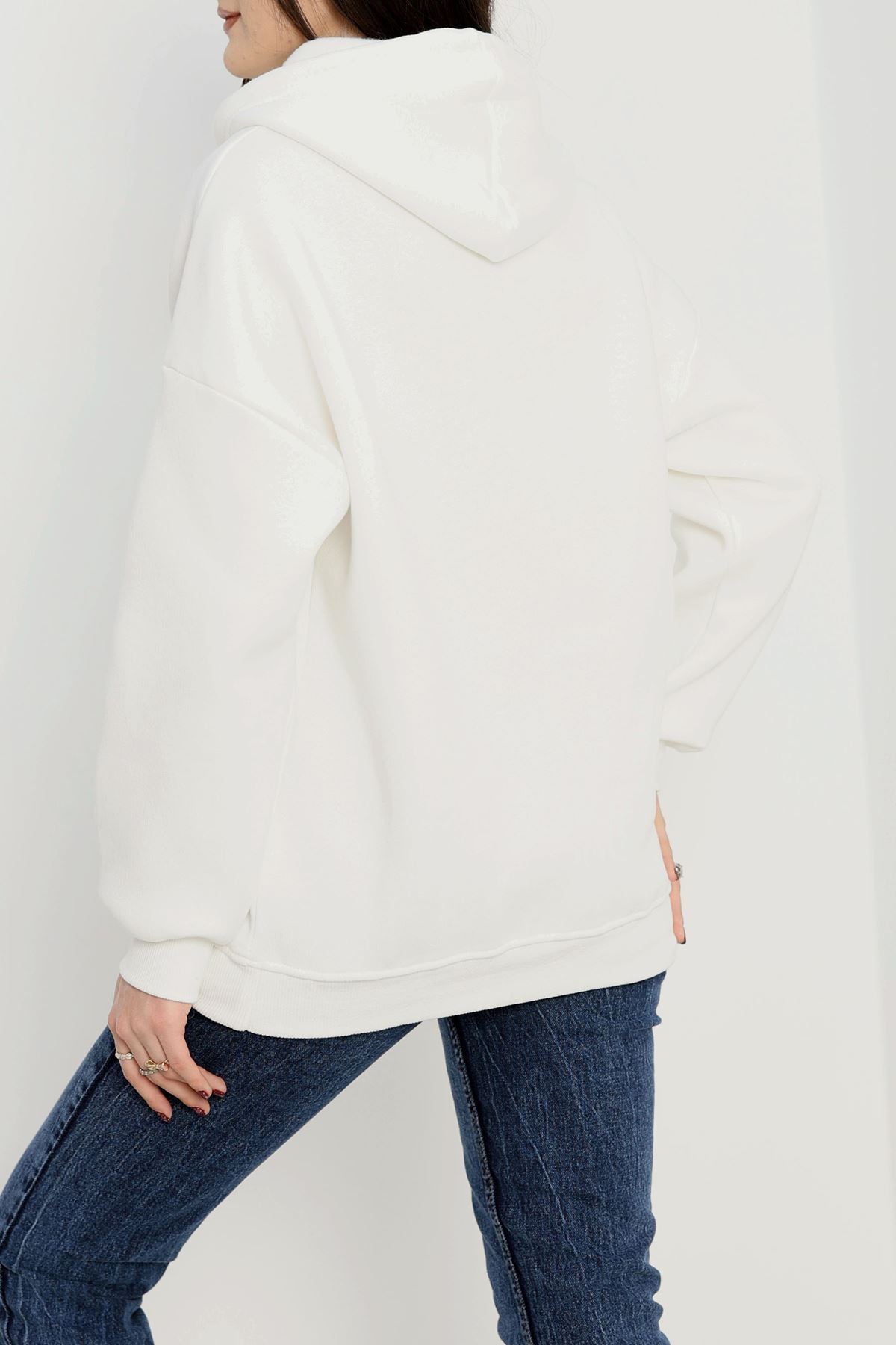 3 İplik Kanguru Cepli Kapşonlu Sweat Beyaz - 42250.1878.