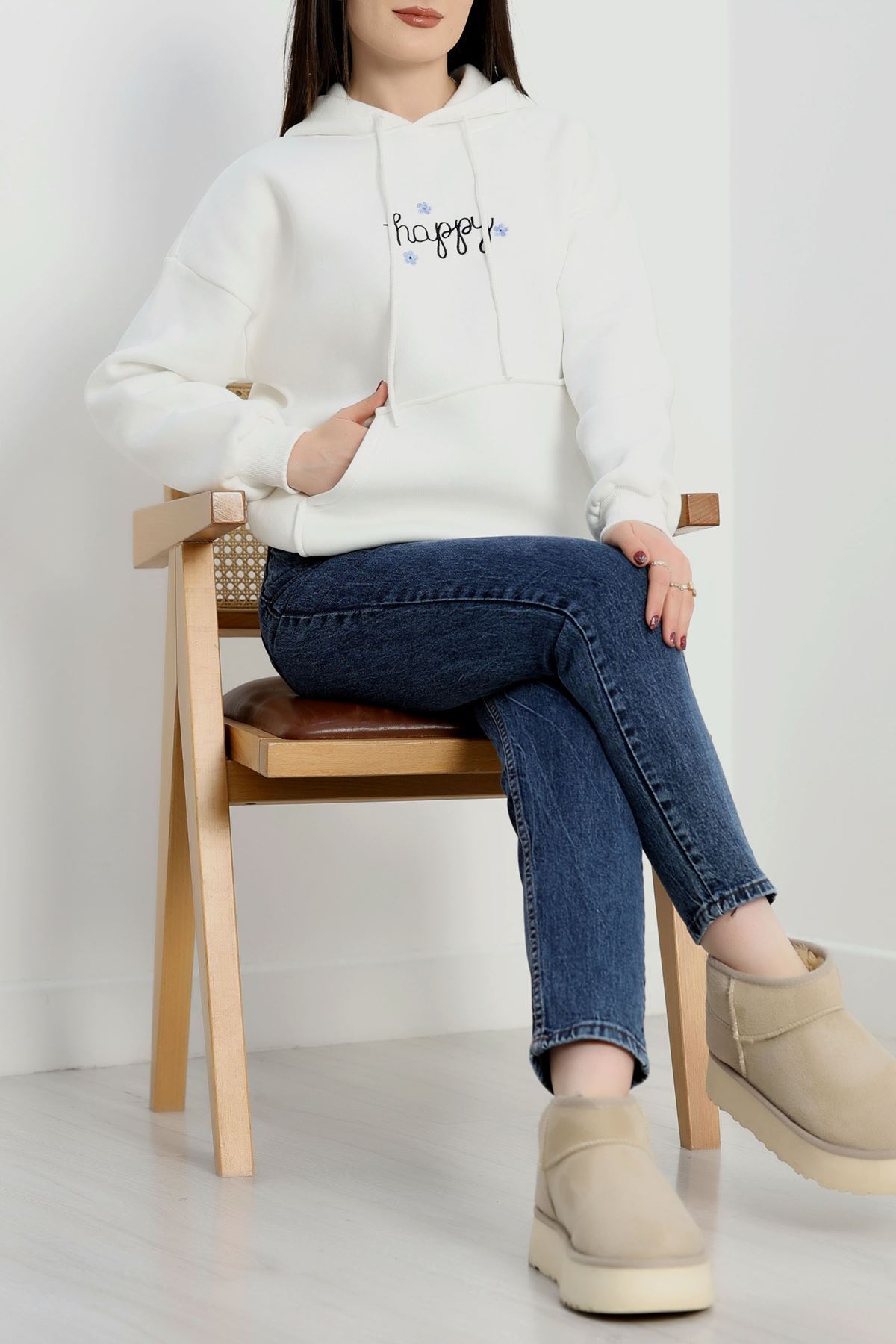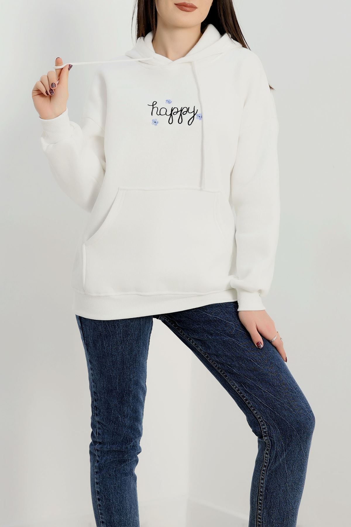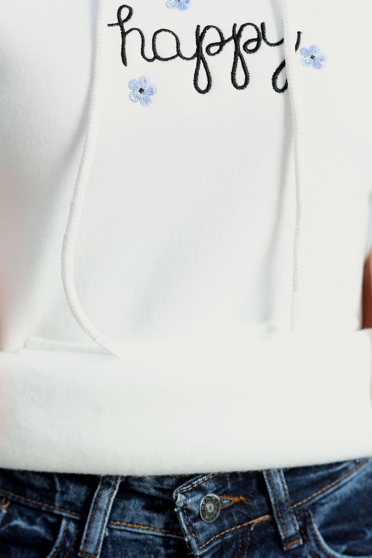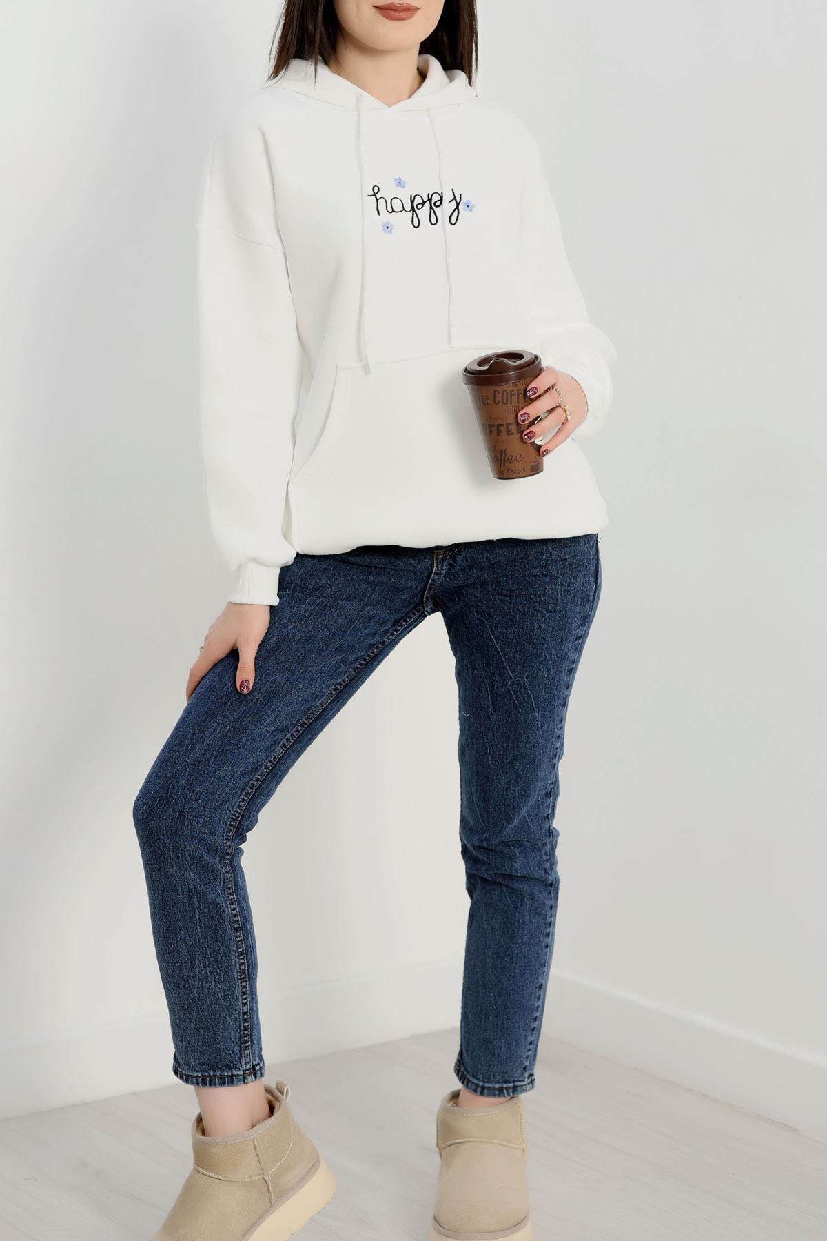 3 İplik Kanguru Cepli Kapşonlu Sweat Beyaz - 42250.1878.