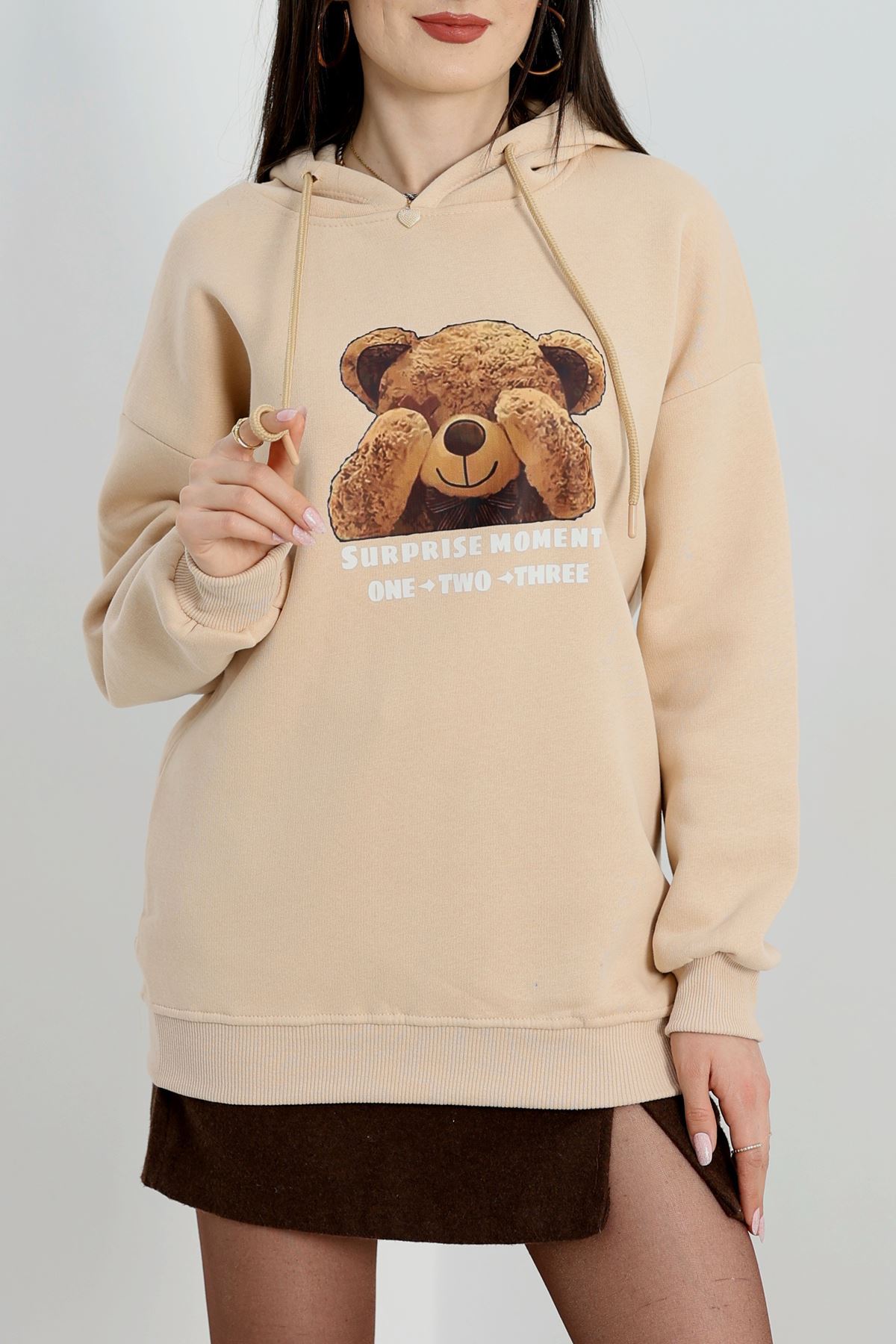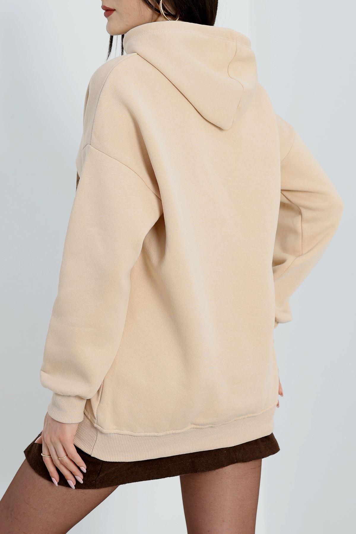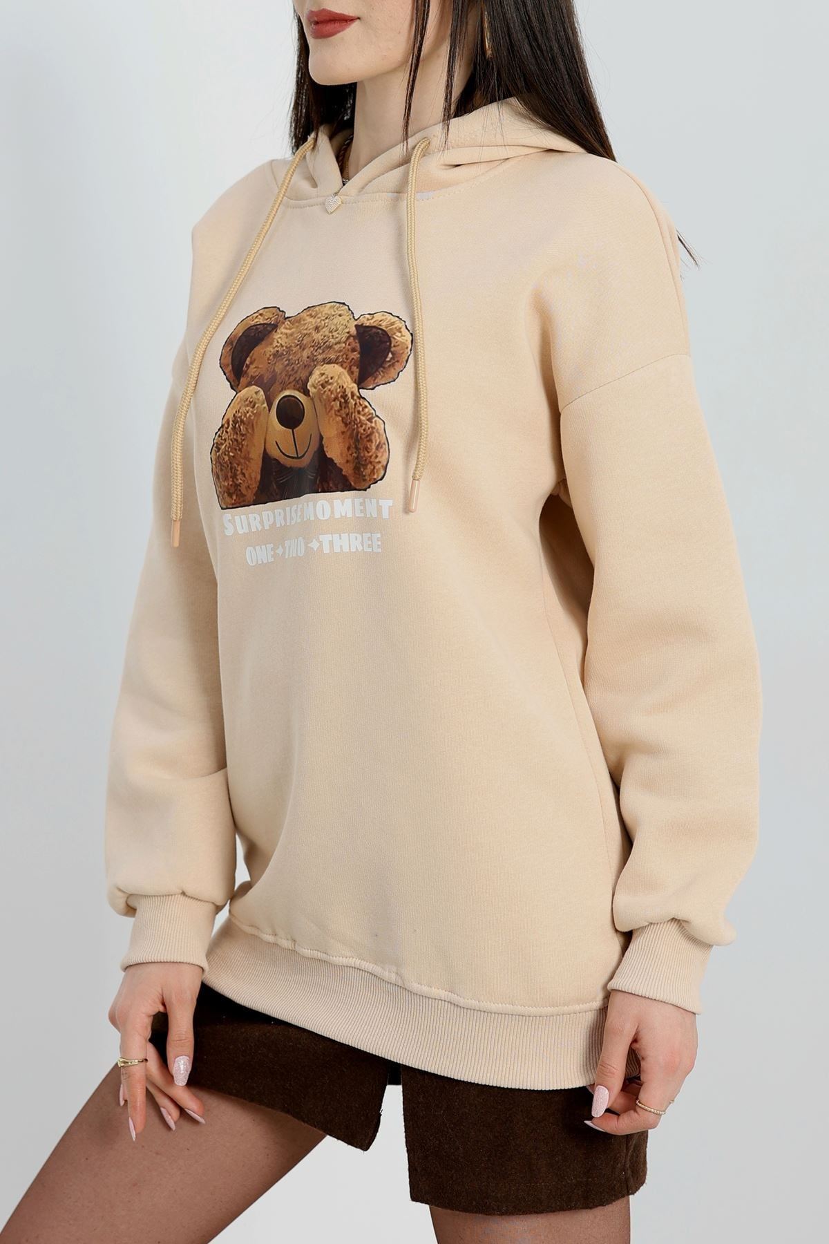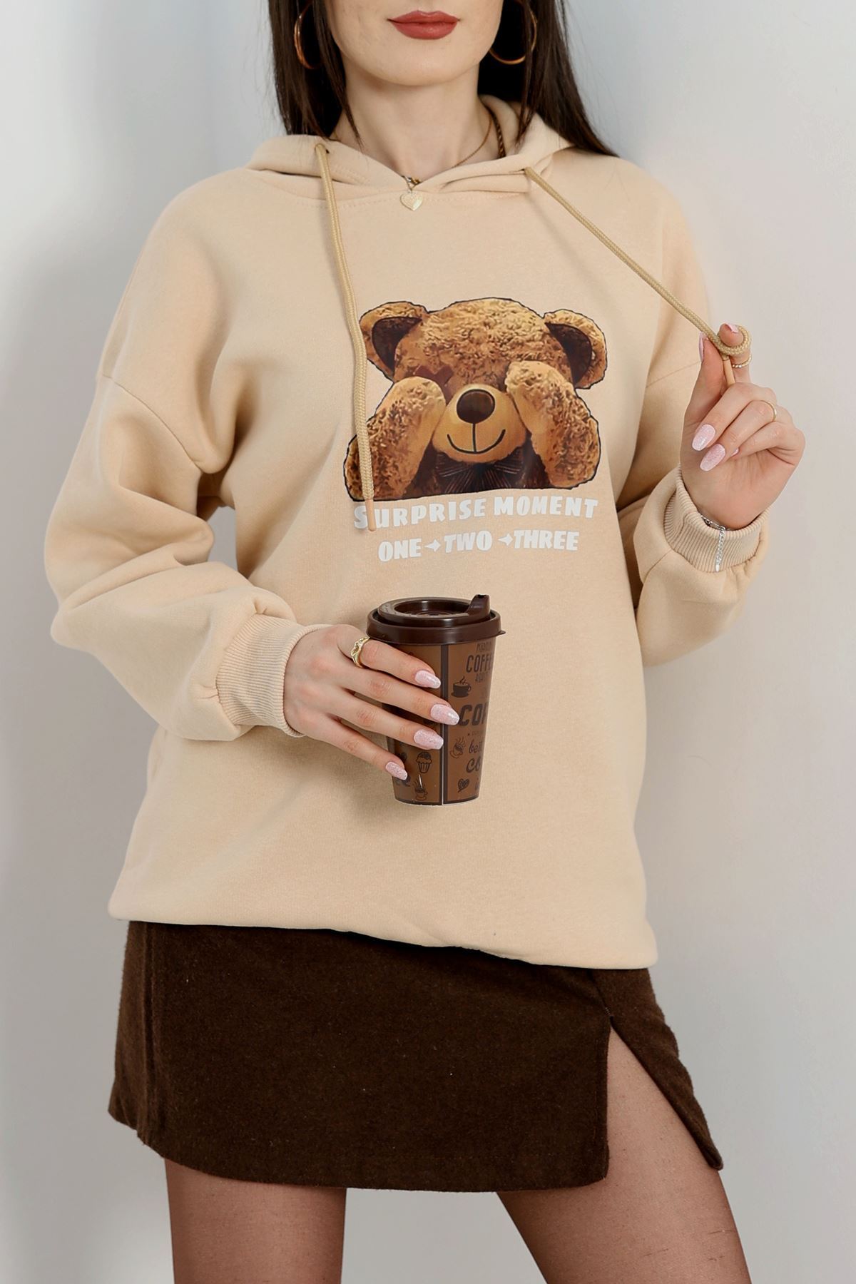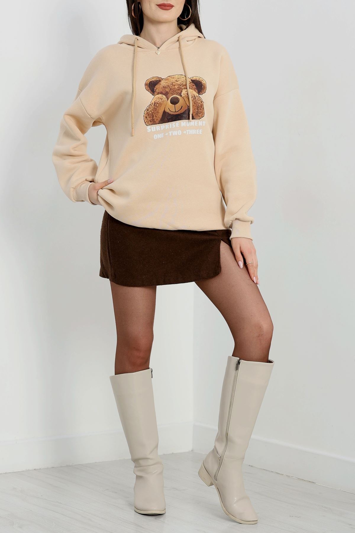 3 İplik Kapşonlu Baskılı Sweat Bej - 42220.1878.