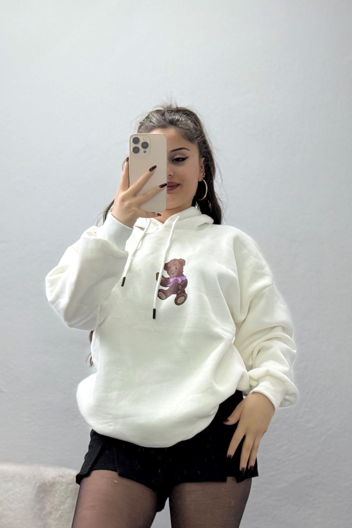 3 İplik Kapşonlu Baskılı Sweat Ekru - 42229.1878.
