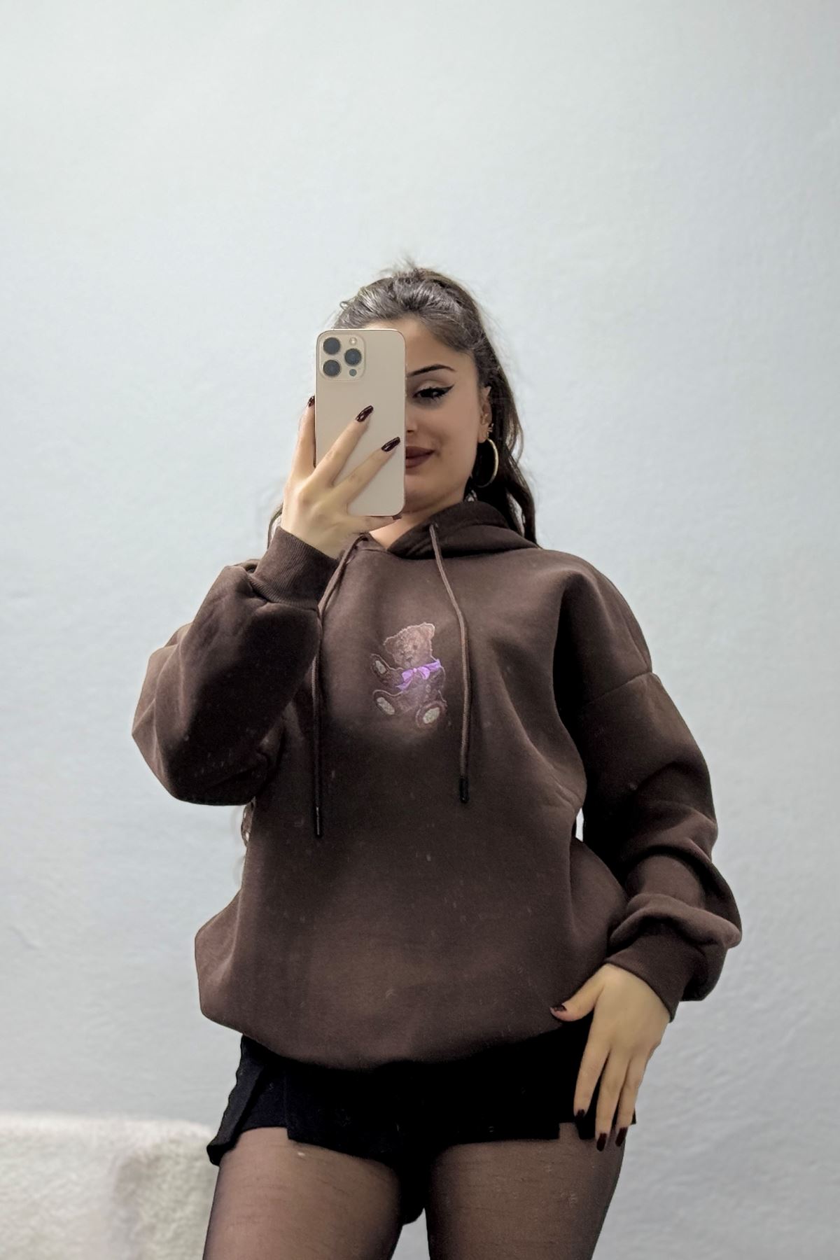 3 İplik Kapşonlu Baskılı Sweat Kahve - 42229.1878.