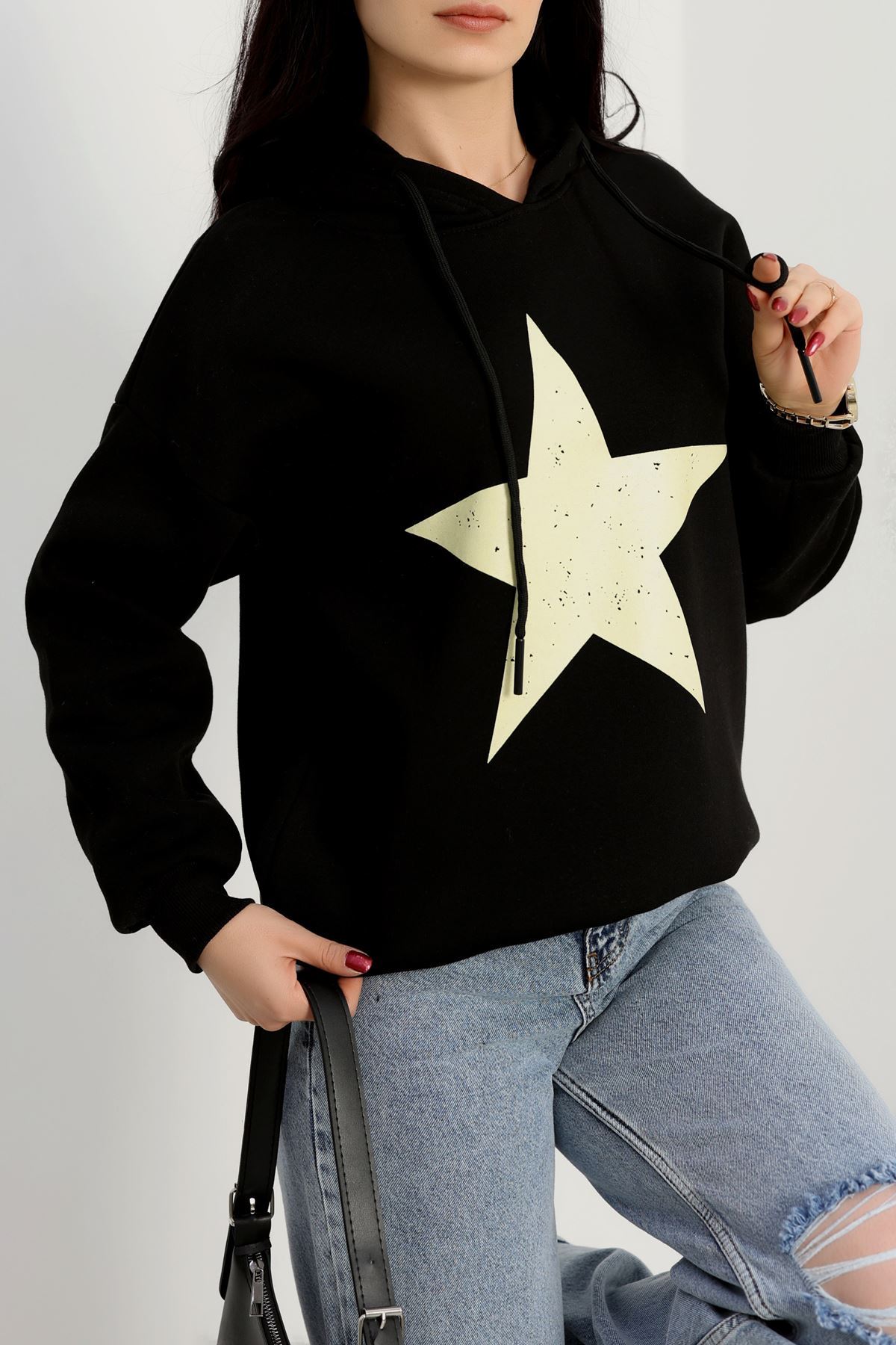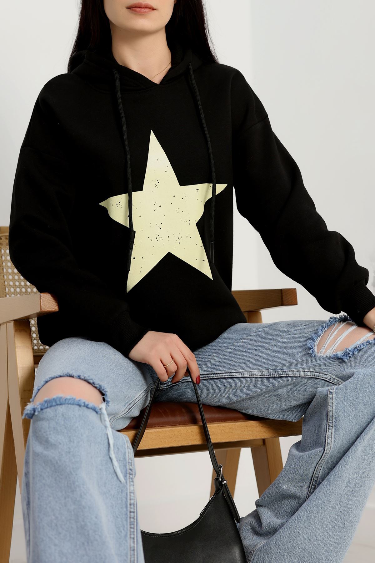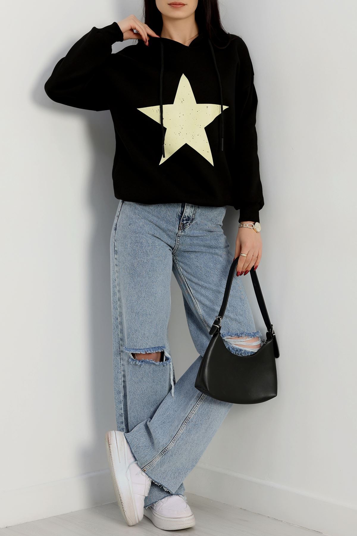 3 İplik Kapşonlu Baskılı Sweat Siyahbej - 42225.1878.