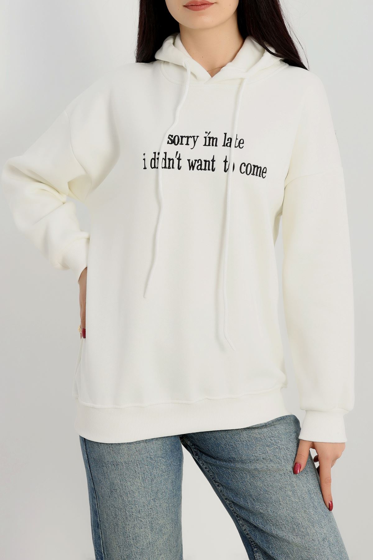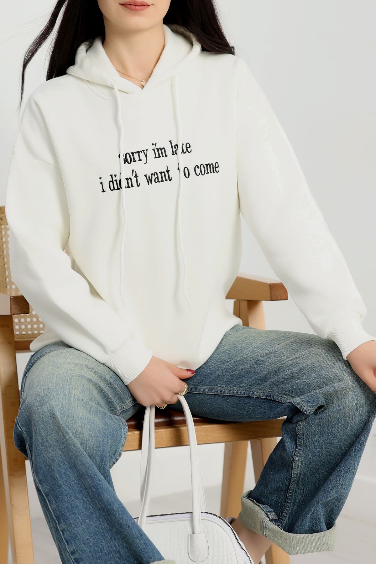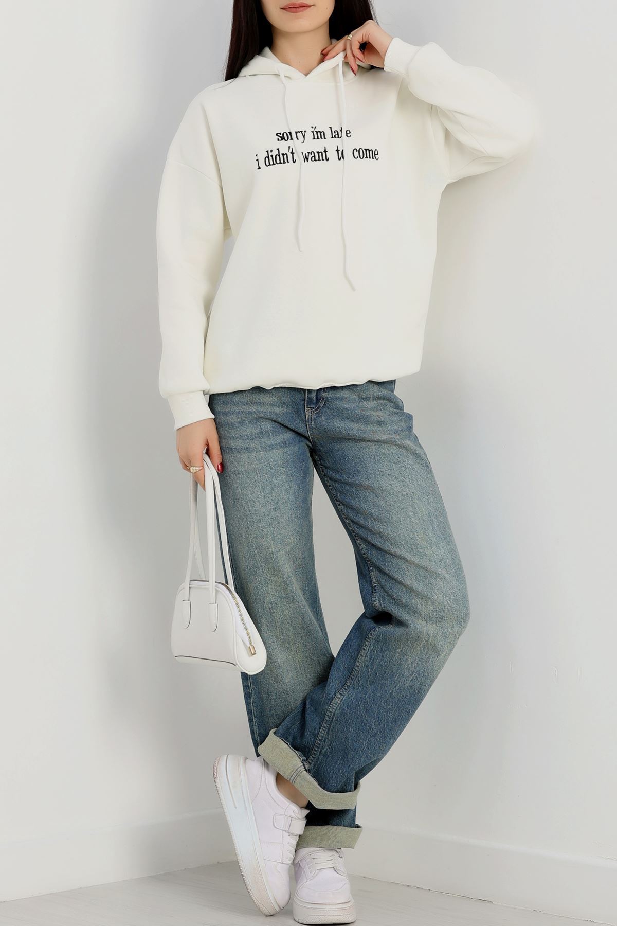 3 İplik Kapşonlu Baskılı Sweat Ekru - 42222.1878.