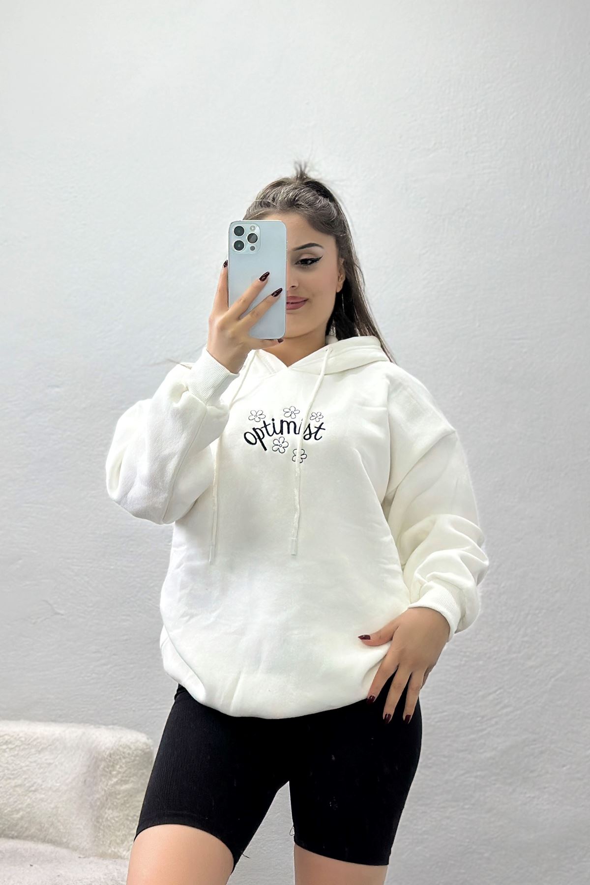 3 İplik Kapşonlu Nakışlı Sweat Ekrusiyah - 42230.1878.
