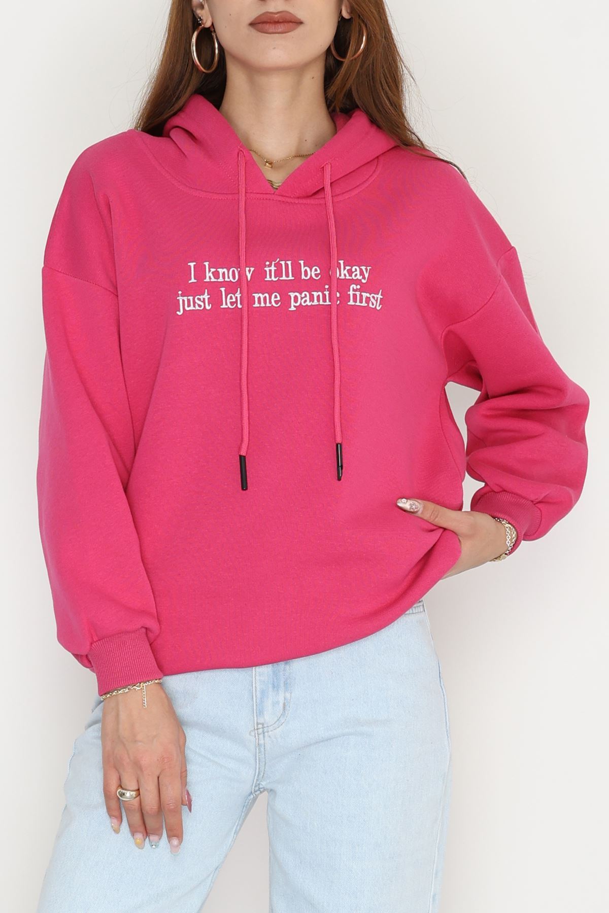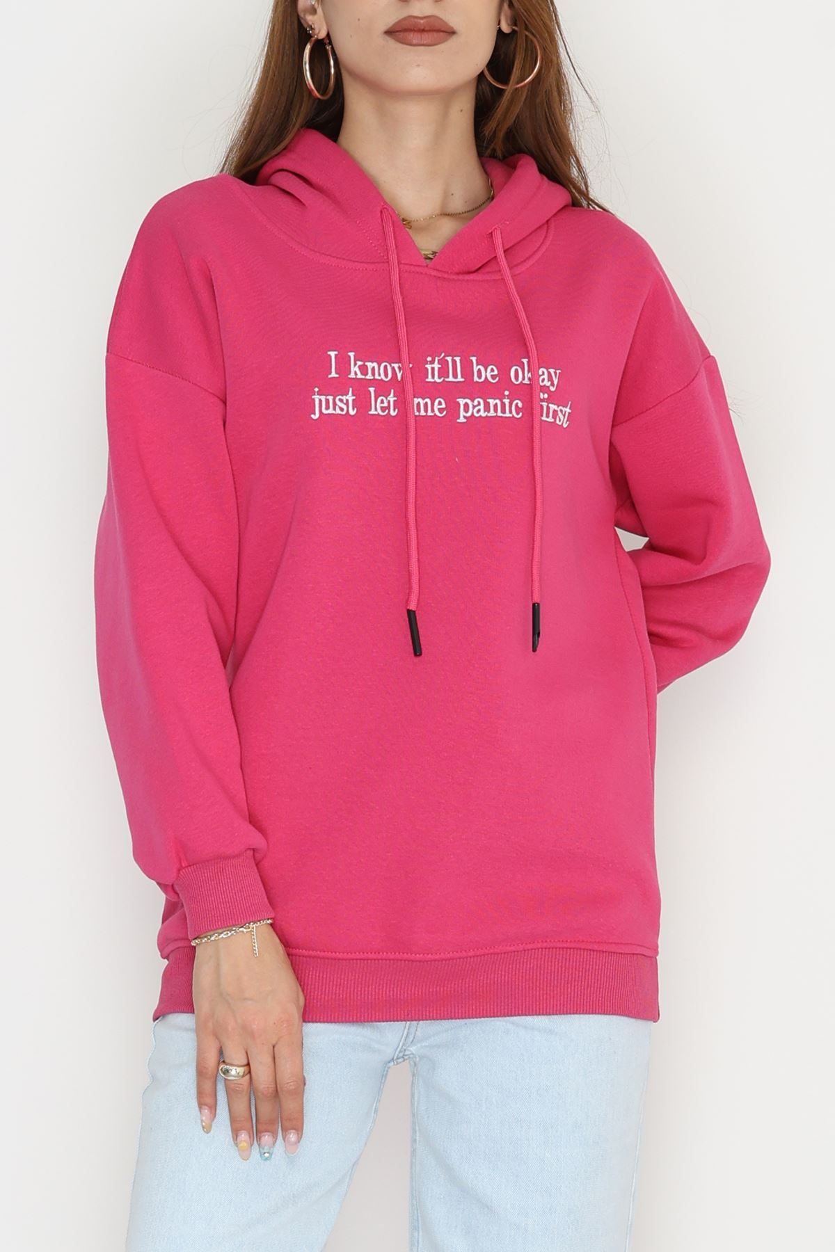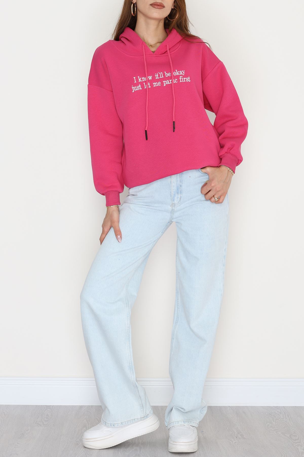 3 İplik Kapşonlu Nakışlı Sweat Fuşyabeyaz - 42231.1878.