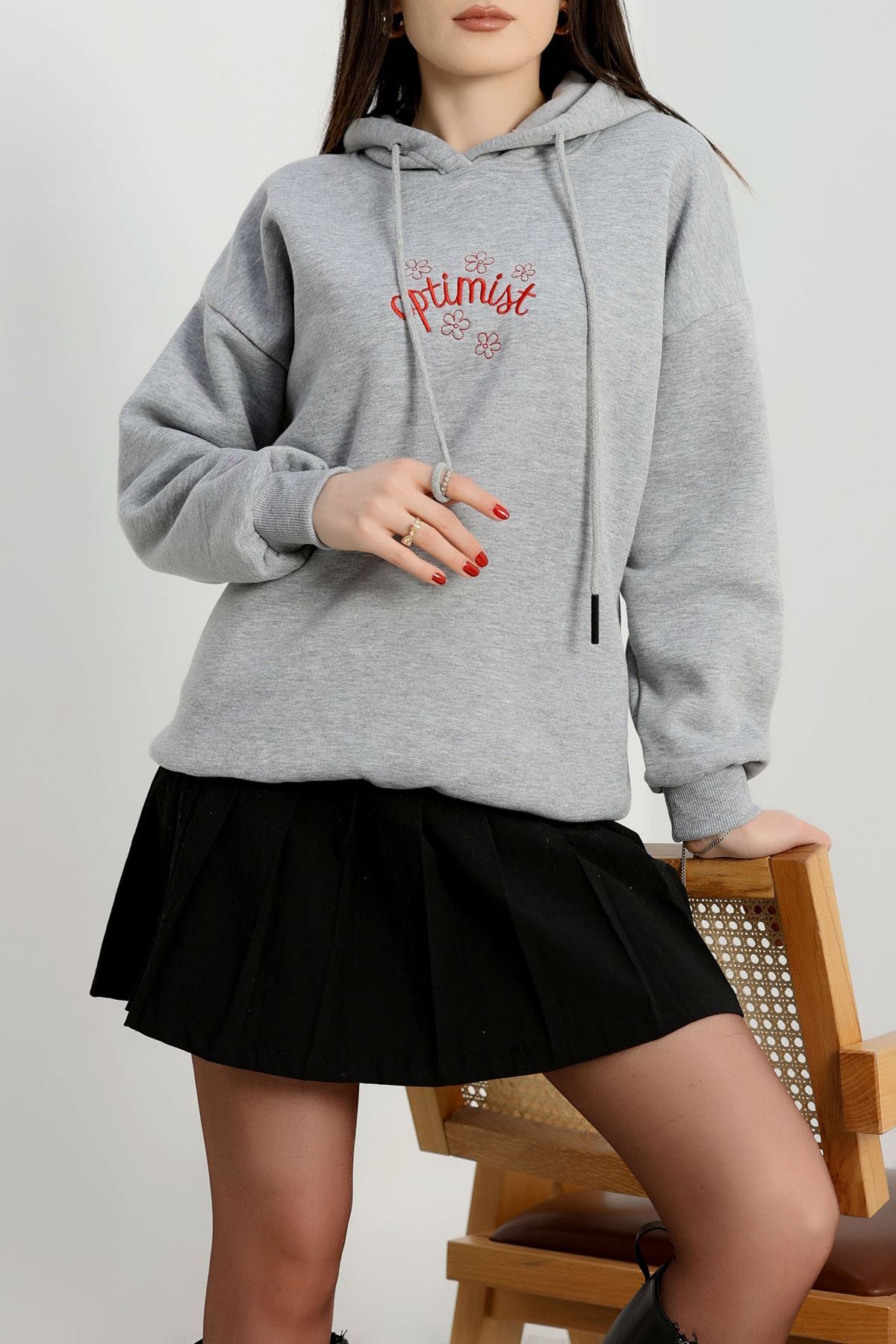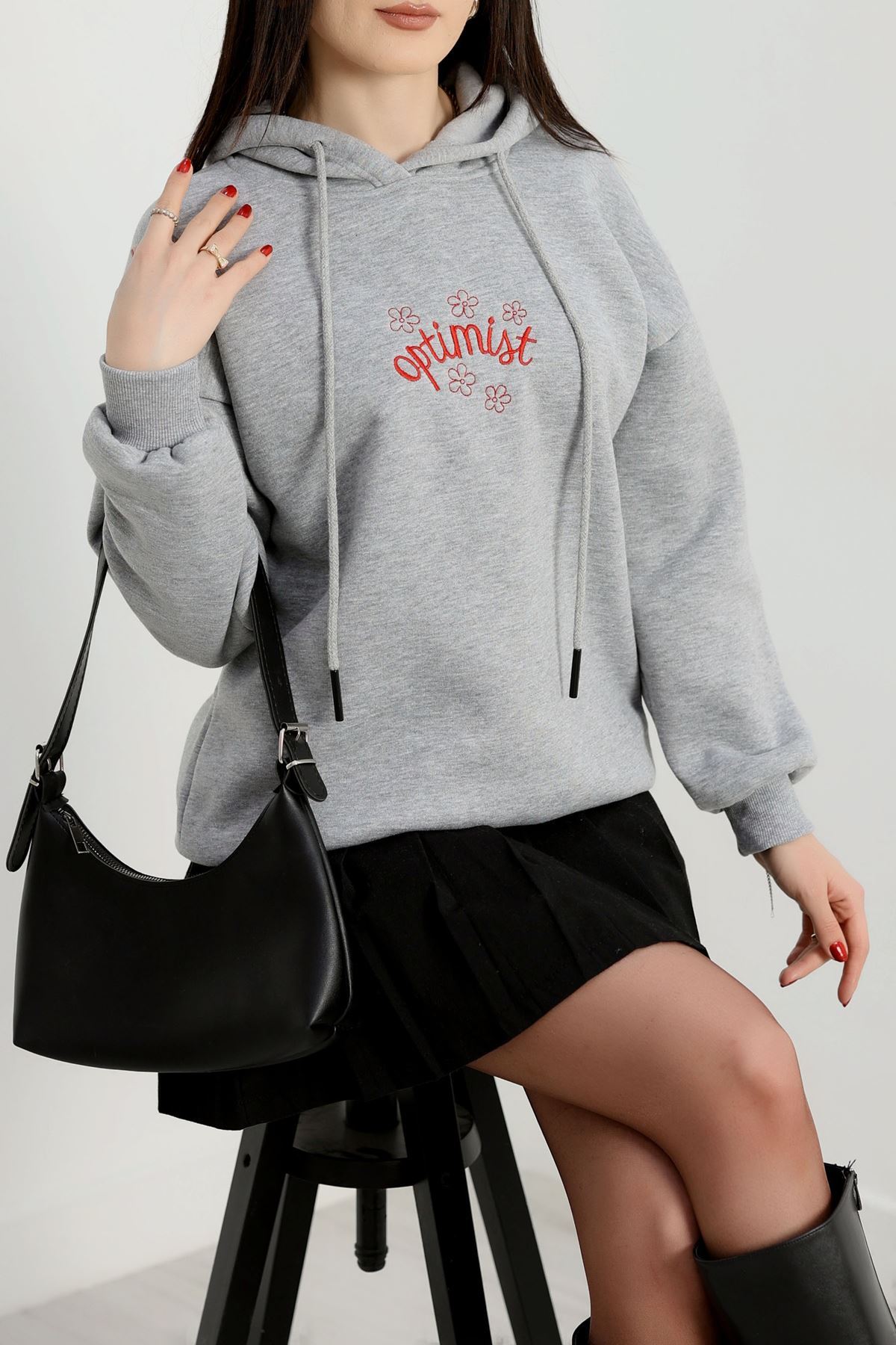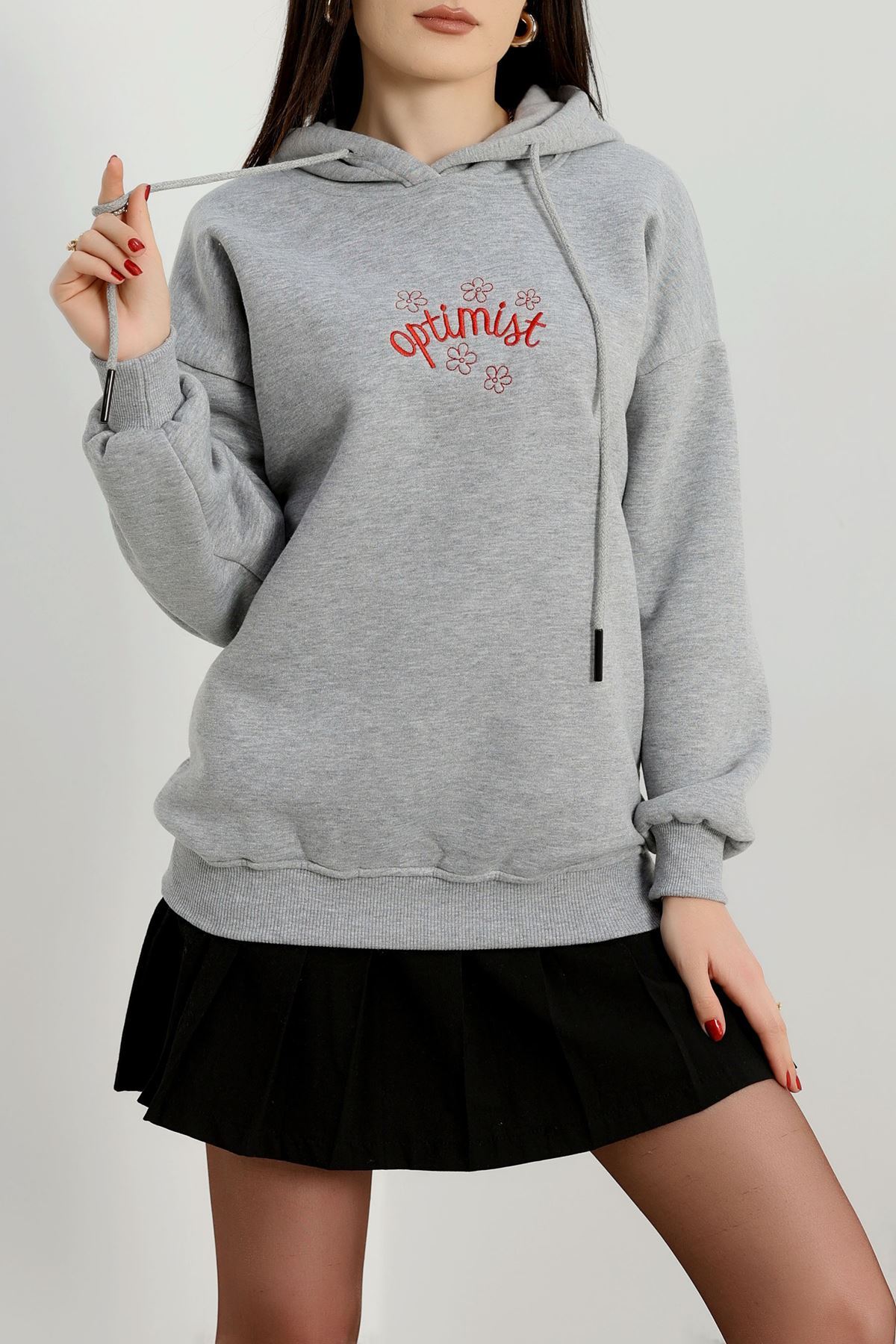 3 İplik Kapşonlu Nakışlı Sweat Grikırmızı - 42230.1878.