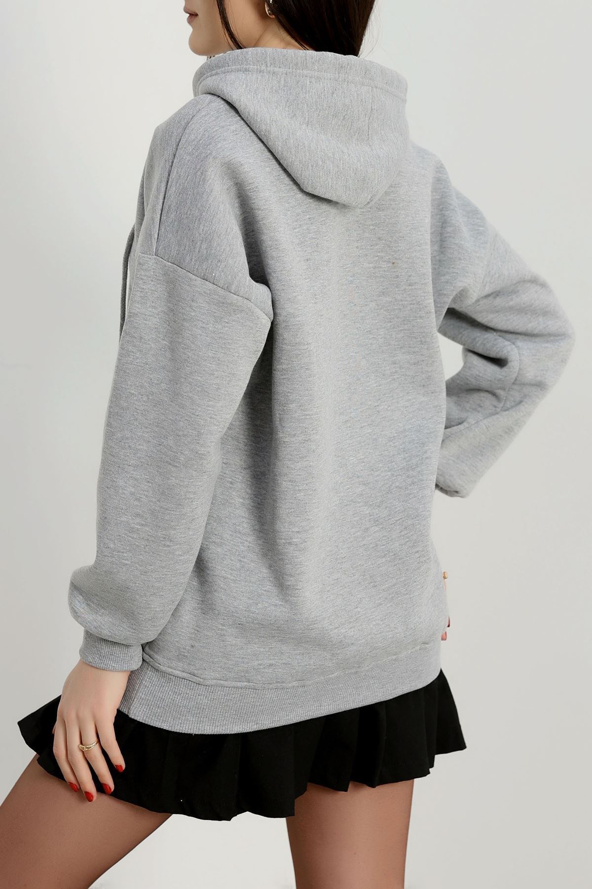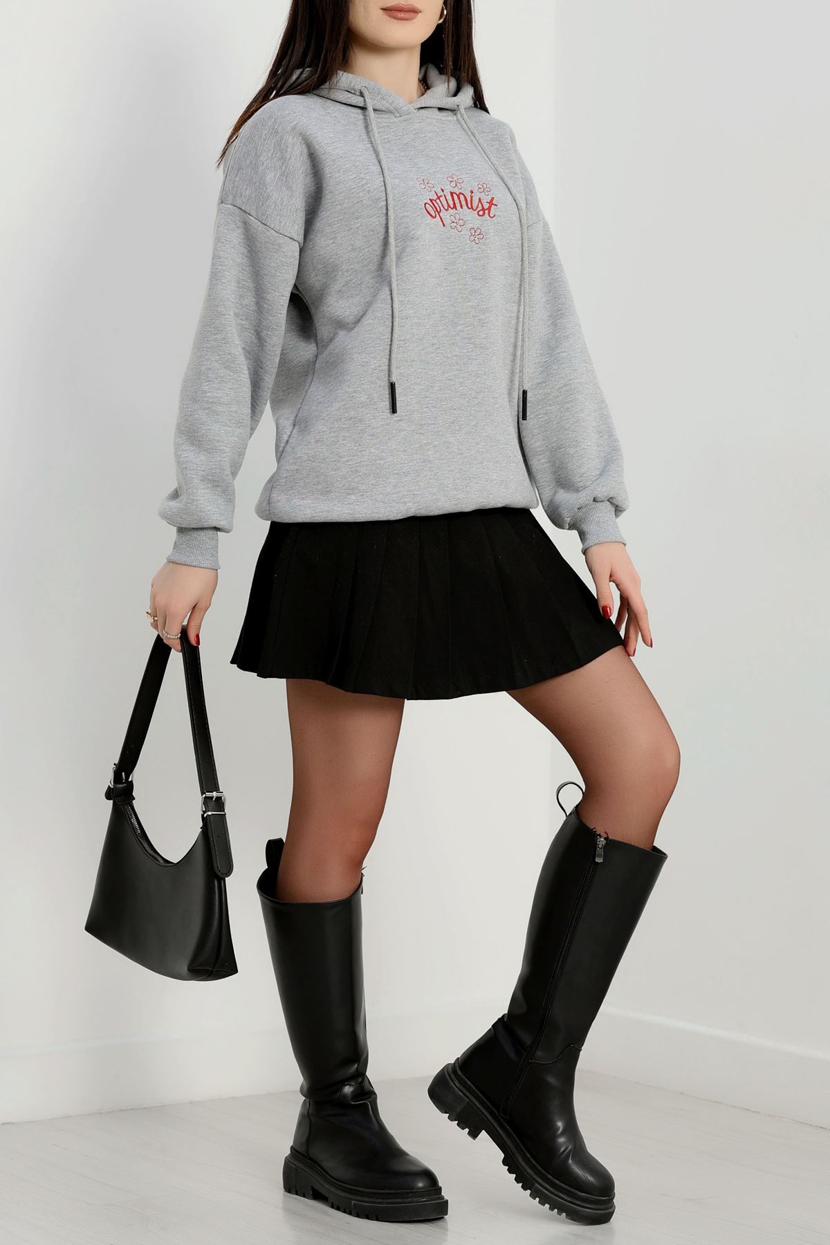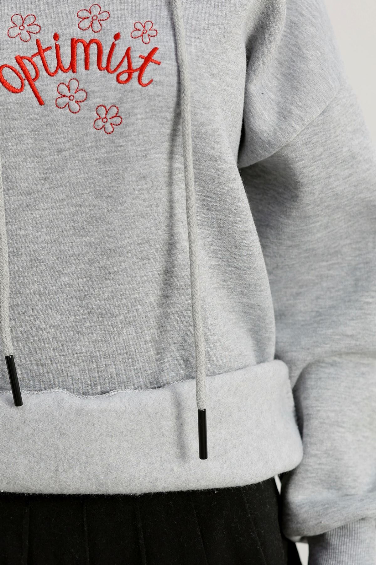 3 İplik Kapşonlu Nakışlı Sweat Grikırmızı - 42230.1878.