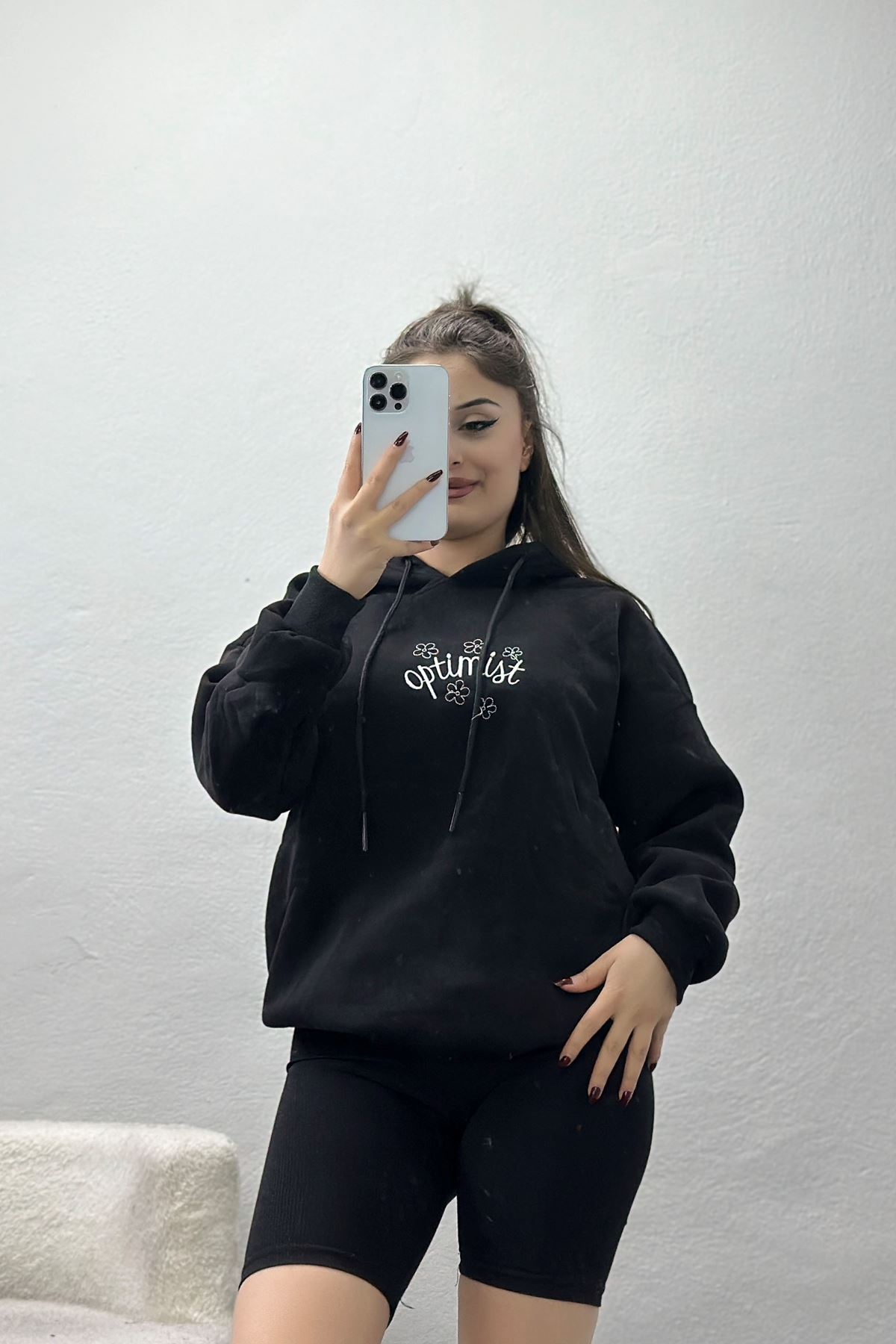 3 İplik Kapşonlu Nakışlı Sweat Siyahbeyaz - 42230.1878.