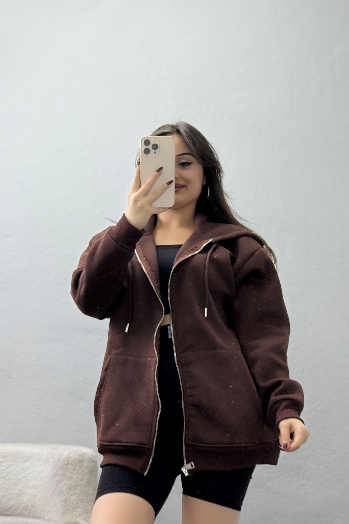 3 İplik Şardonlu Fermuarlı Kapşonlu Sweat Kahve - 52070.2113.