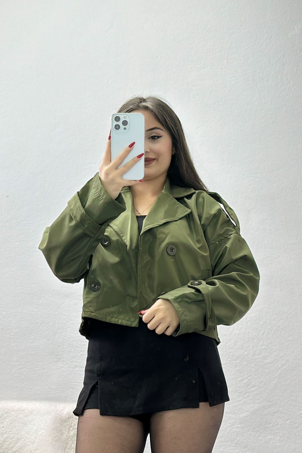 Astarlı Çift Düğmeli Kısa Trençkot Haki - 90863.147.