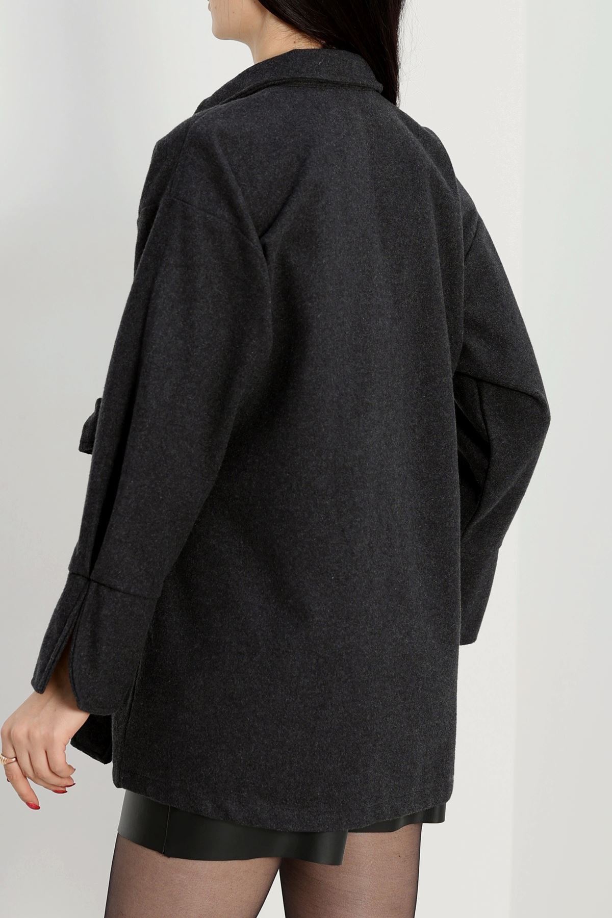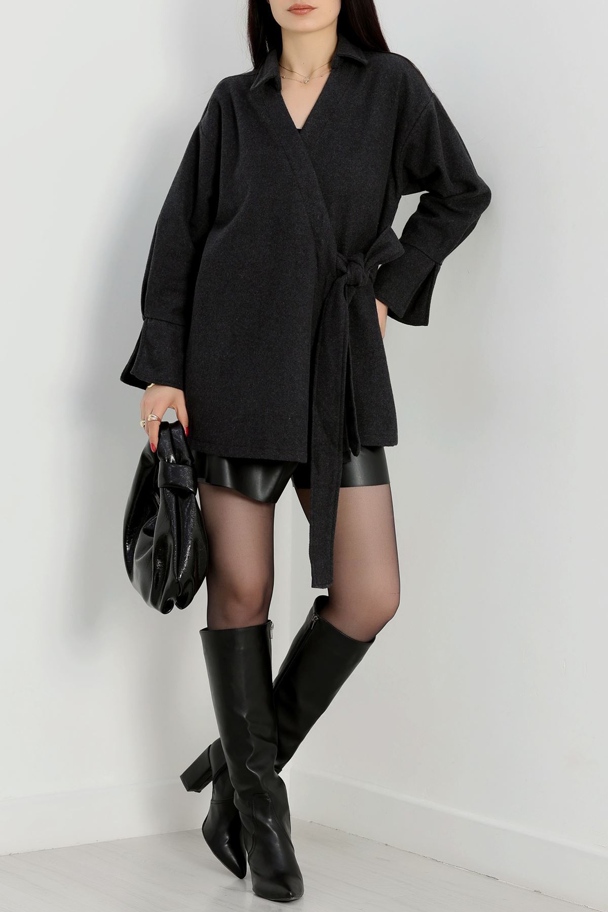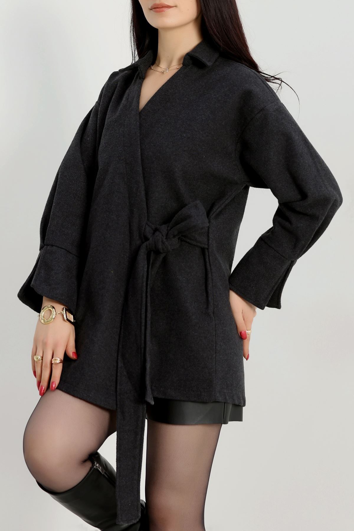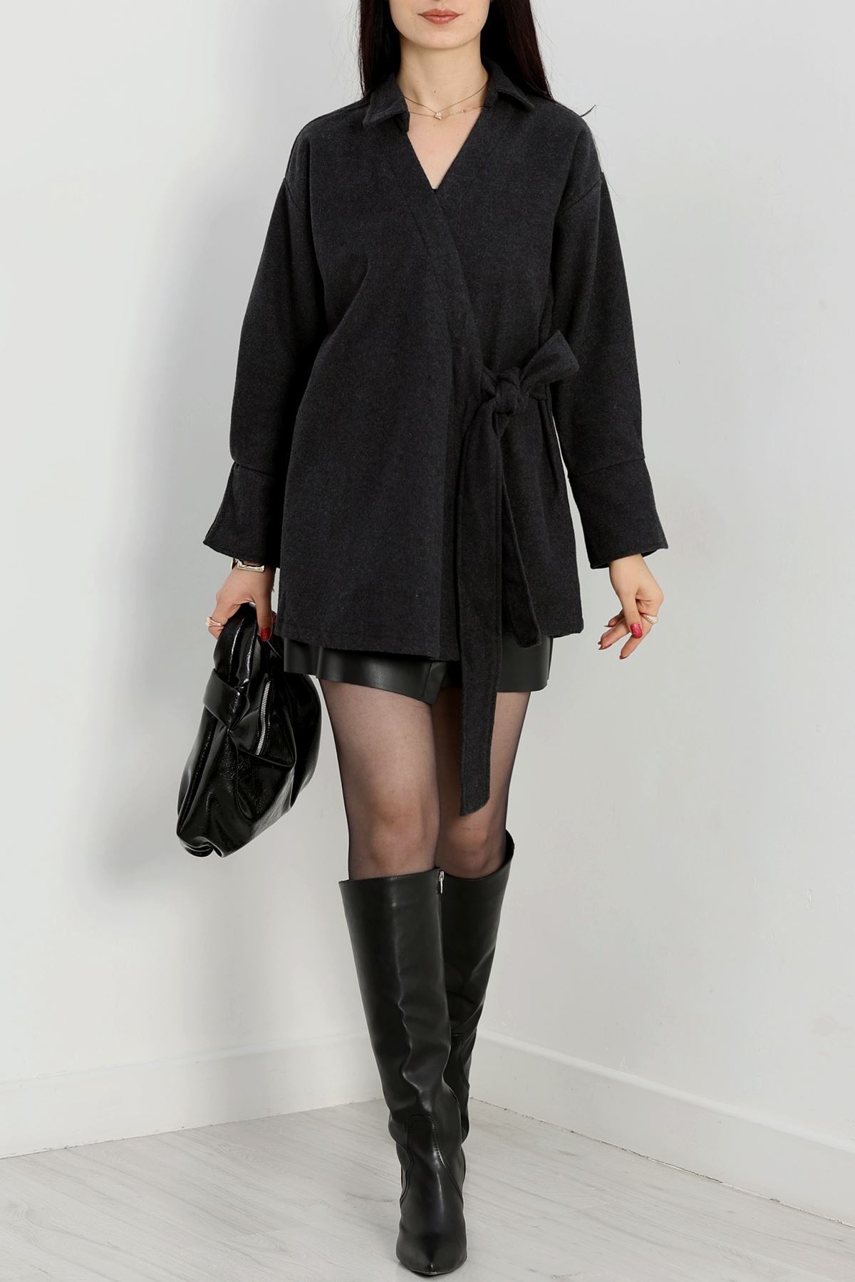 Bağlamalı Kruvaze Yaka Kaşe Ceket Füme - 70993.1775.