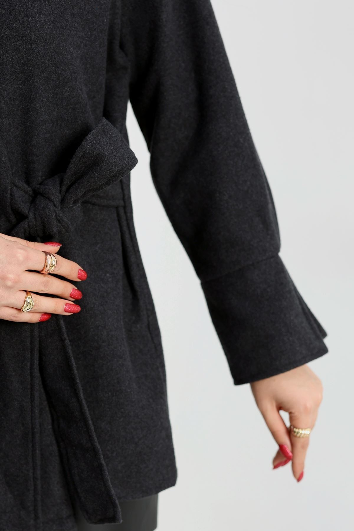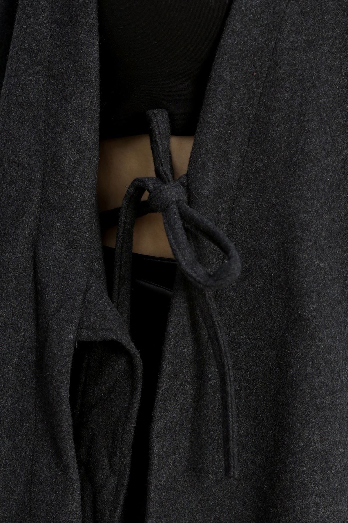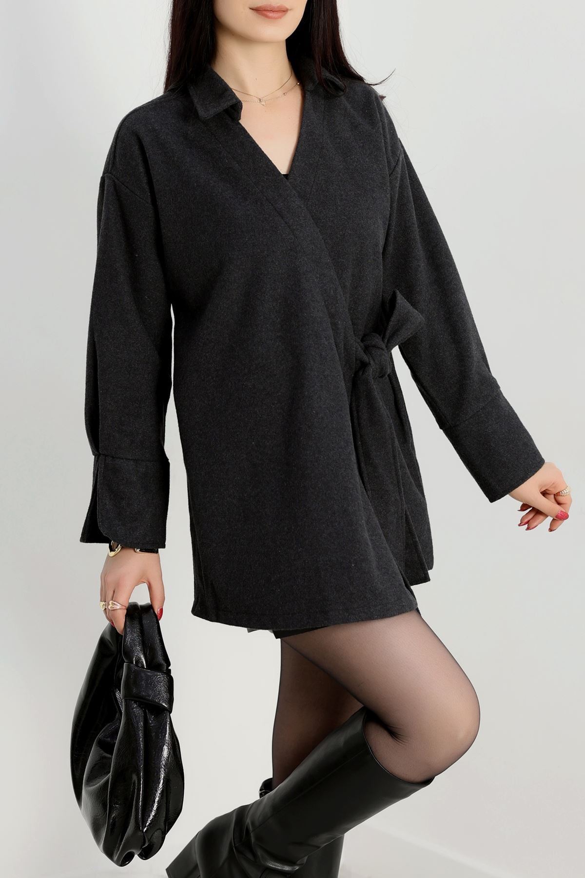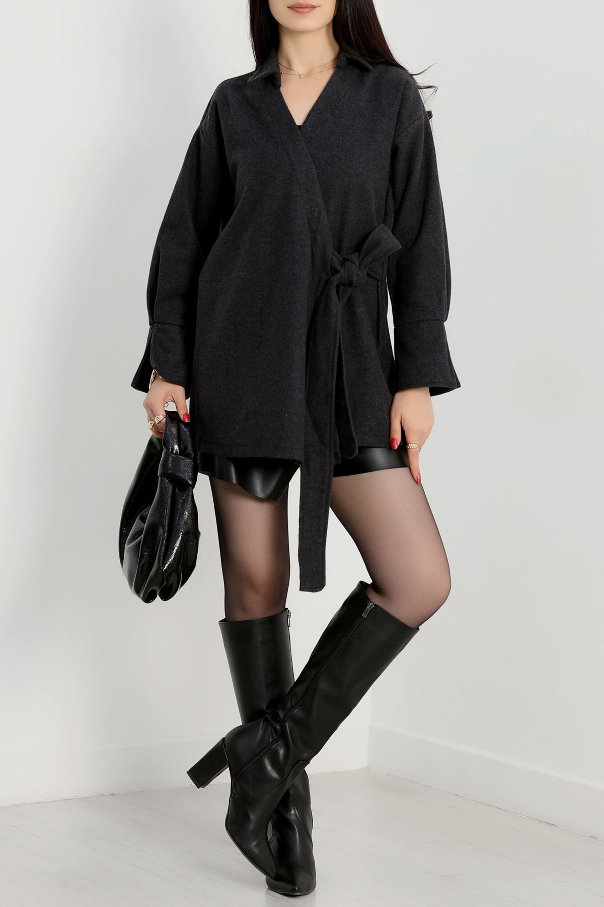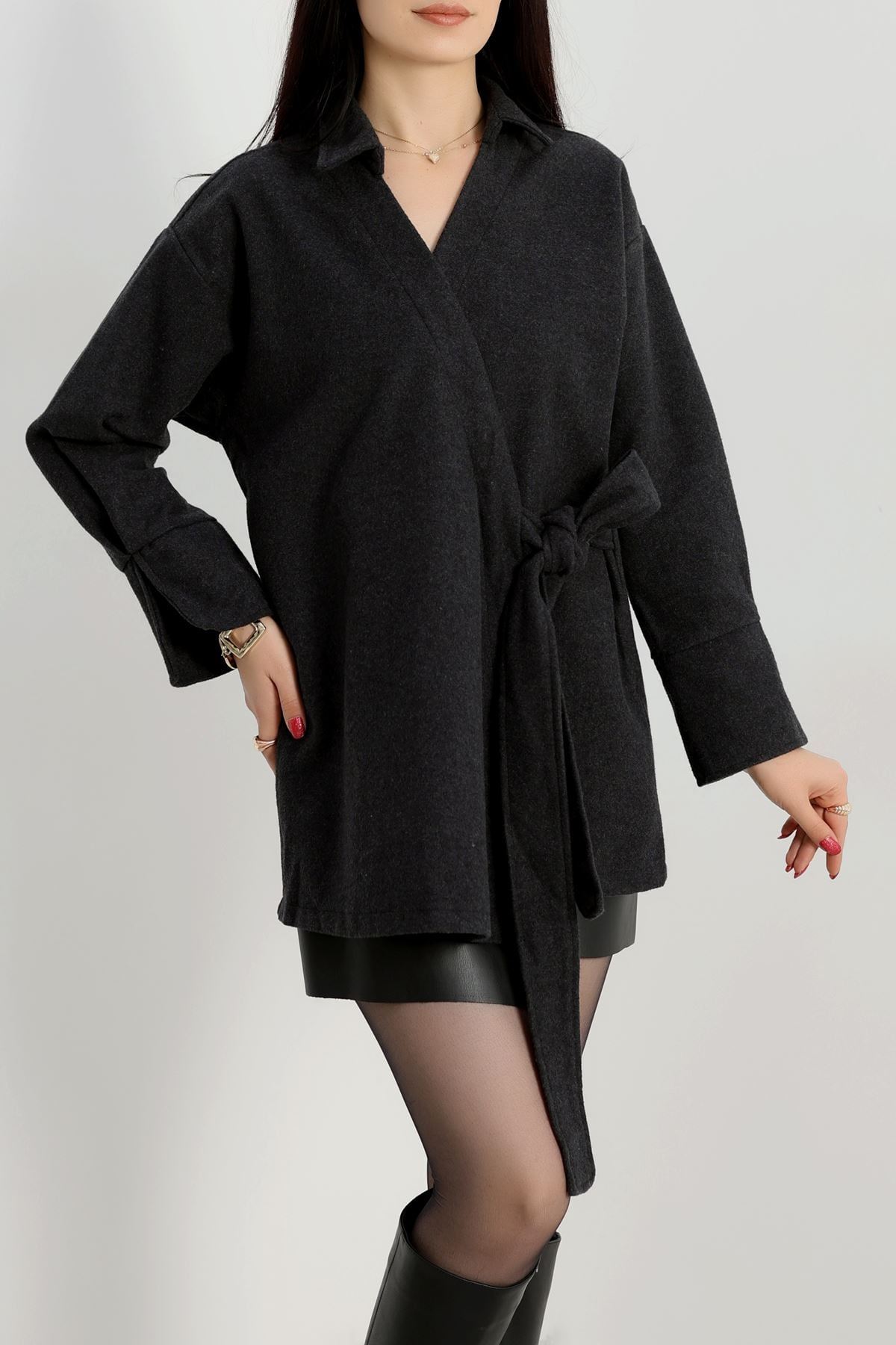 Bağlamalı Kruvaze Yaka Kaşe Ceket Füme - 70993.1775.