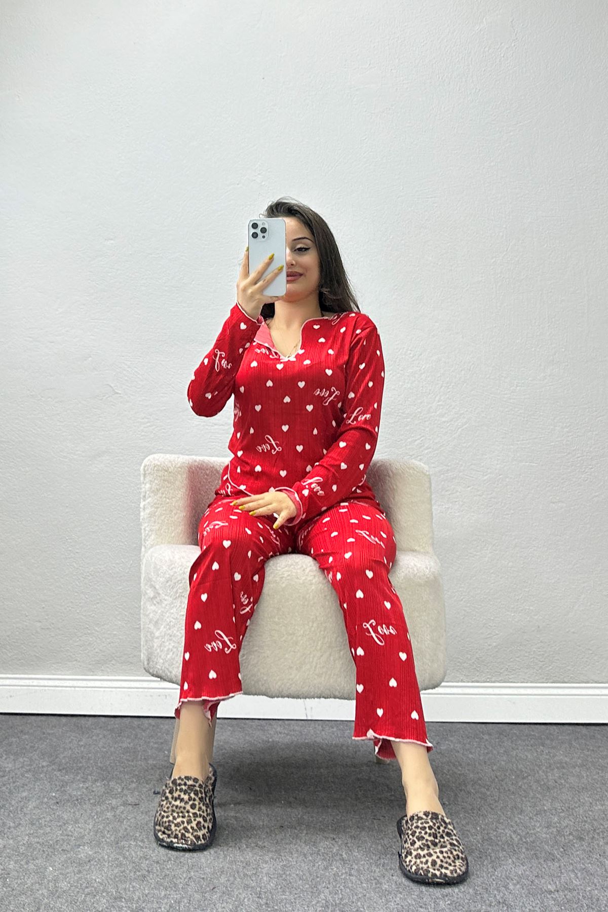 Süet Düğmeli Pijama Takımı Lacikırmızı1 - 450.1287.