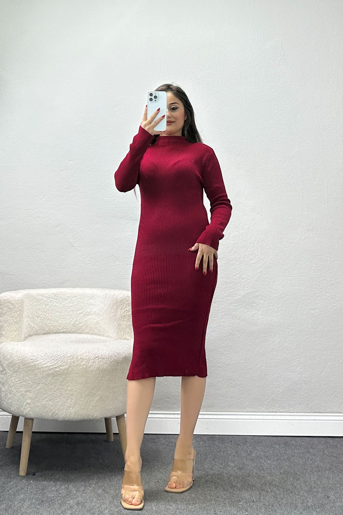 Bisiklet Yaka Triko Elbise Bordo - 4025.2043.