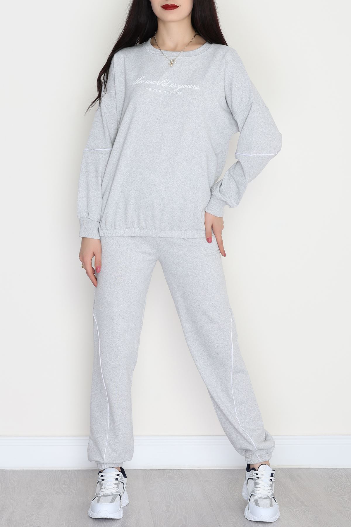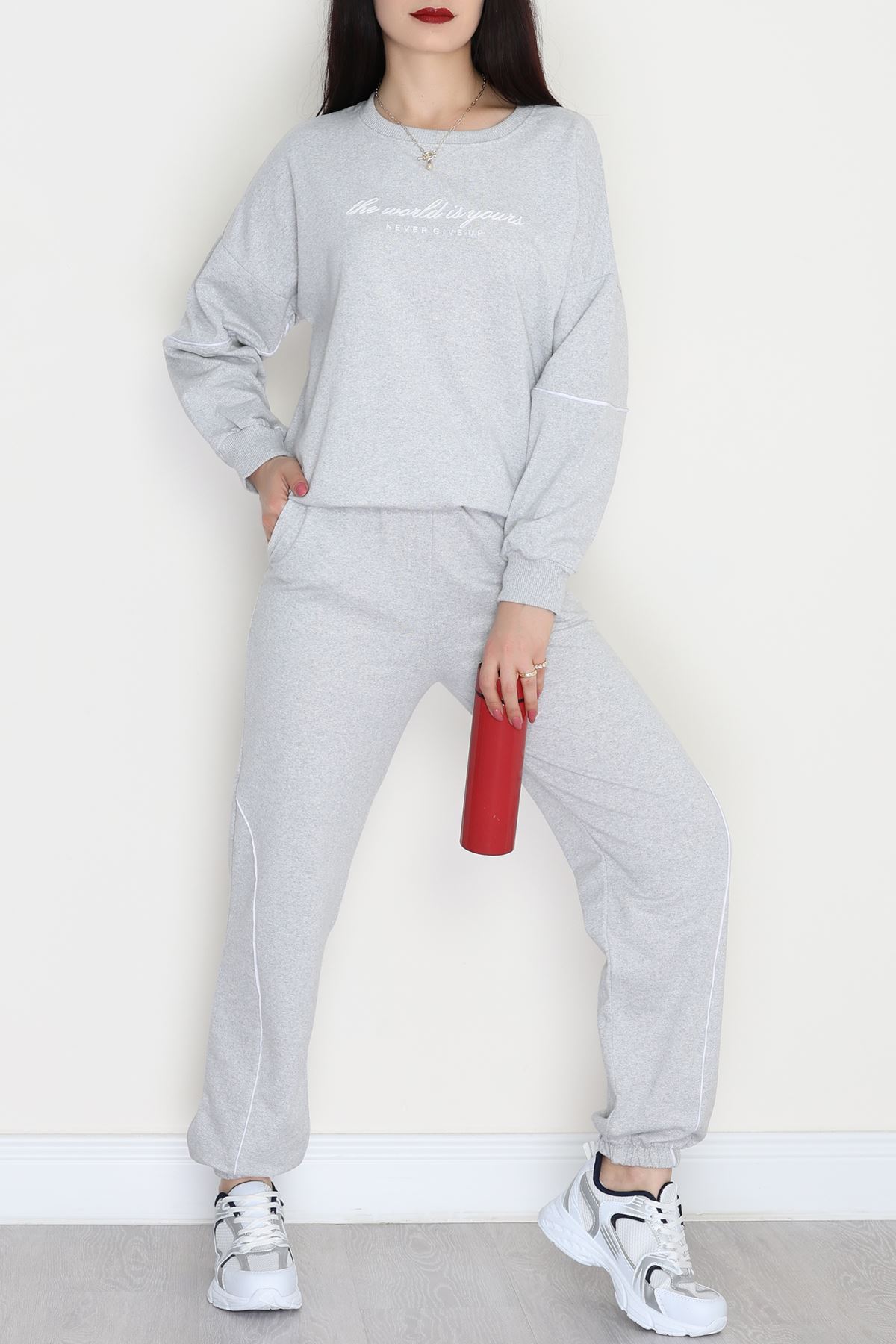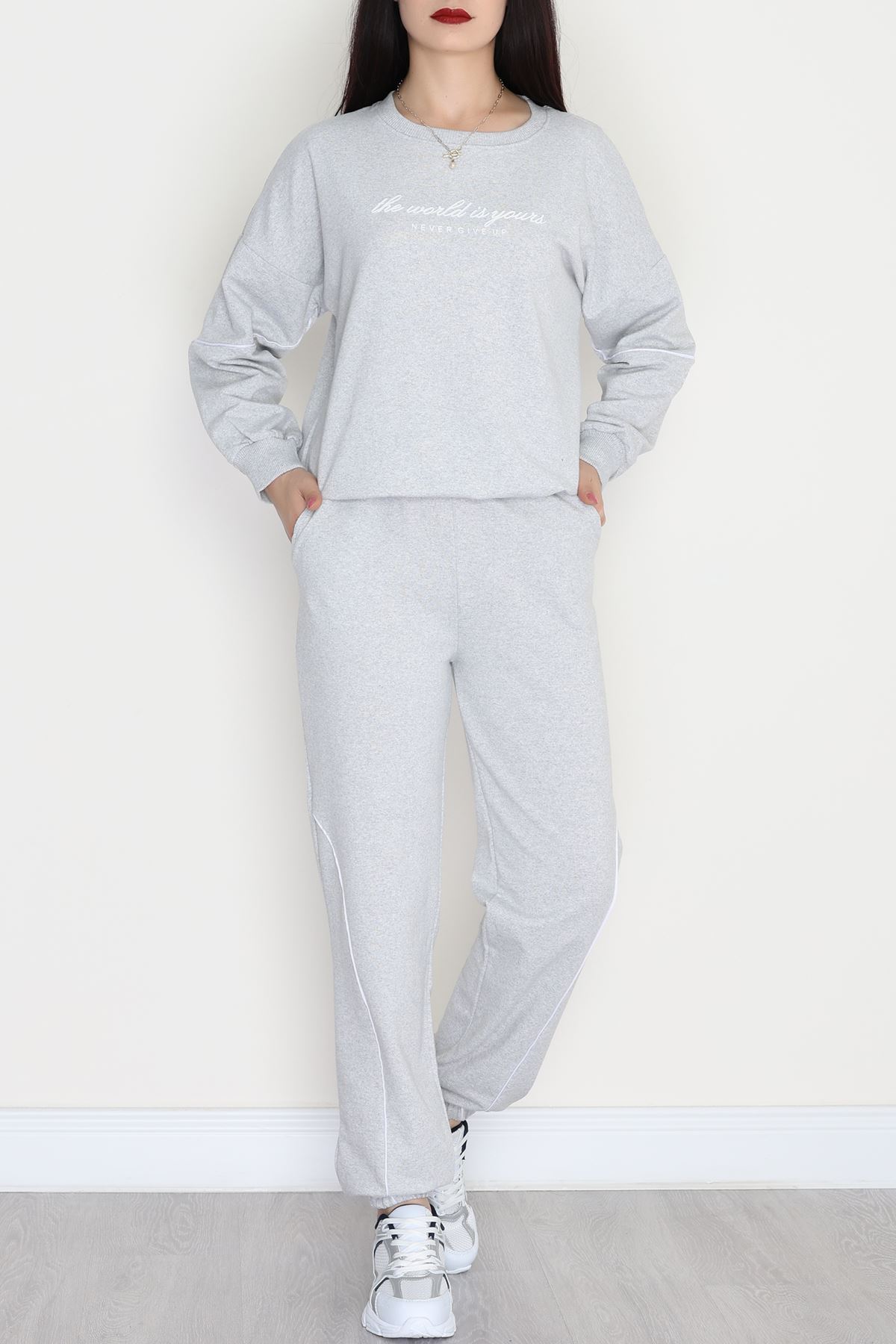 Biyeli Baskılı 2 İplik Eşofman Takımı Gri - 50791.1857.