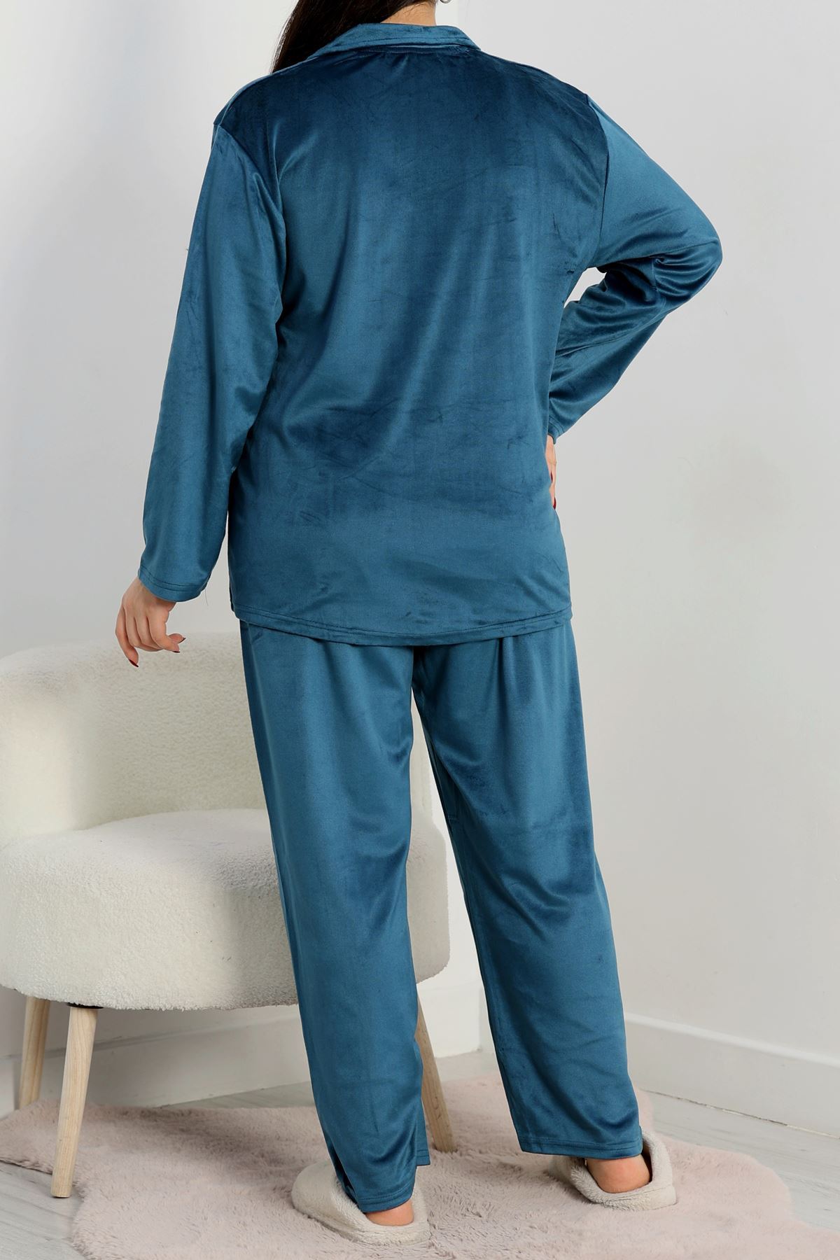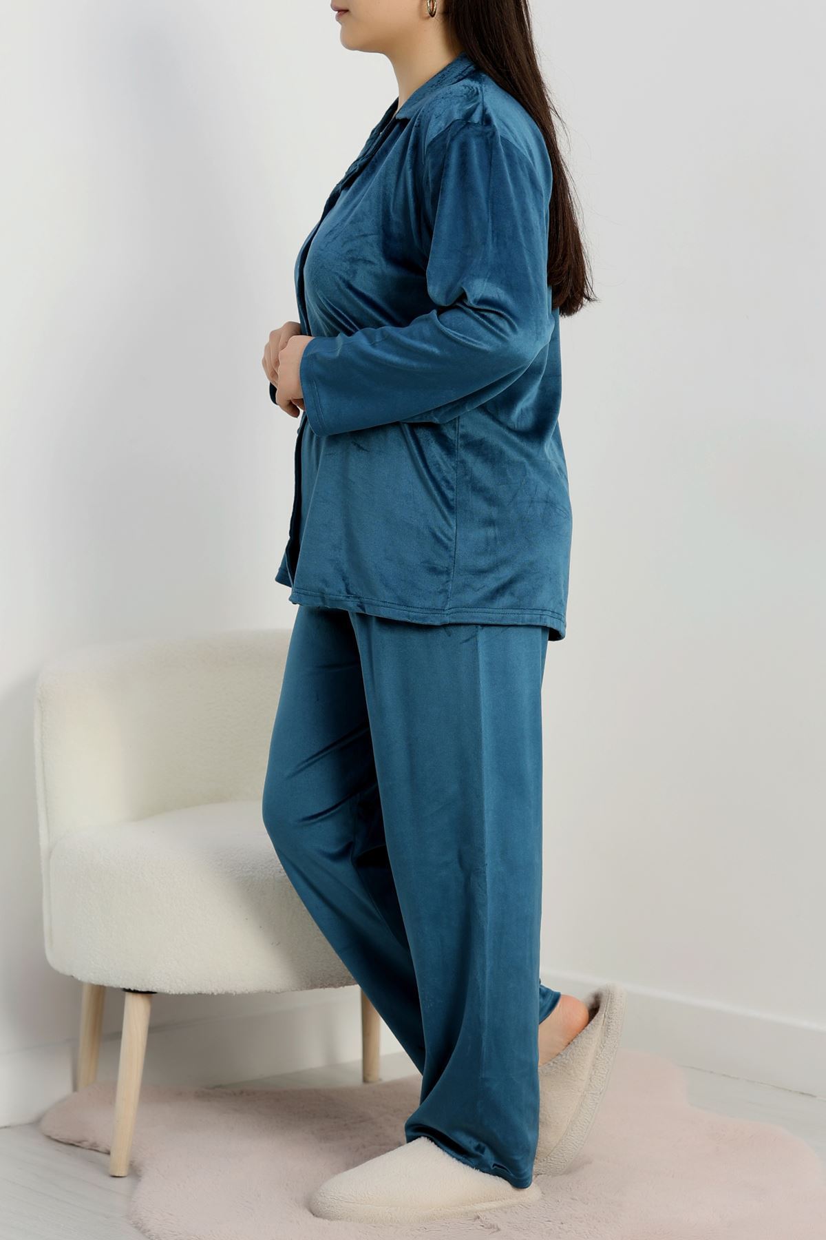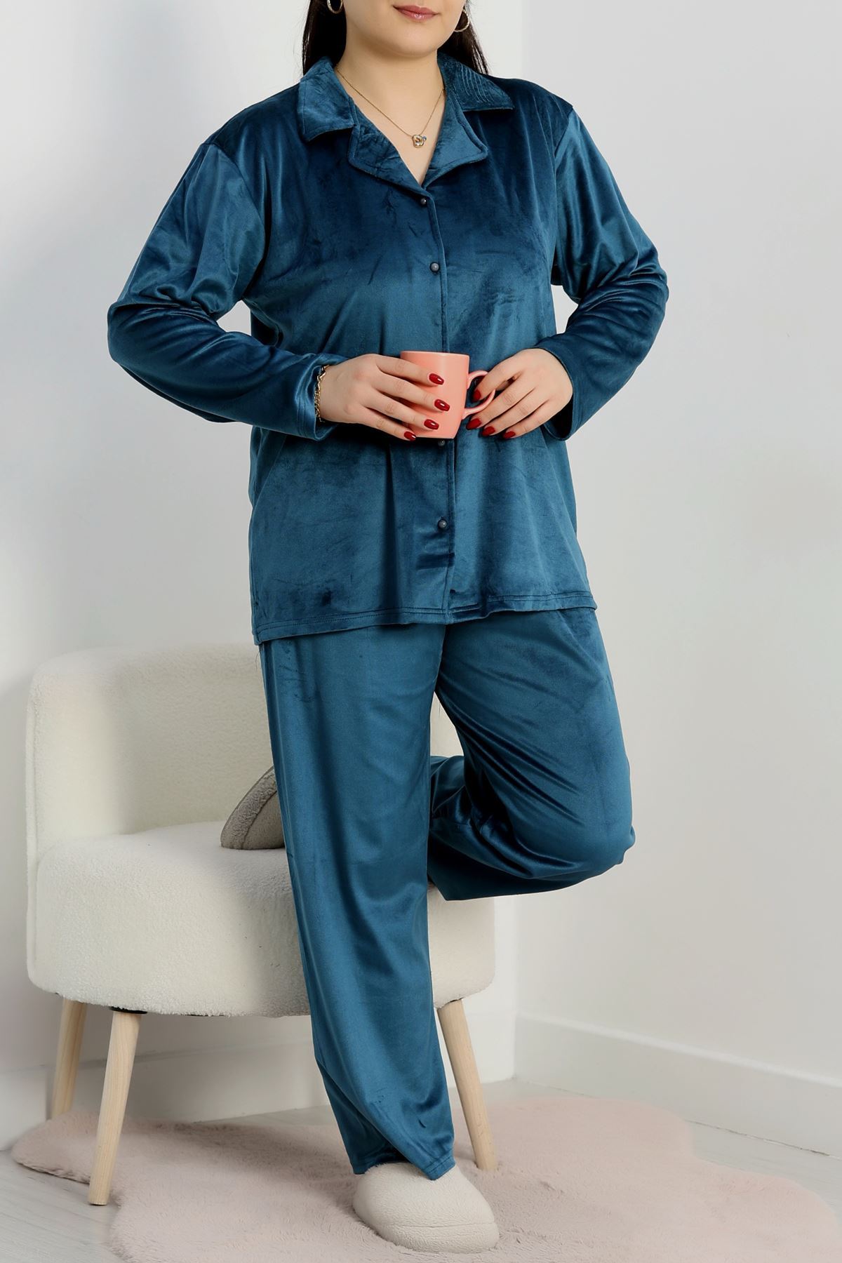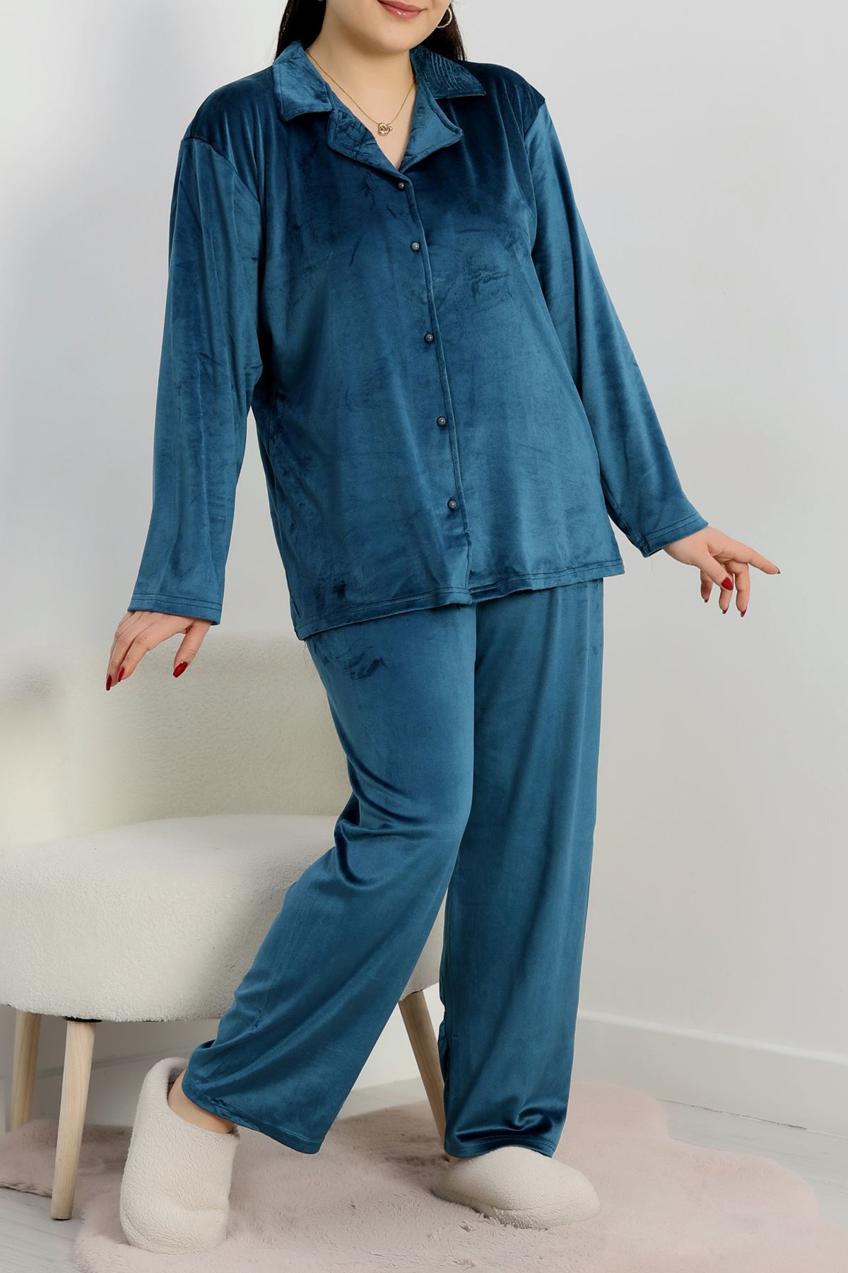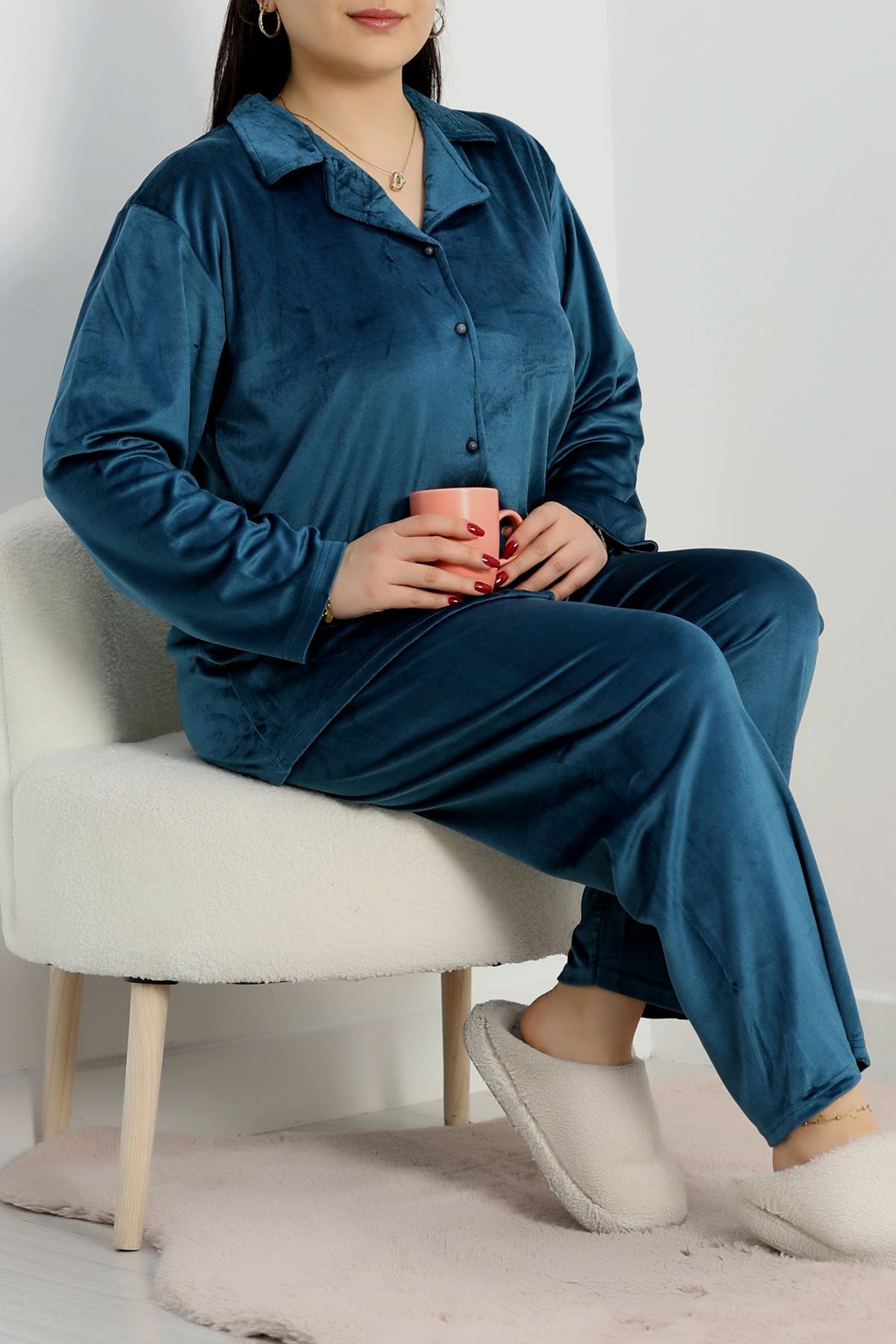 Büyük Beden Likralı Fransız Kadife Pijama Takımı Petrol - 42067.1049.