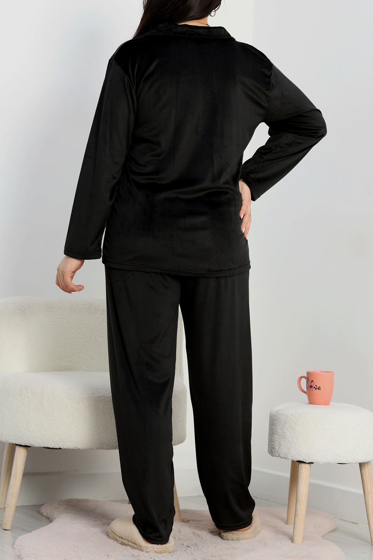 Büyük Beden Likralı Fransız Kadife Pijama Takımı Siyah - 42067.1049.