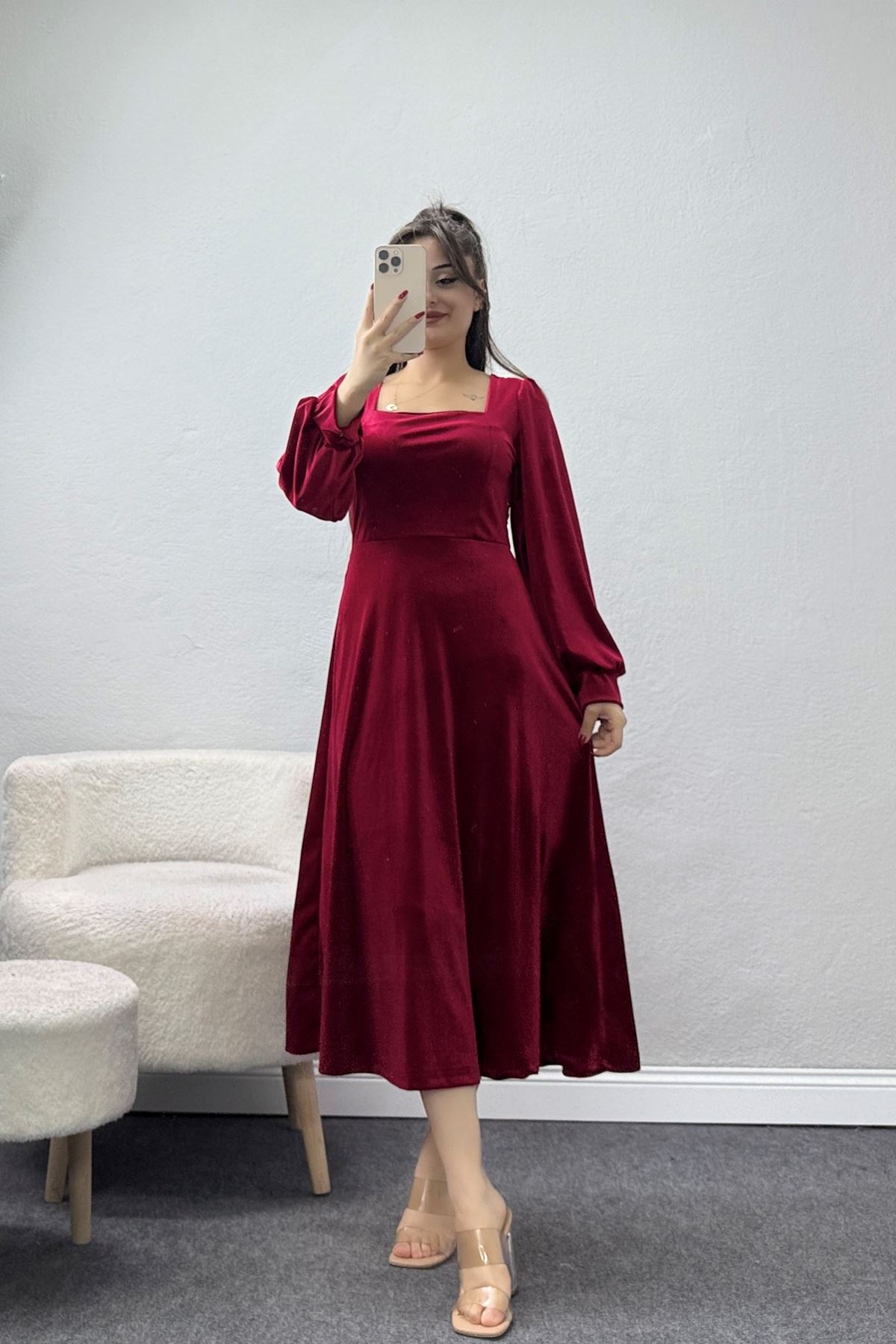 Çerçeve Yaka İthal Kadife Kloş Elbise Bordo - 42577.1949.