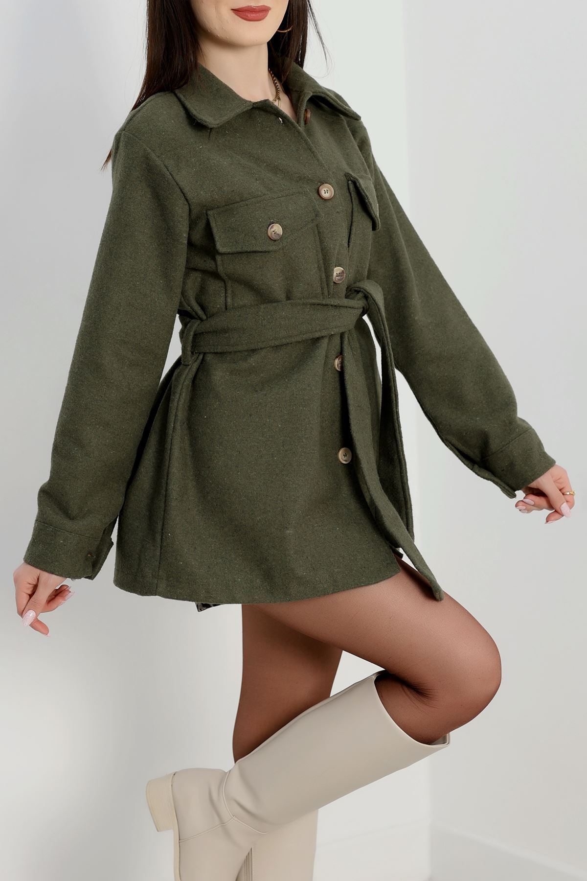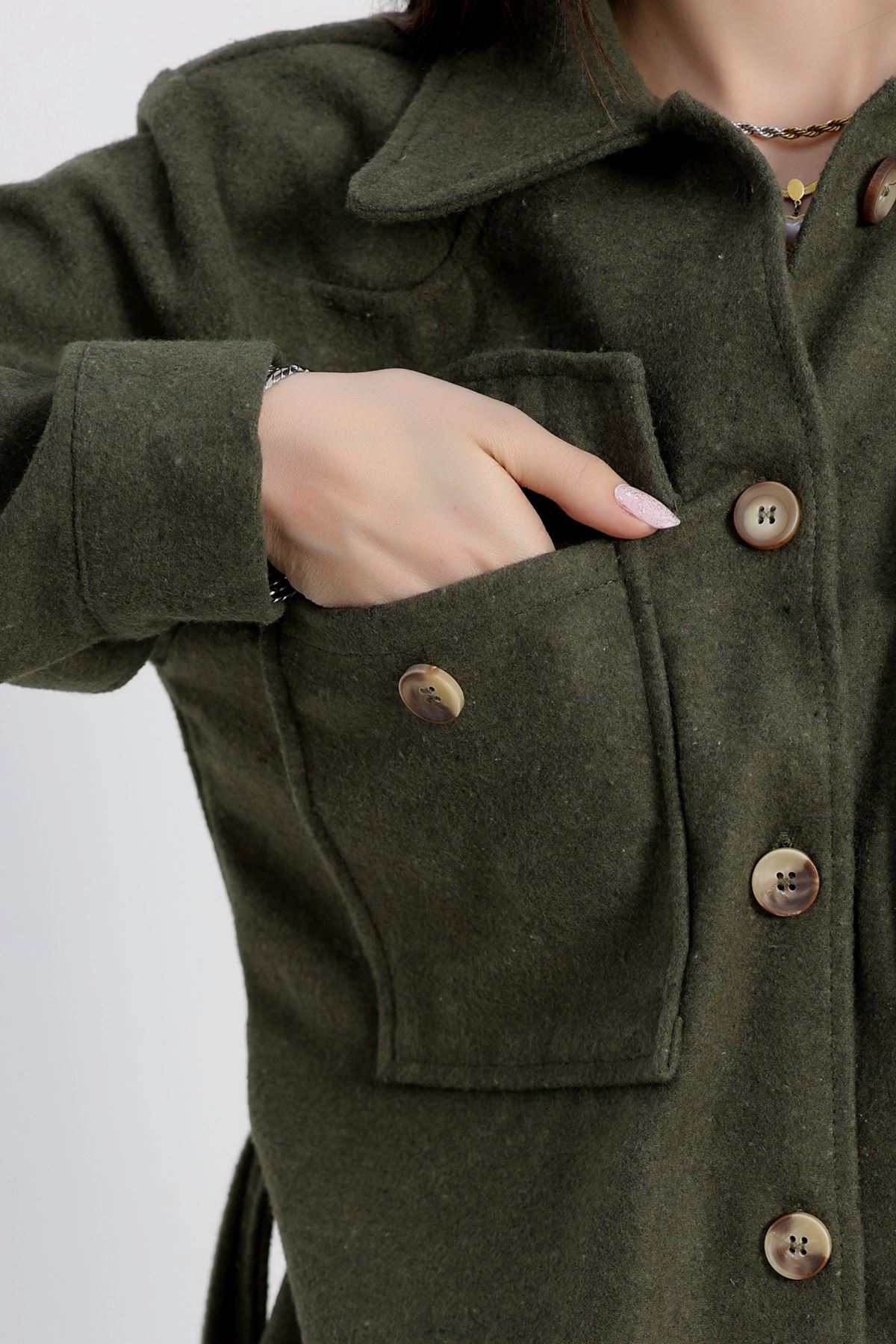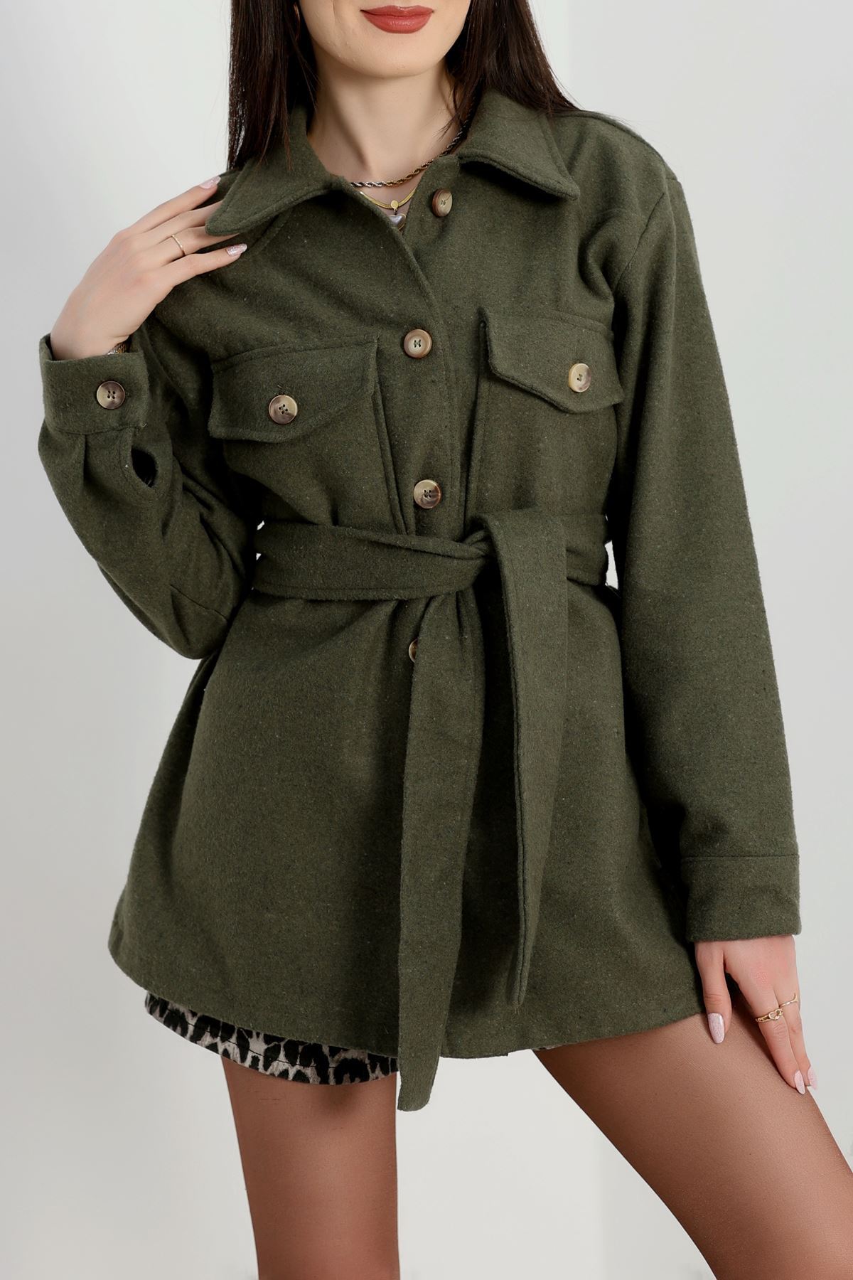 Çift Cepli Kuşaklı Tunik Gömlek Haki - 70991.1775.