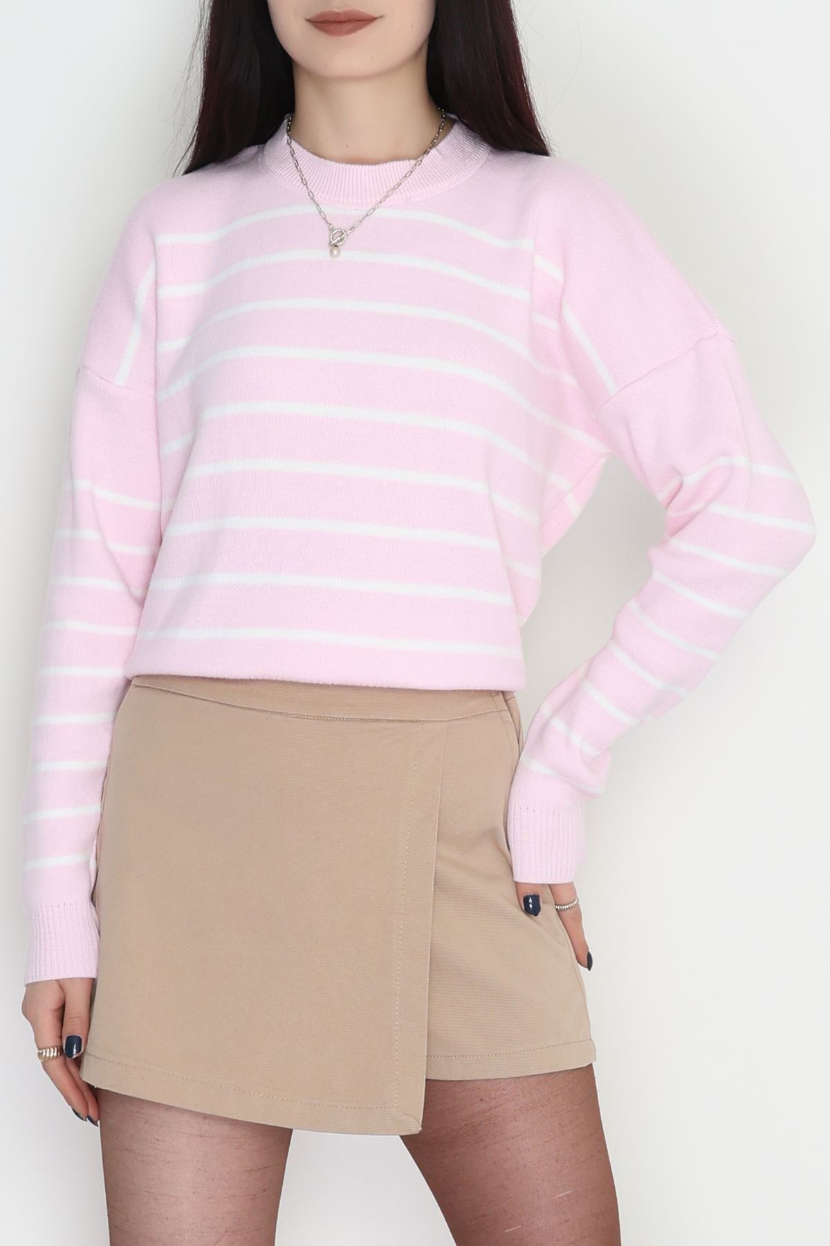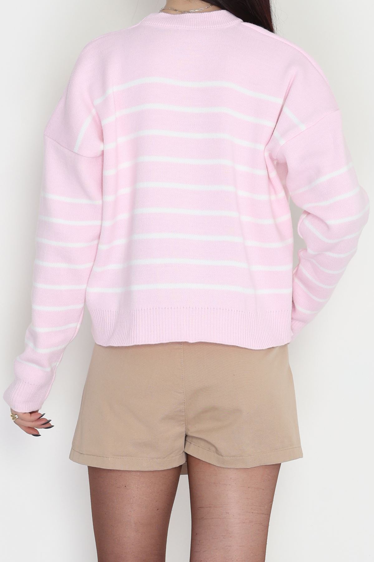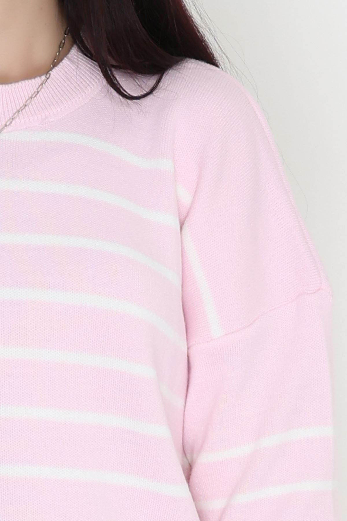 Çizgili Bisiklet Yaka Triko Pembebeyaz - 3099.1577.