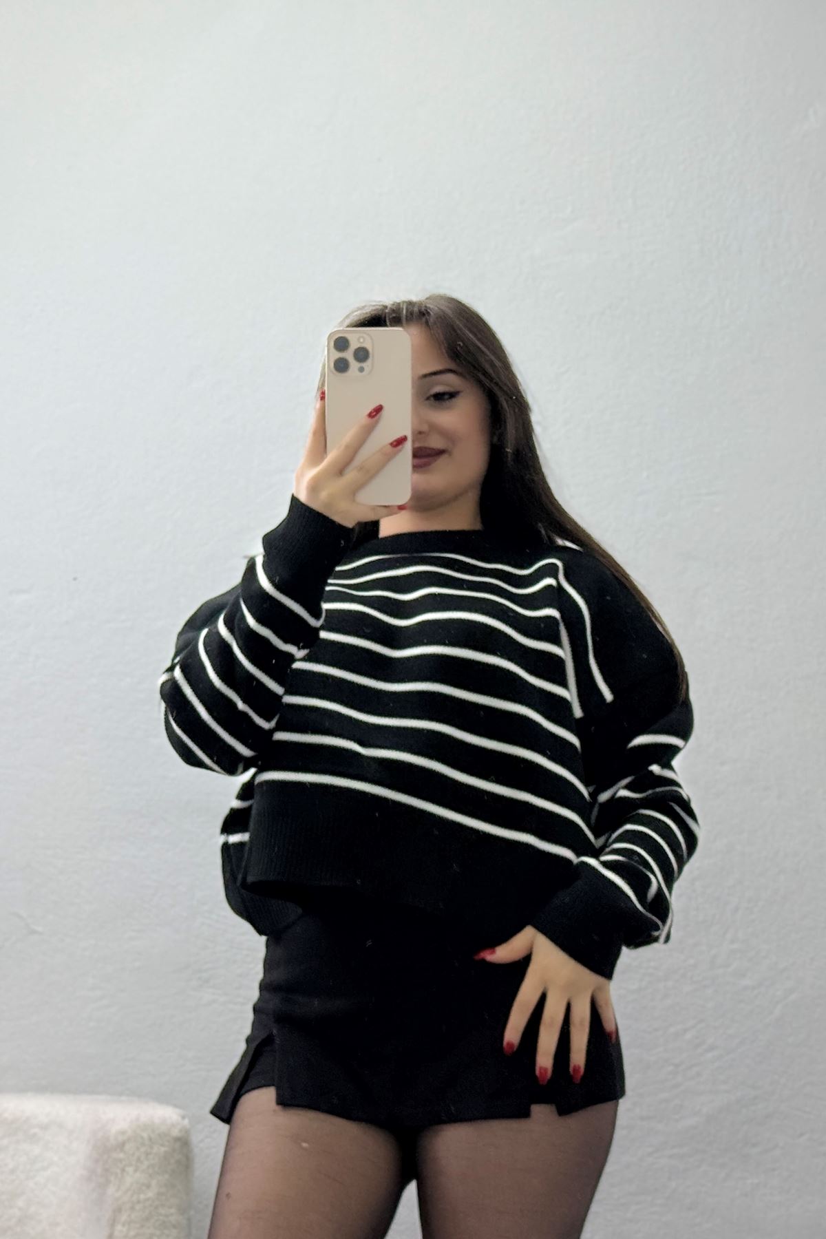 Çizgili Bisiklet Yaka Triko Siyahbeyaz - 3099.1577.