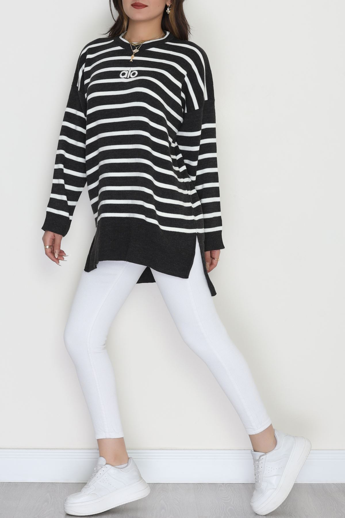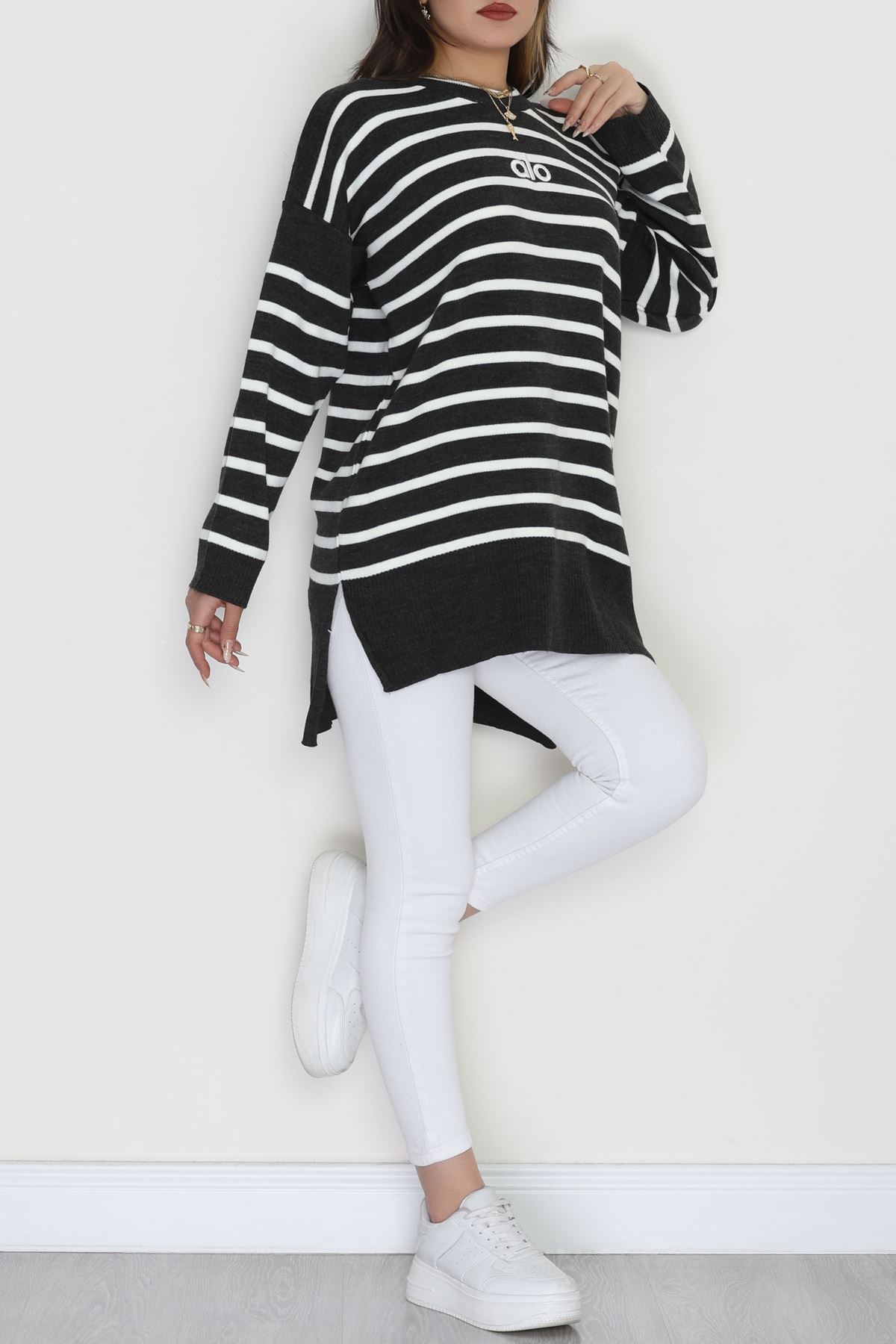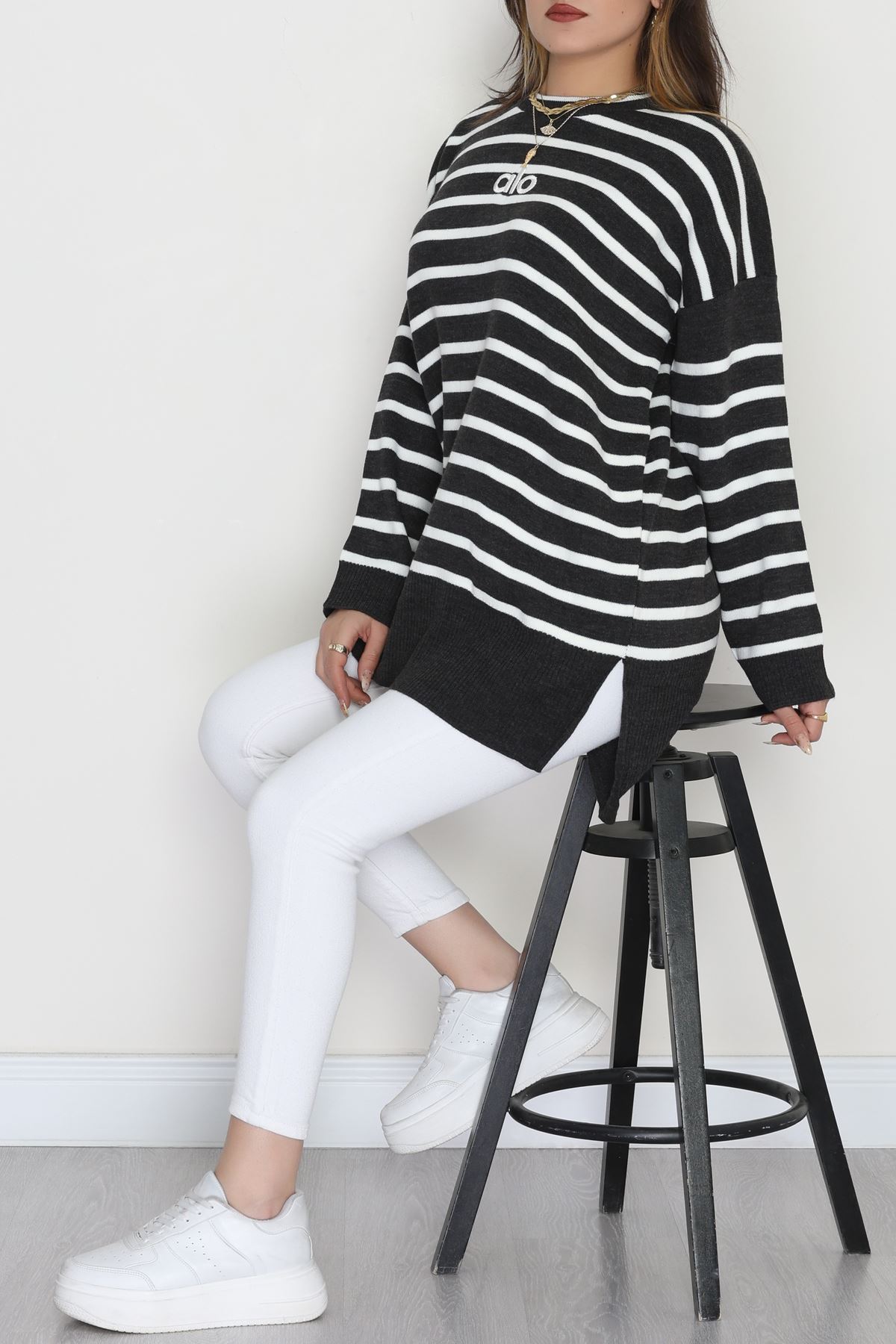 Çizgili Nakışlı Triko Tunik Antrasit - 4041.1247.