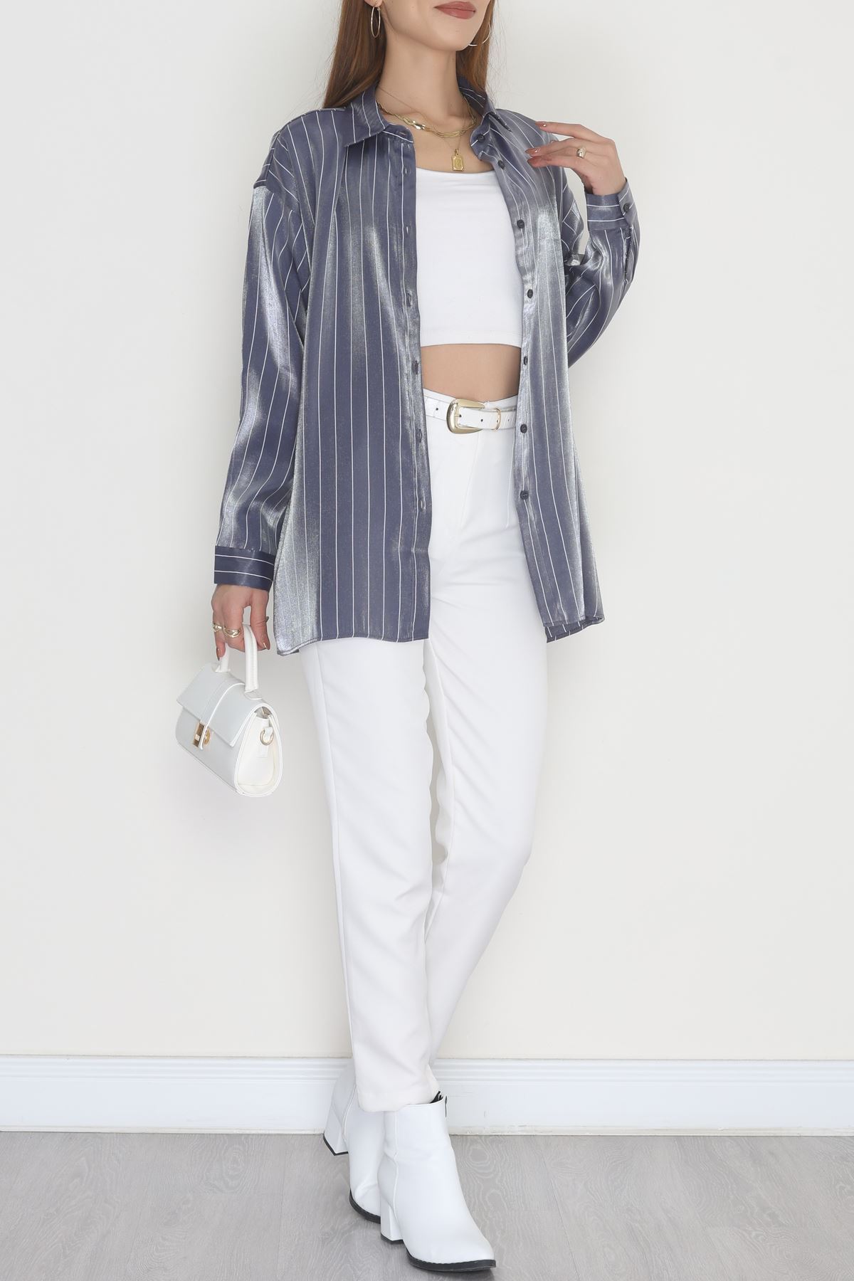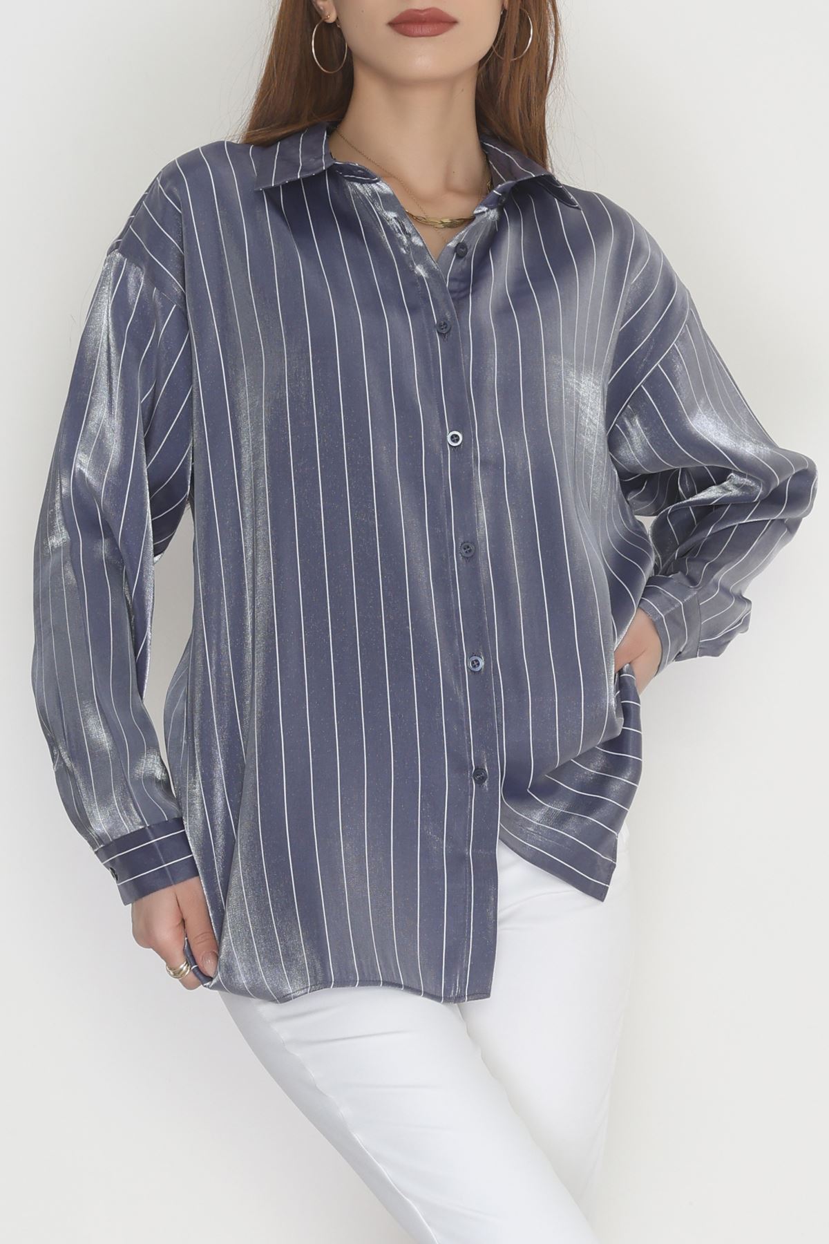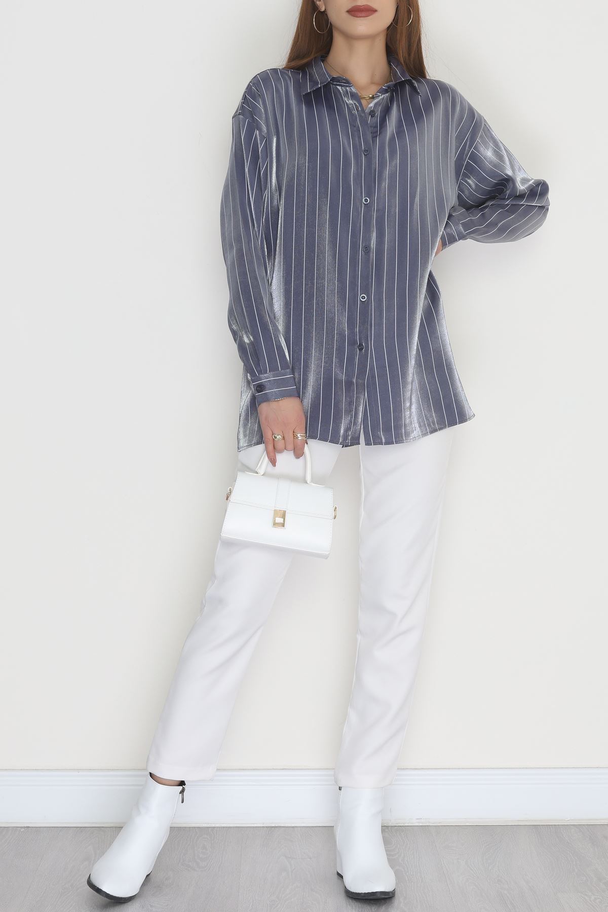 Çizgili Saten Oversize Gömlek Antrasit - 4009.1595.