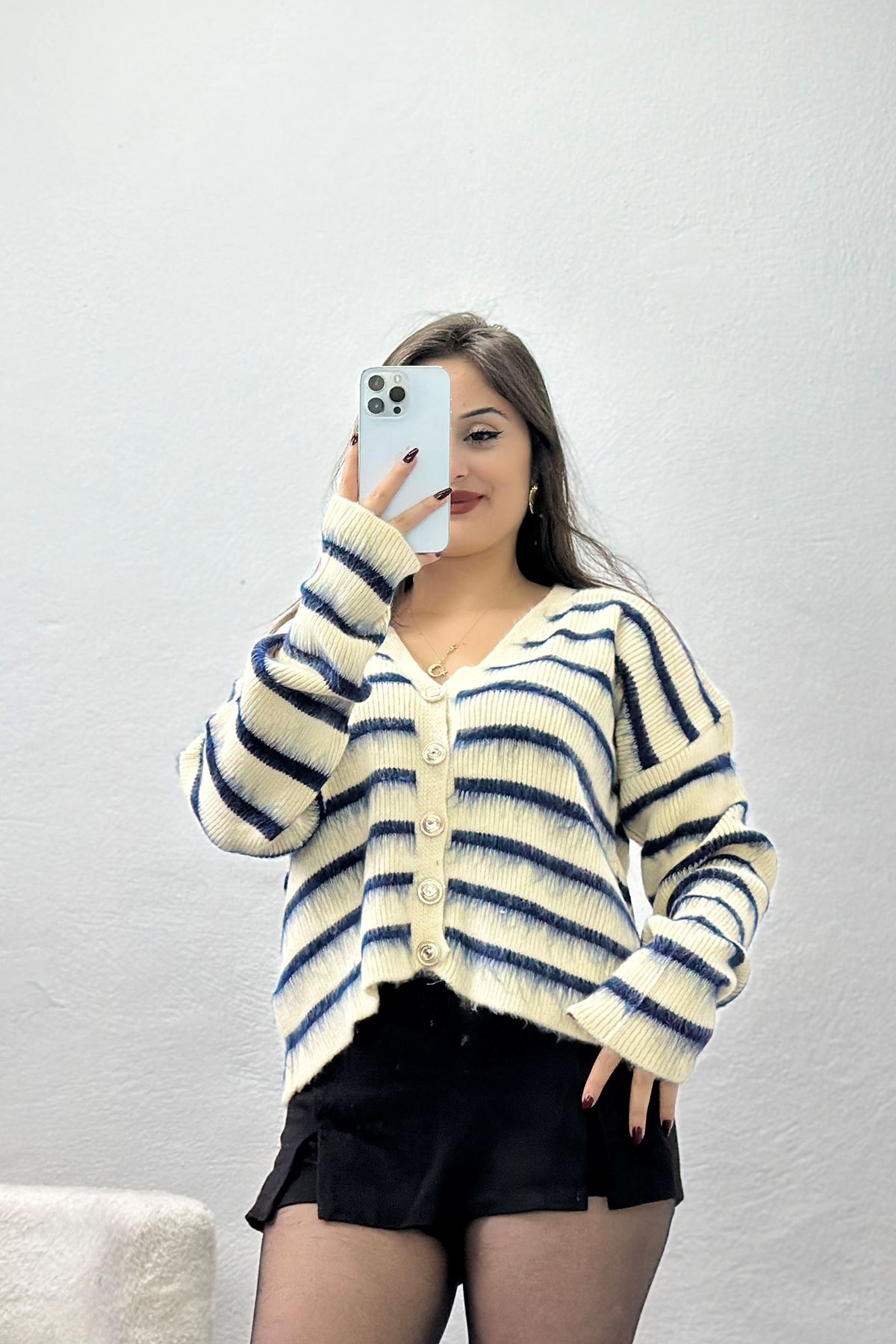 Çizgili Triko Hırka Ekru - 2319.1765.