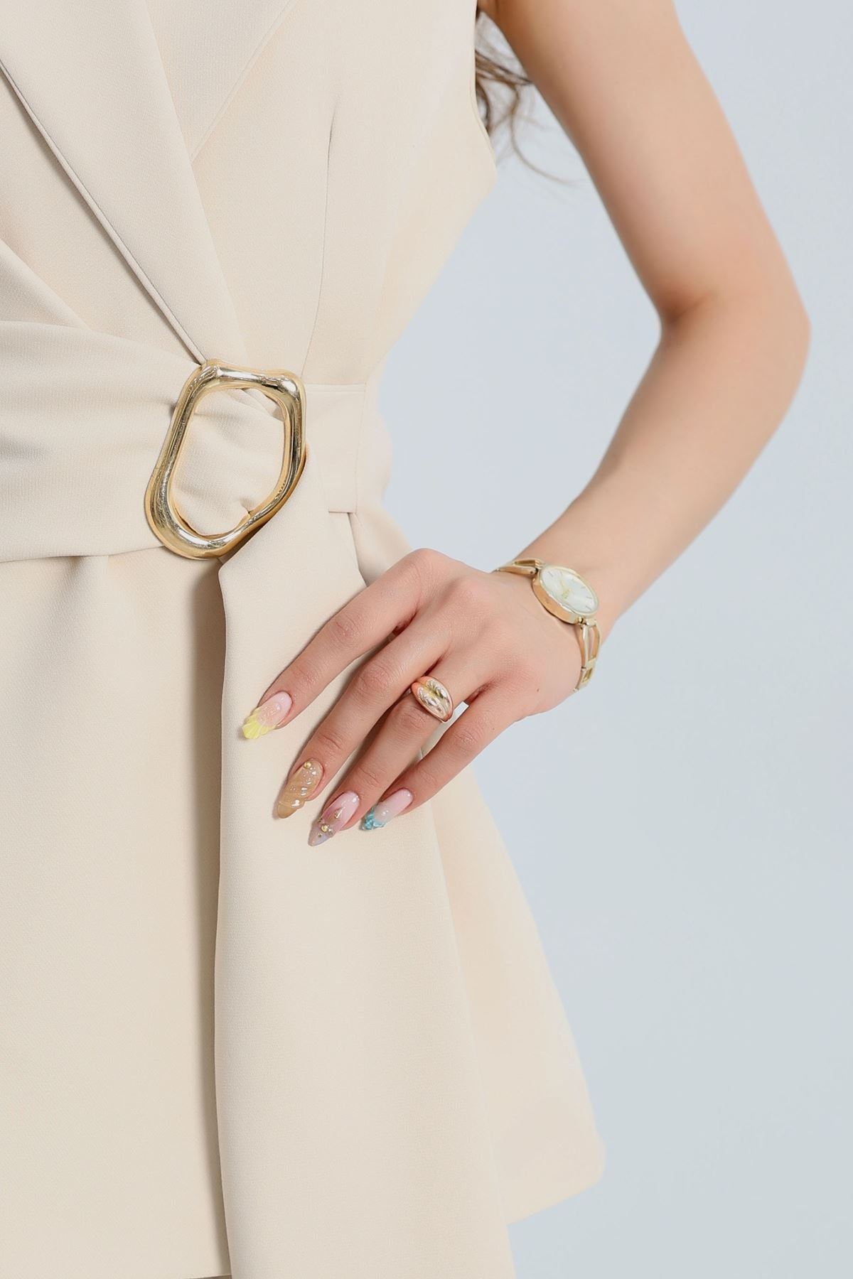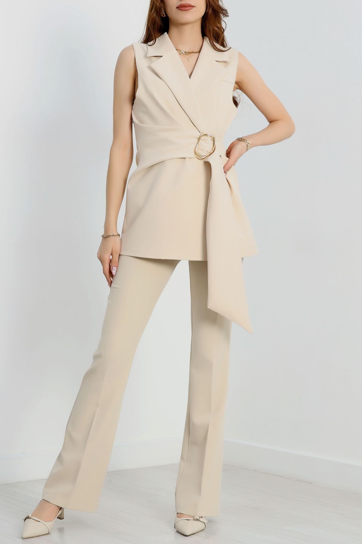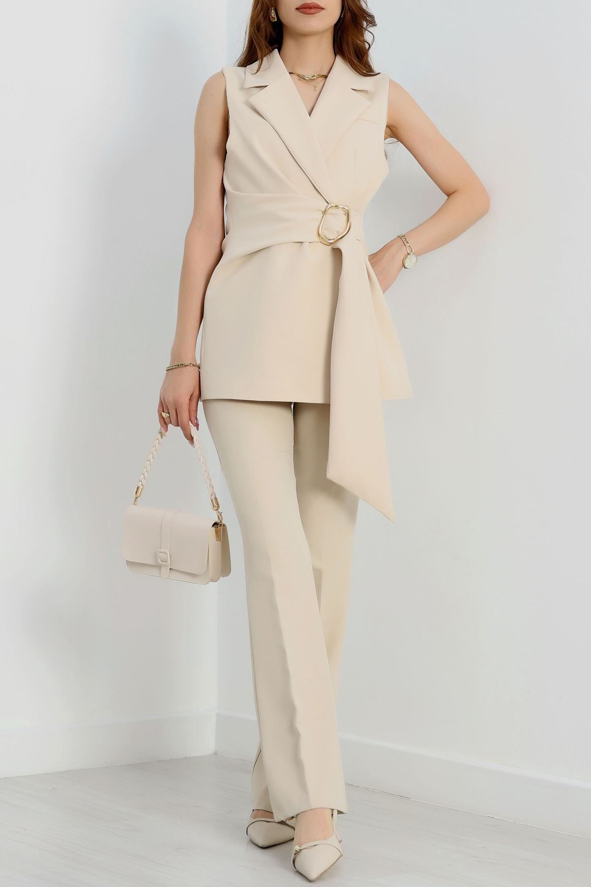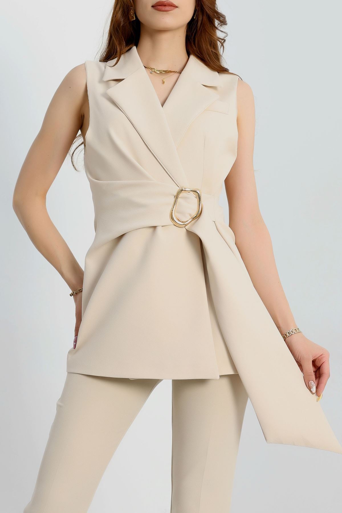Dabıl Kumaş Bağlamalı Astarlı Yelek Bej - 31359.1397.