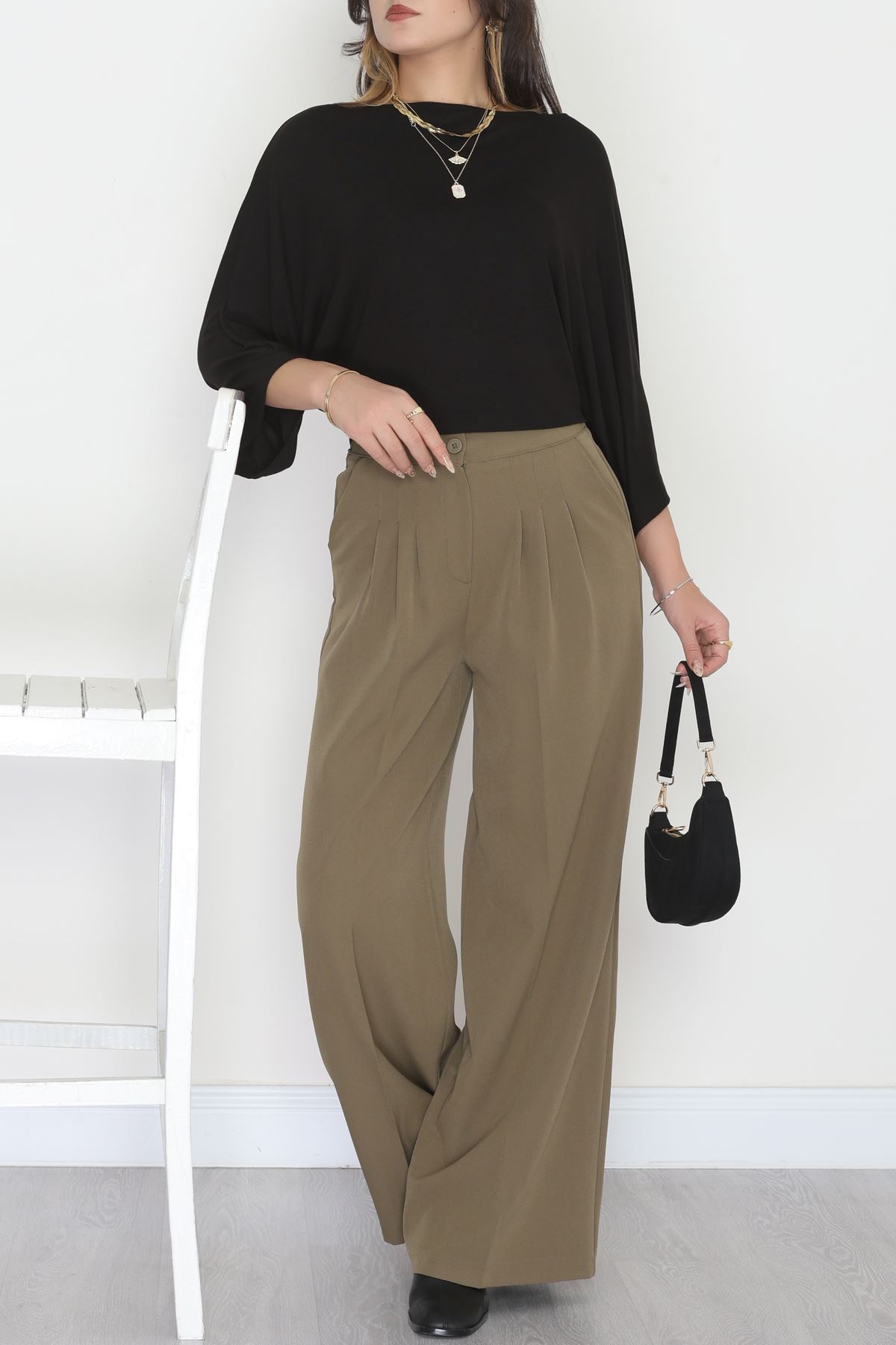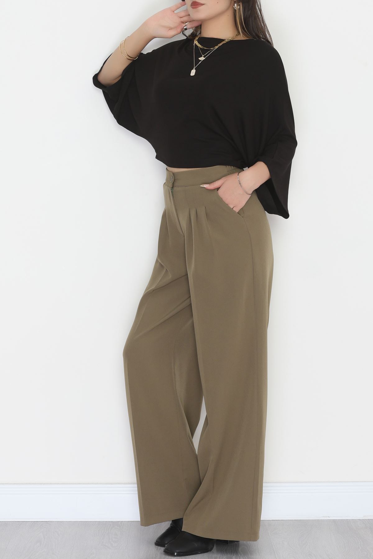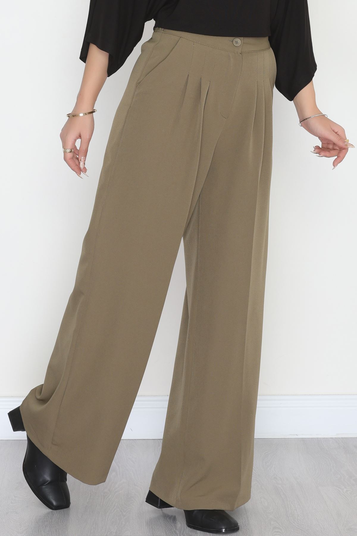 Dabıl Kumaş Beli Lastikli Palazzo Pantolon Haki - 51063.1991.
