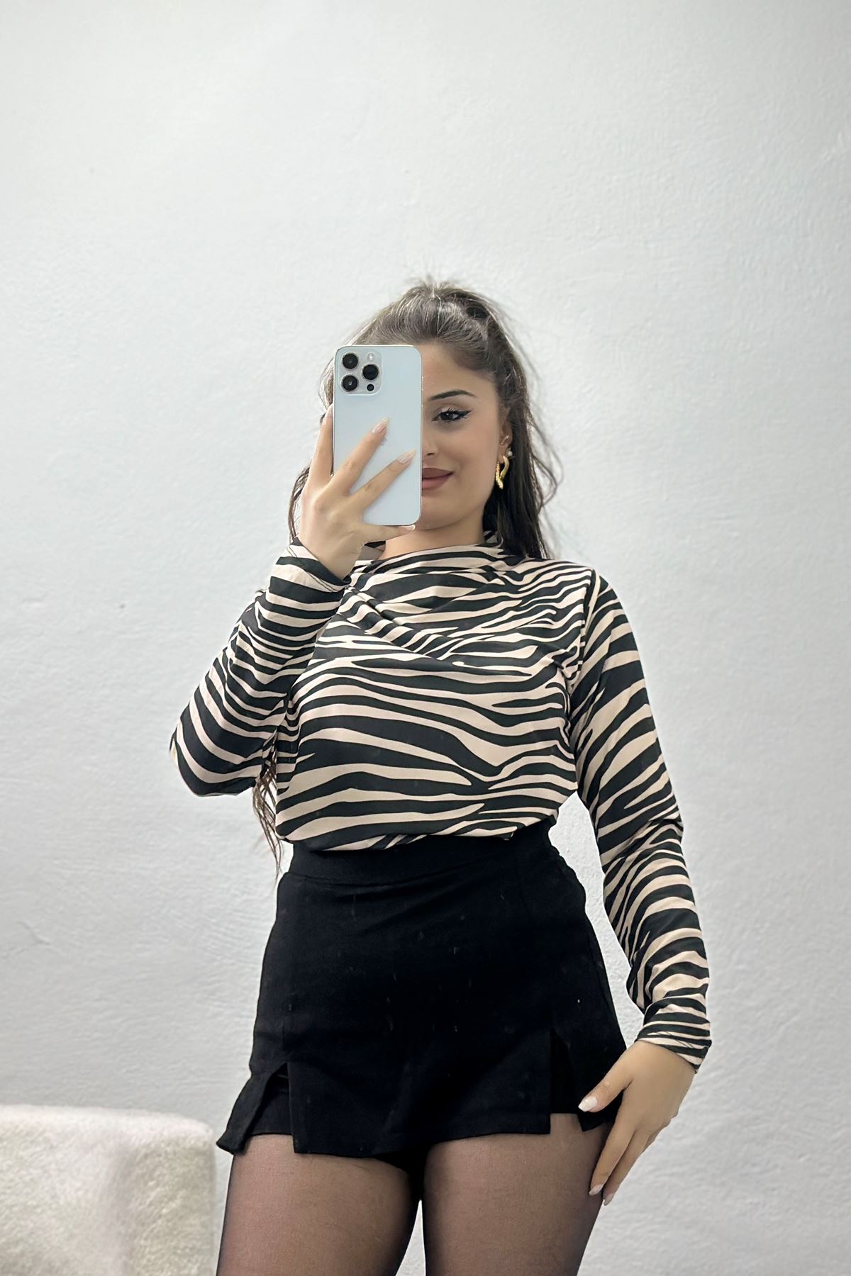 Desenli Dik Yaka Sandy Bluz Vizonsiyah - 70689.1949.