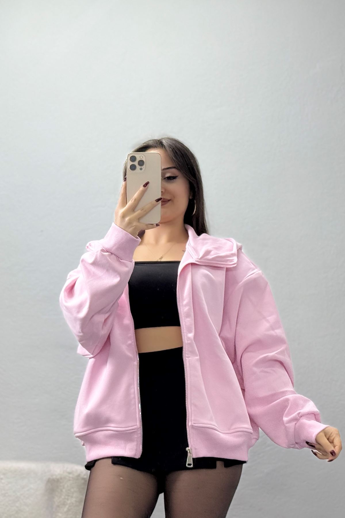 Double Face Kumaş Fermuarlı Kapşonlu Sweat Pembe - 42677.1437.