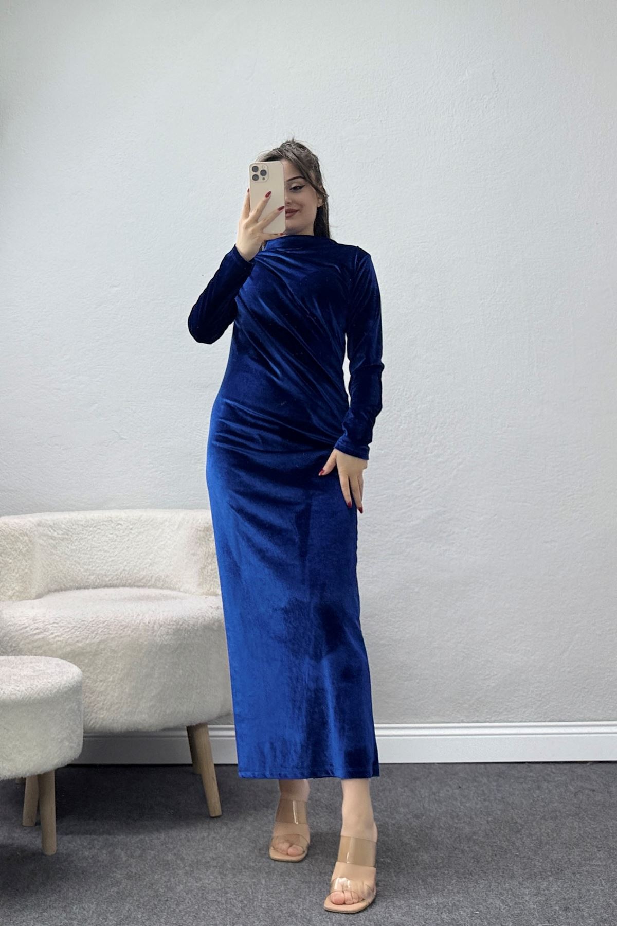 Drapeli İthal Kadife Elbise Saks - 42583.1949.