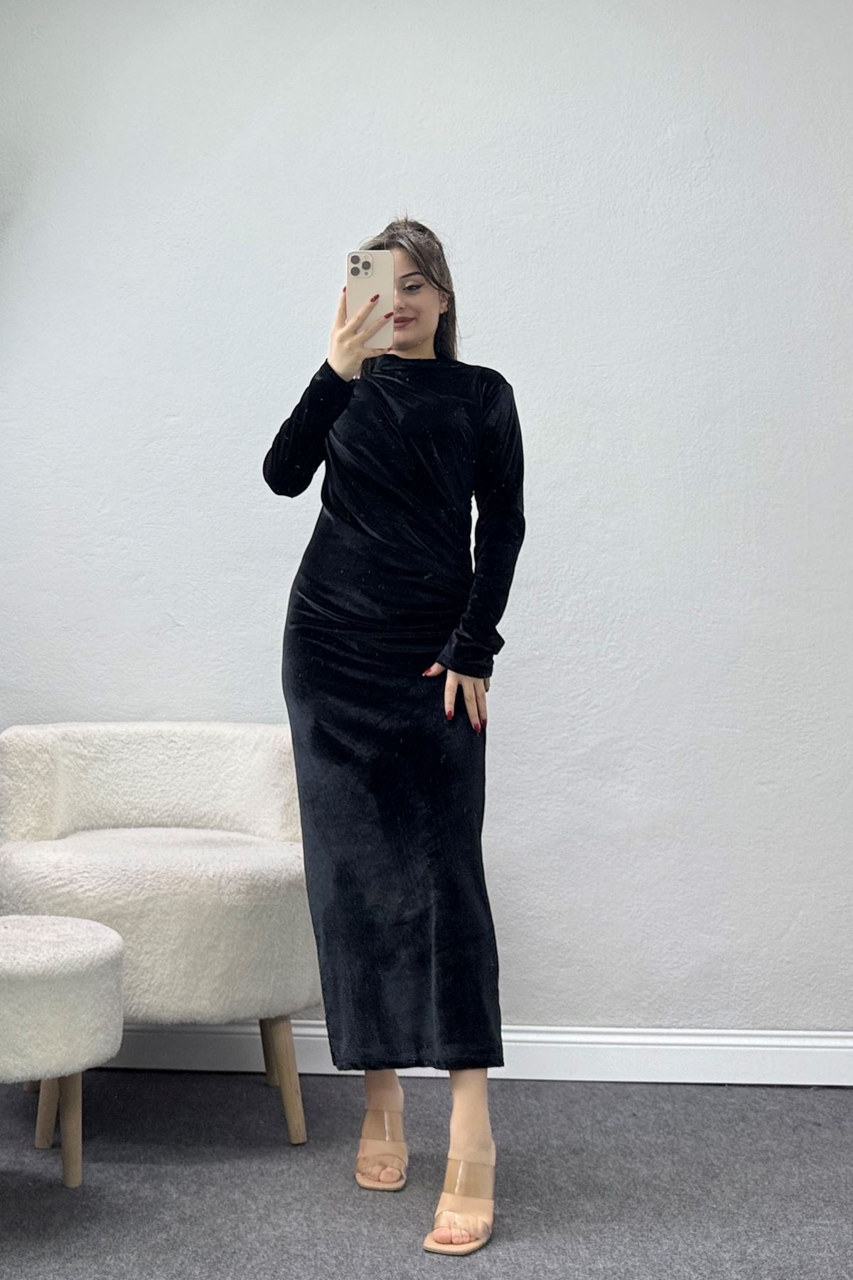 Drapeli İthal Kadife Elbise Siyah - 42583.1949.
