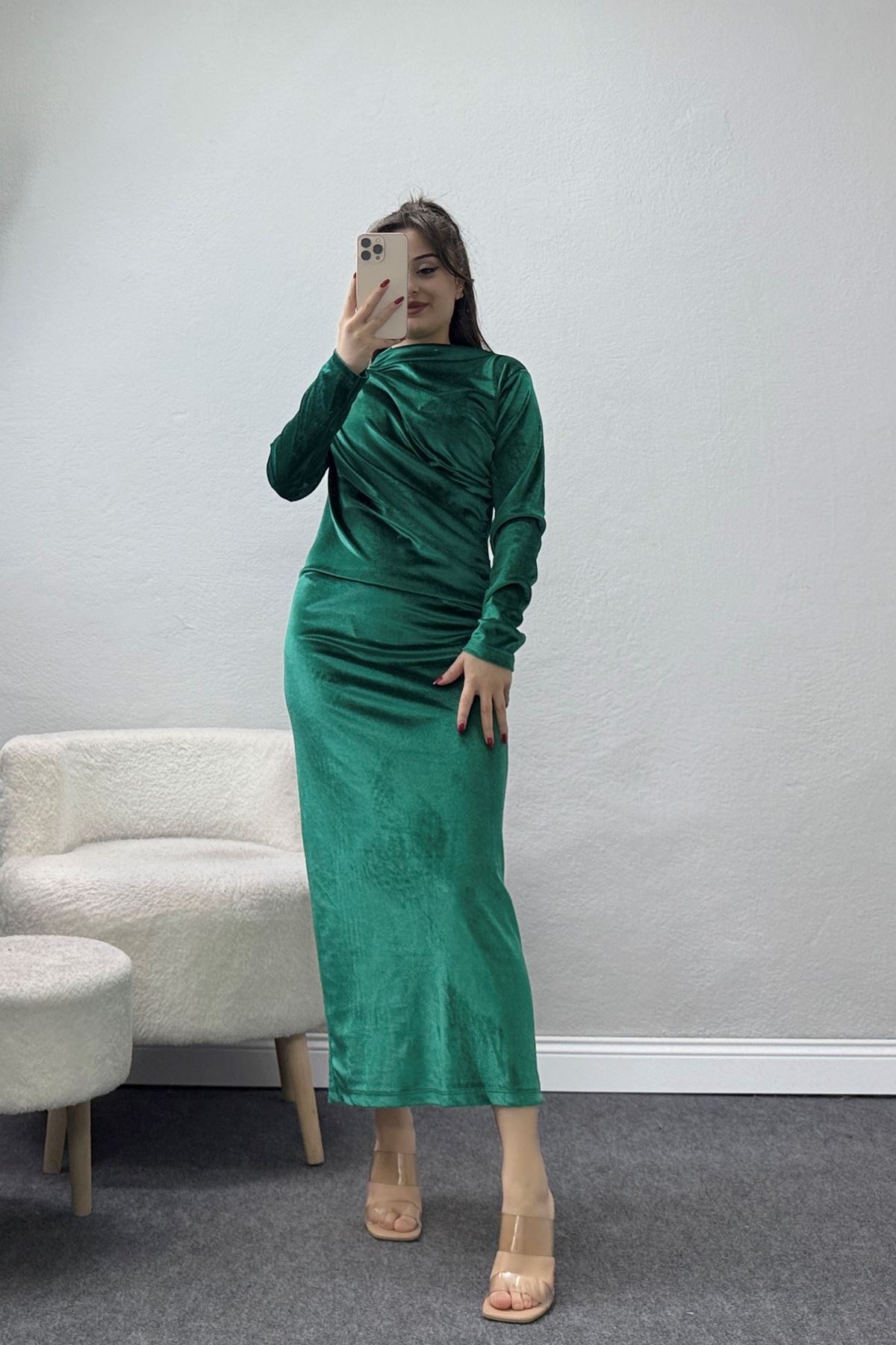 Drapeli İthal Kadife Elbise Zümrüt - 42583.1949.