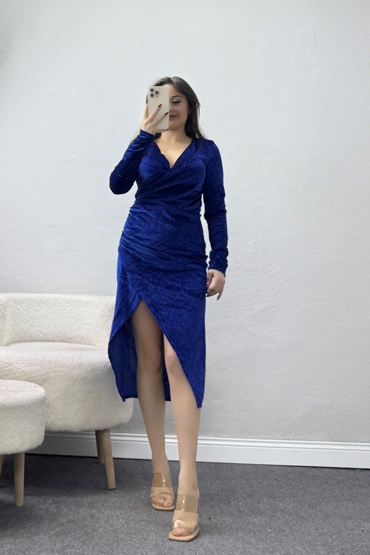 Drapeli Simli Kadife Elbise Saks - 581892.1592.