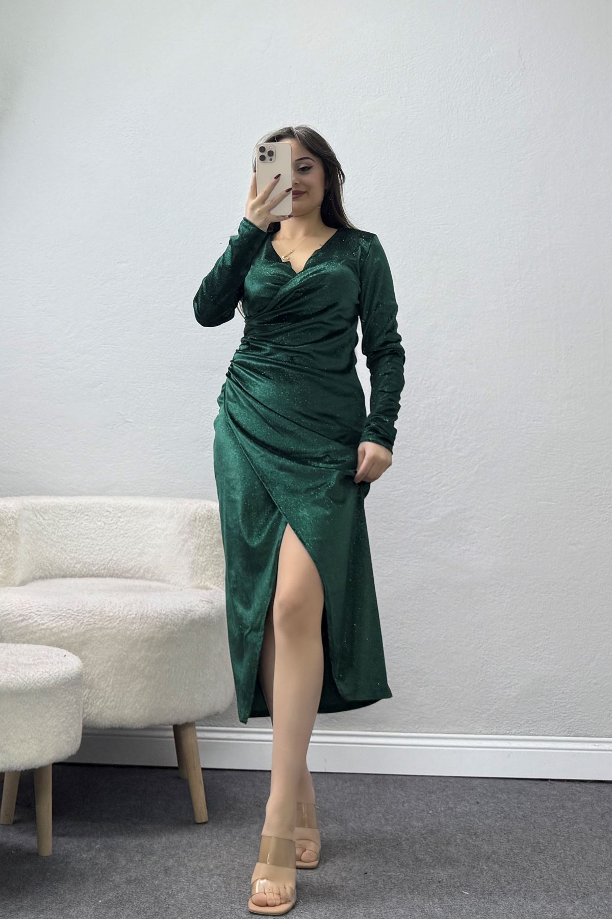 Drapeli Simli Kadife Elbise Zümrüt - 581892.1592.