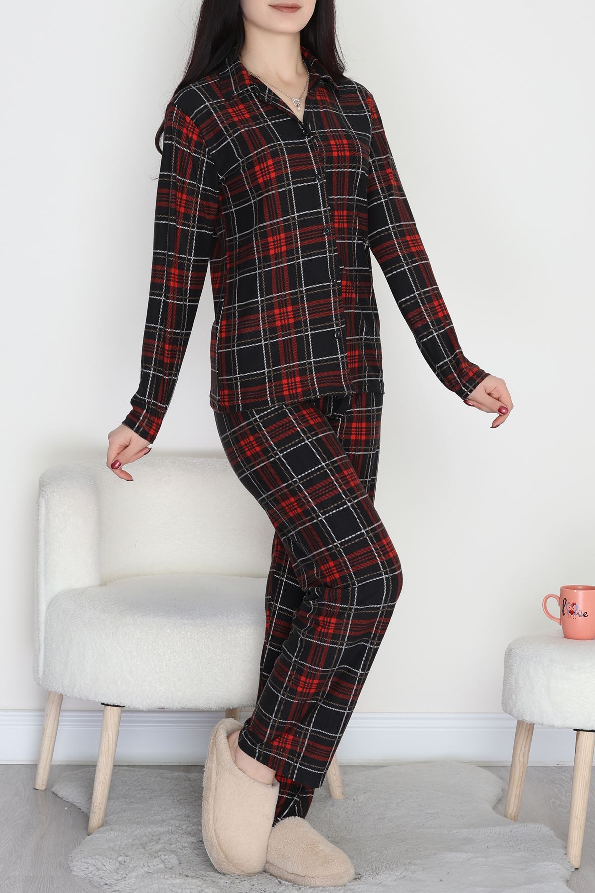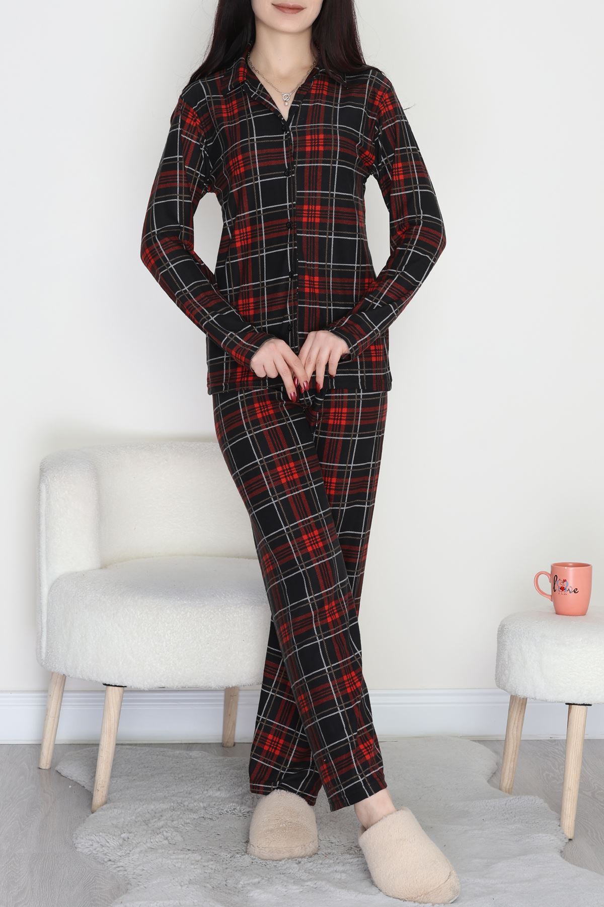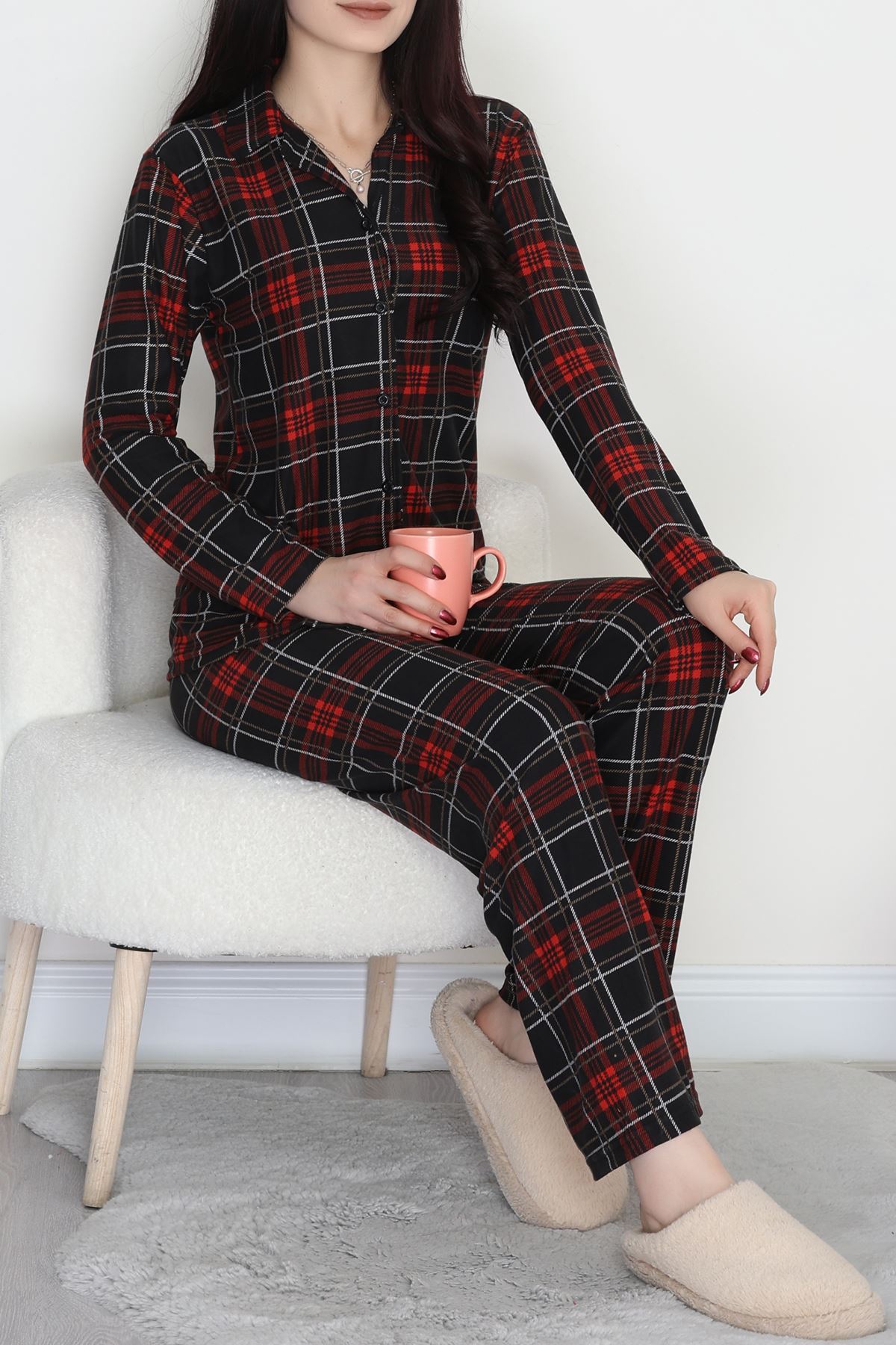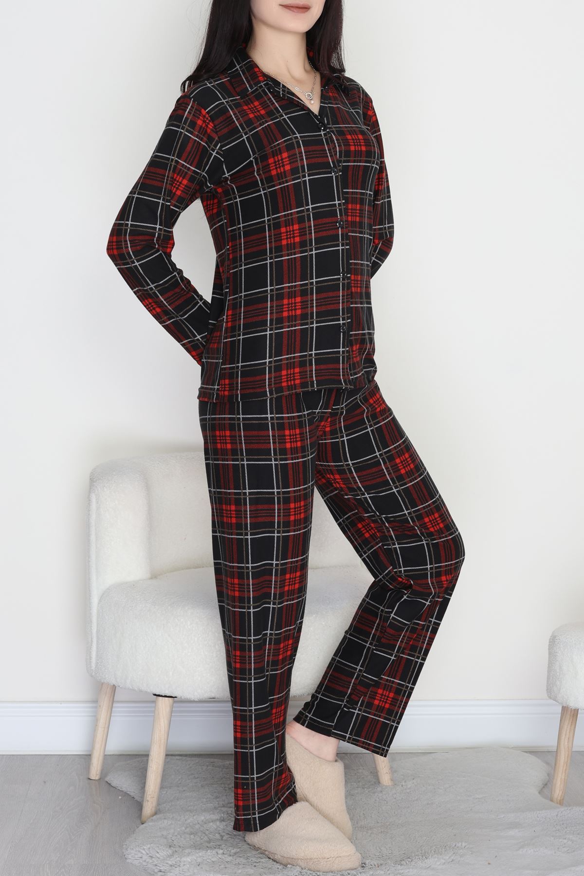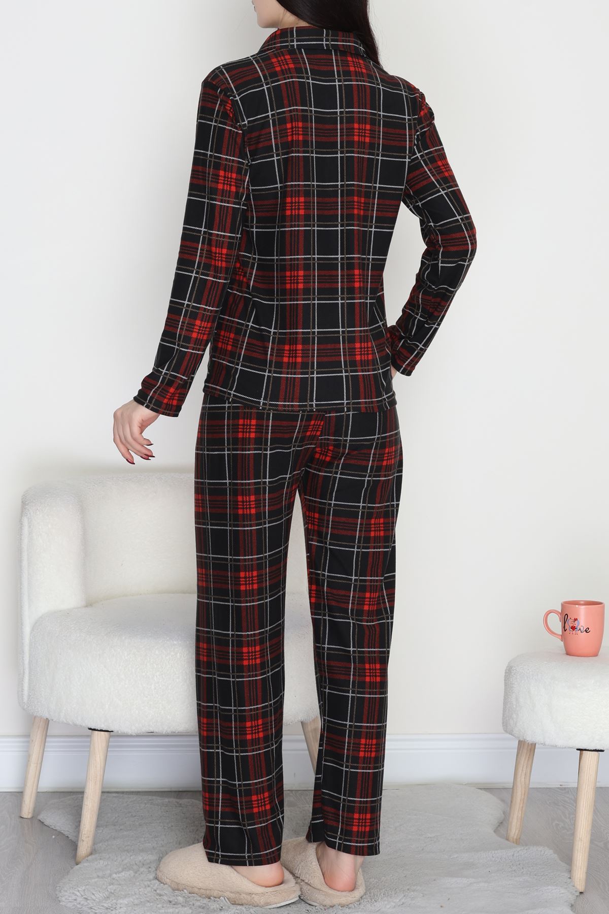 Düğmeli Süet Pijama Takımı Ekose - 450.1287.