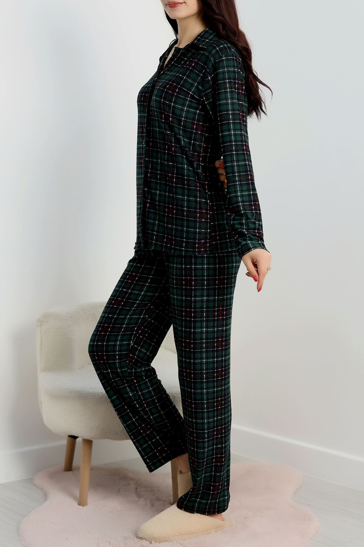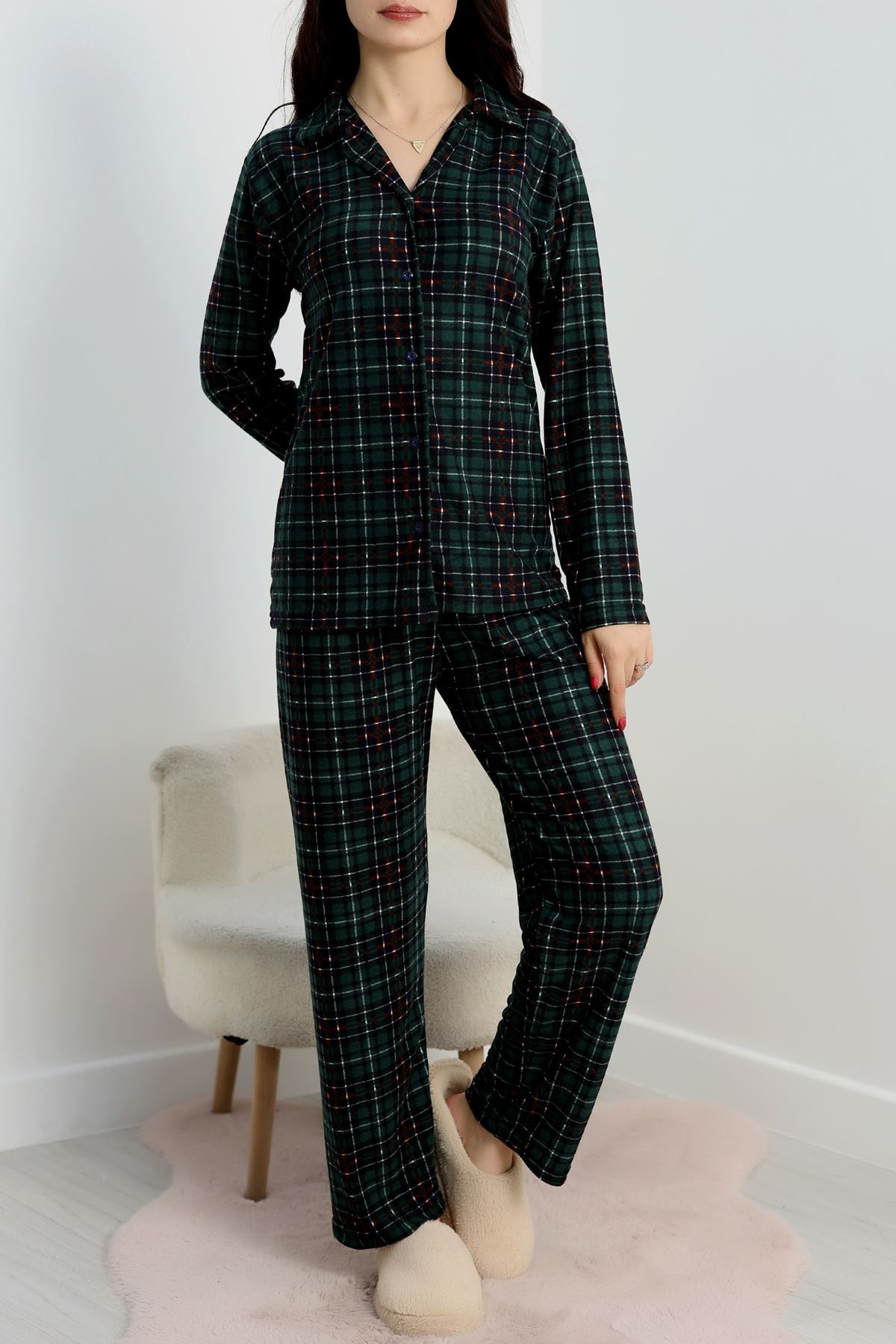 Düğmeli Süet Pijama Takımı Yeşilekose - 450.1287.