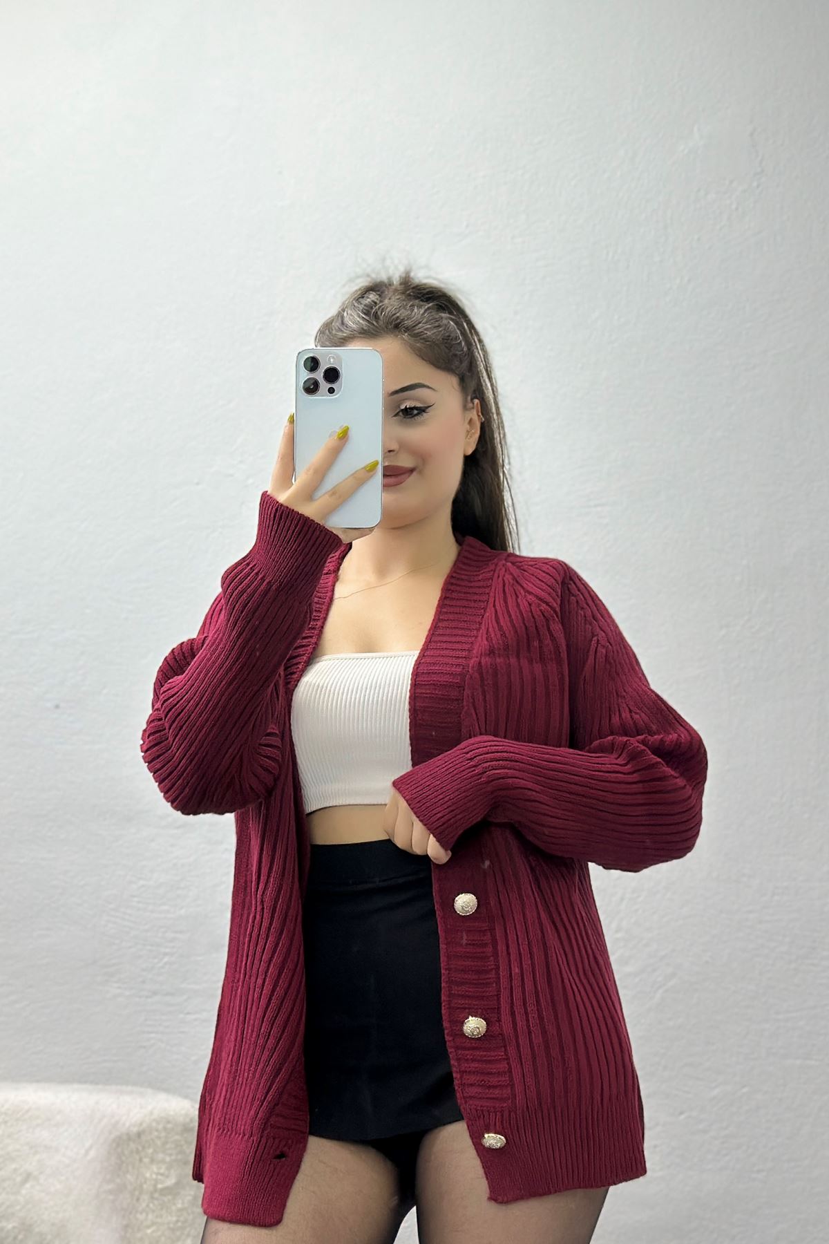 Düğmeli Triko Hırka Bordo - 4039.1577.