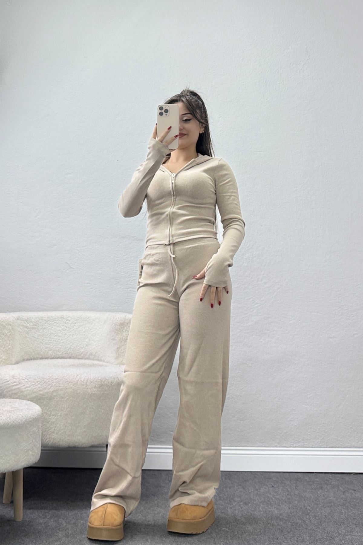 Fermuarlı Kapşonlu Likralı Kaşkorse Takım Bej - 42621.1748.