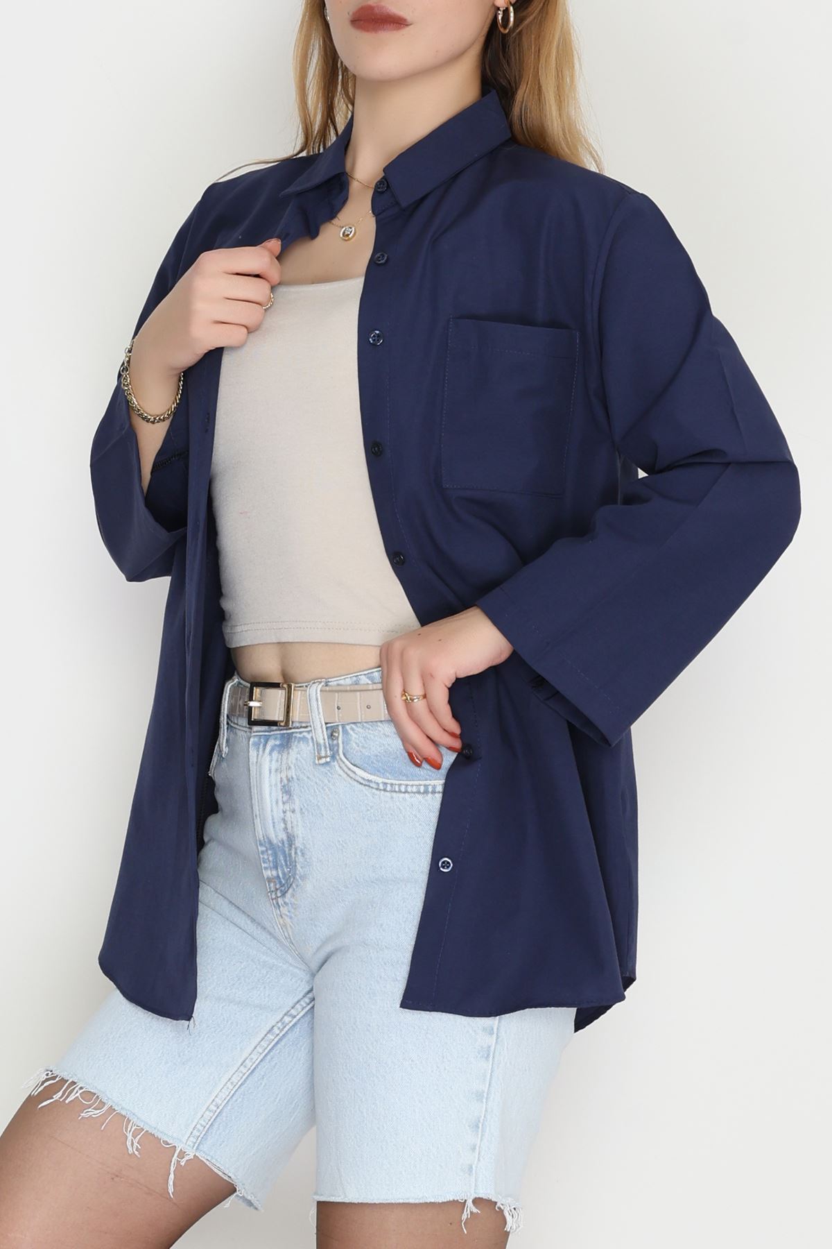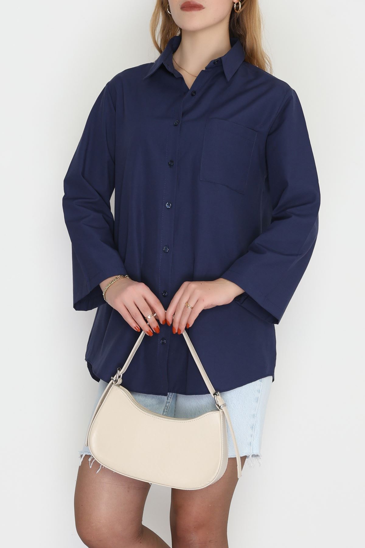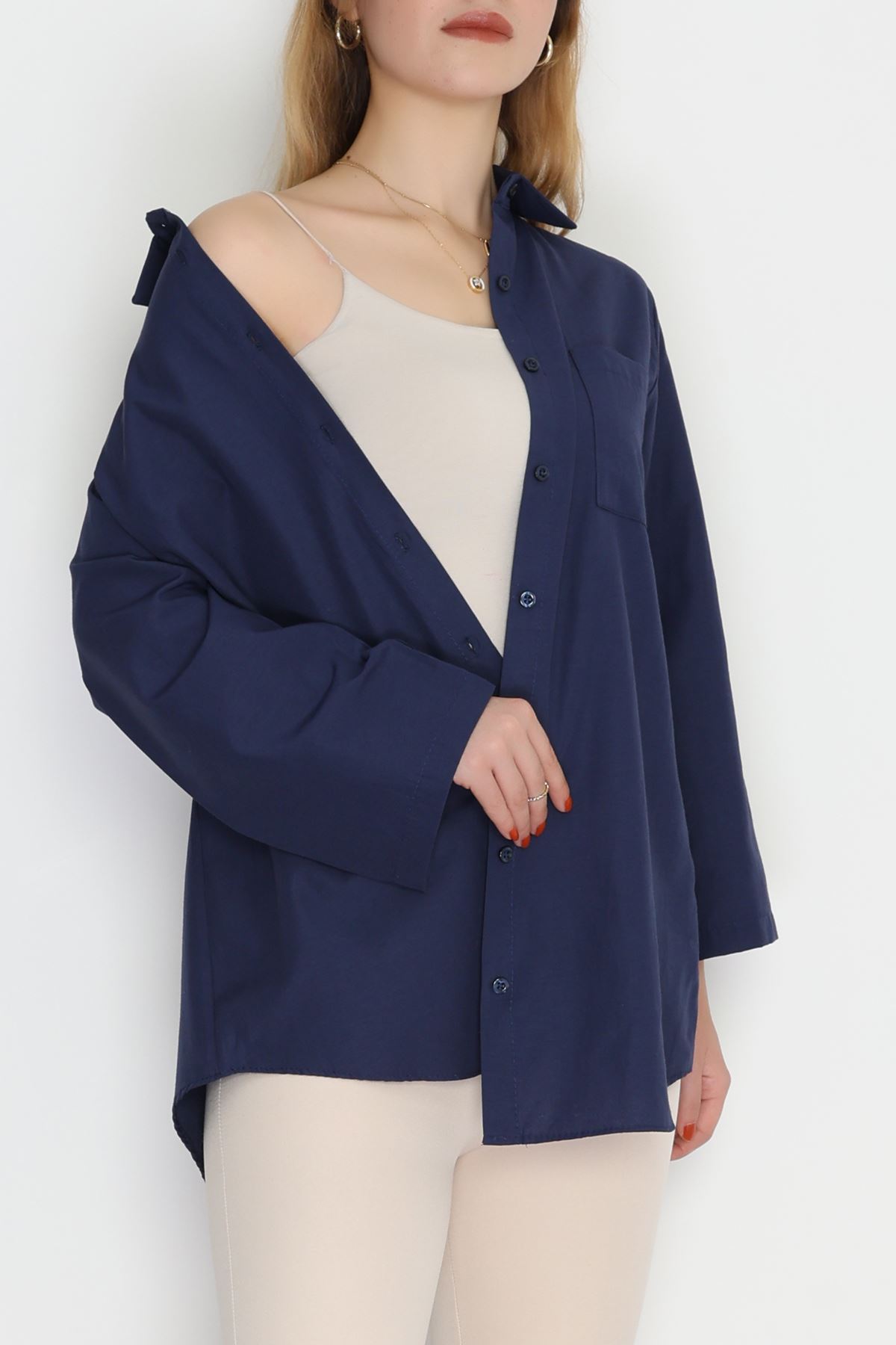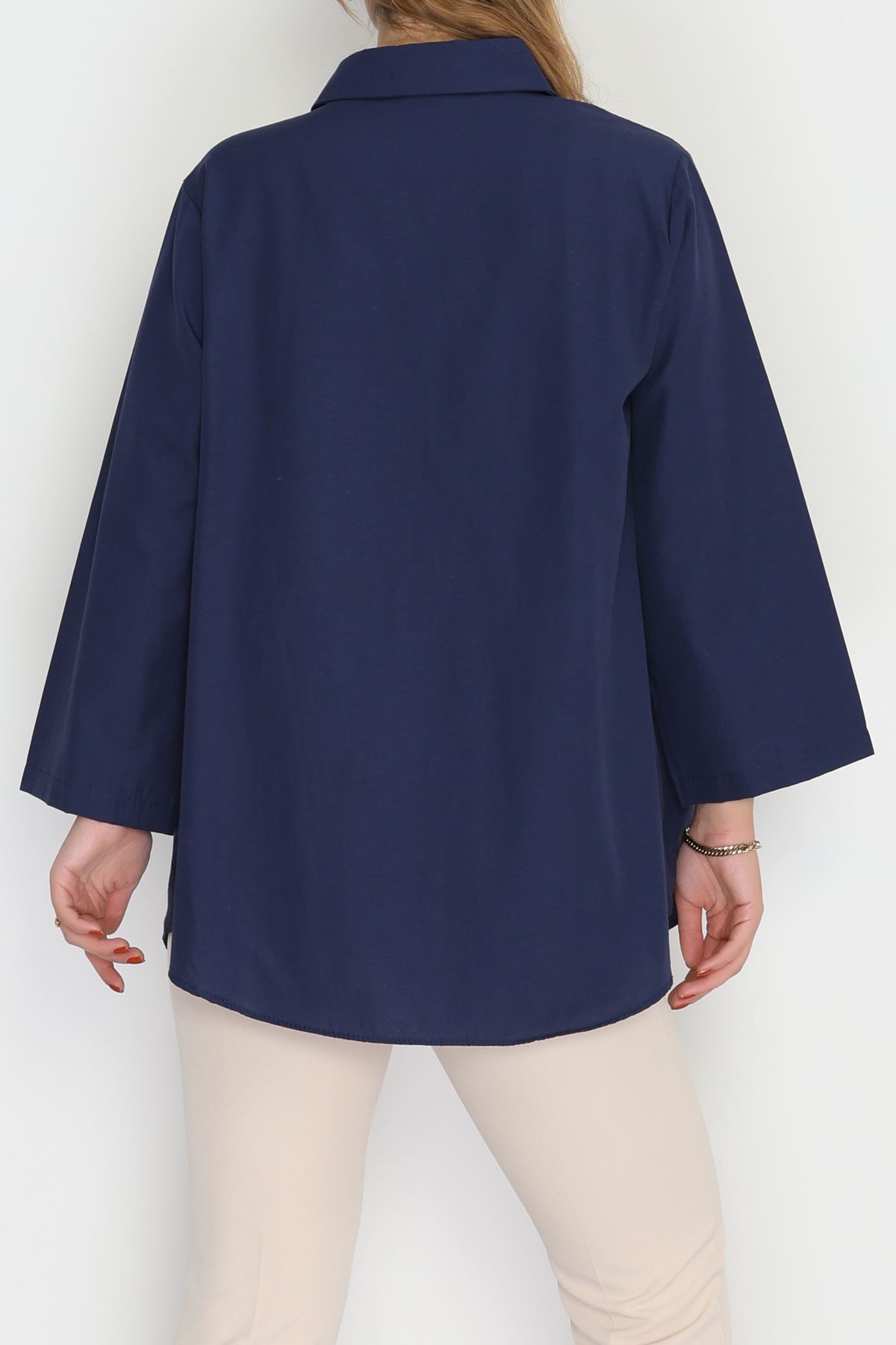 Geniş Kol Tek Cepli Oversize Terikoton Gömlek Lacivert - 2029.1949.