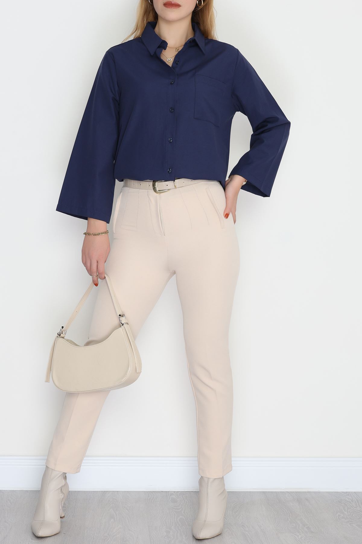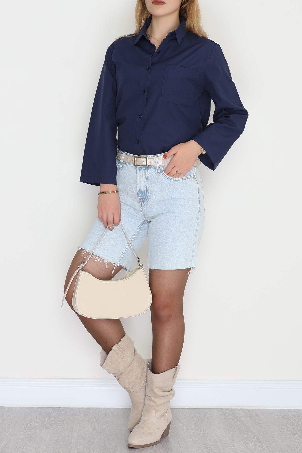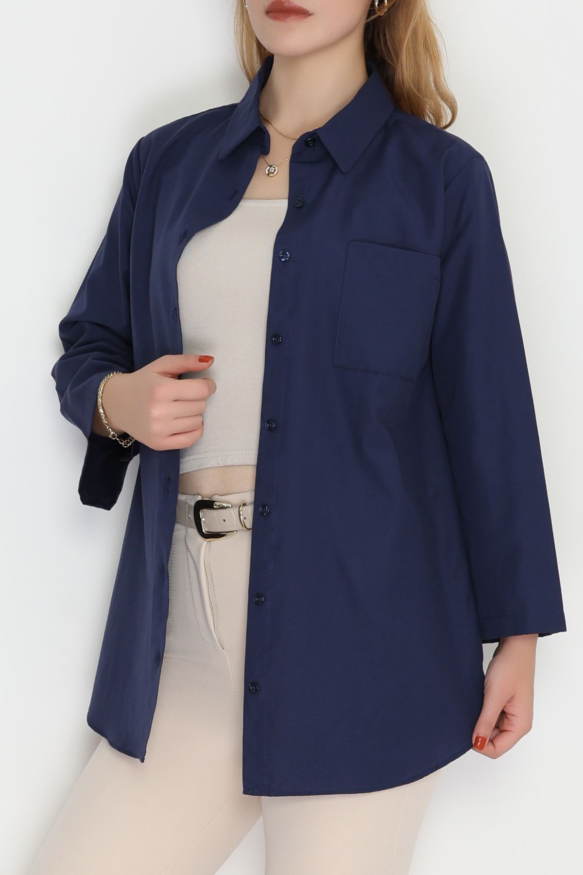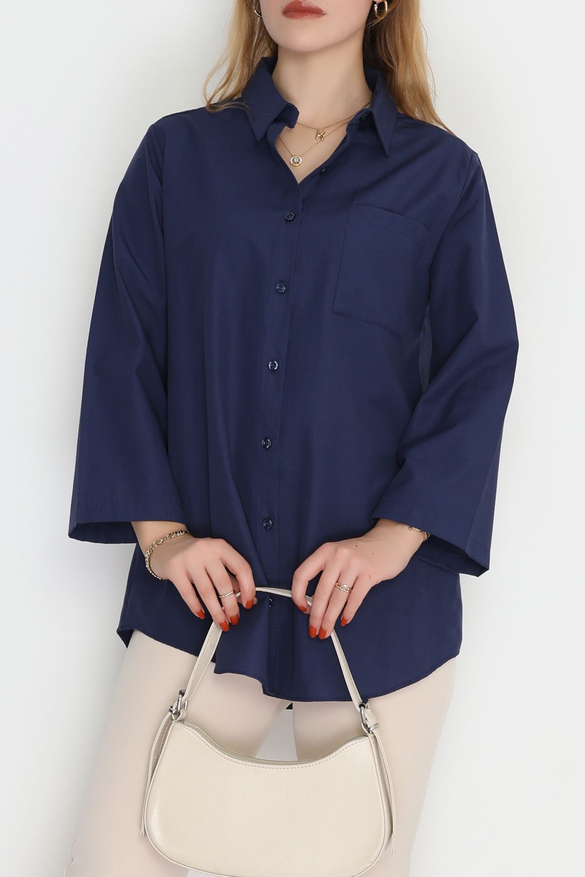 Geniş Kol Tek Cepli Oversize Terikoton Gömlek Lacivert - 2029.1949.