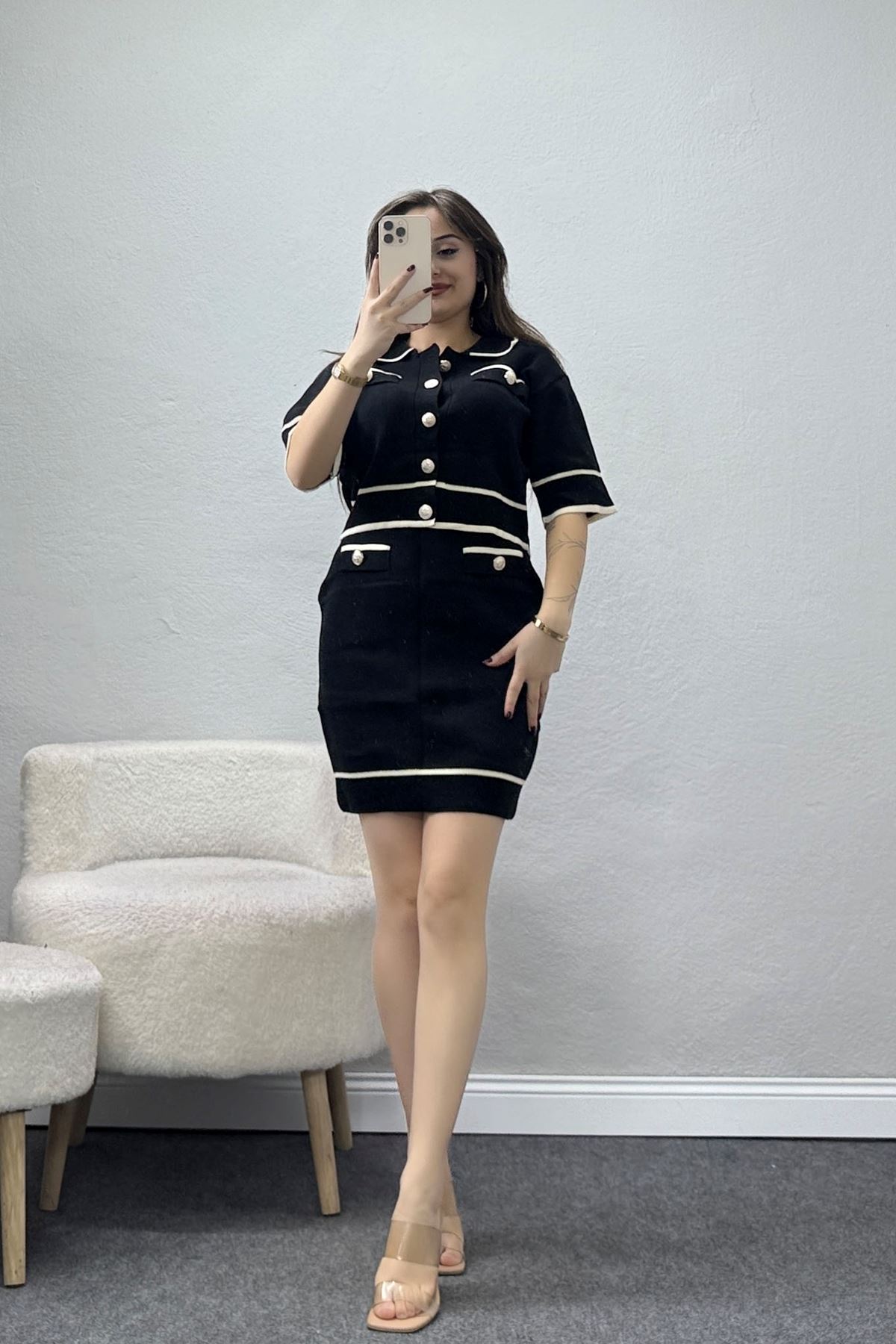 Gold Düğmeli Etekli Triko Takım Siyah - 2001.1247.