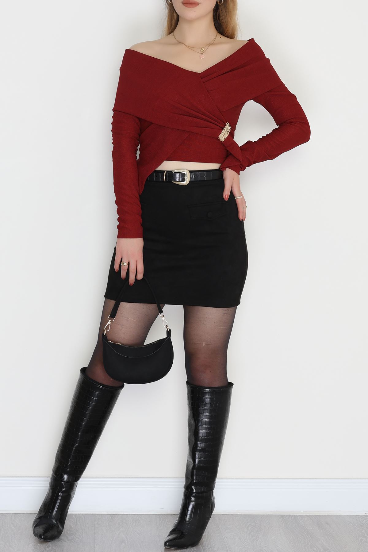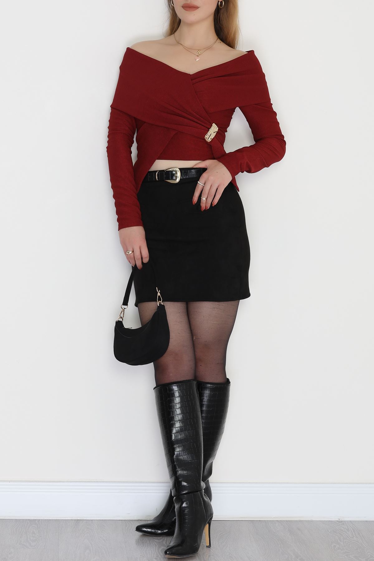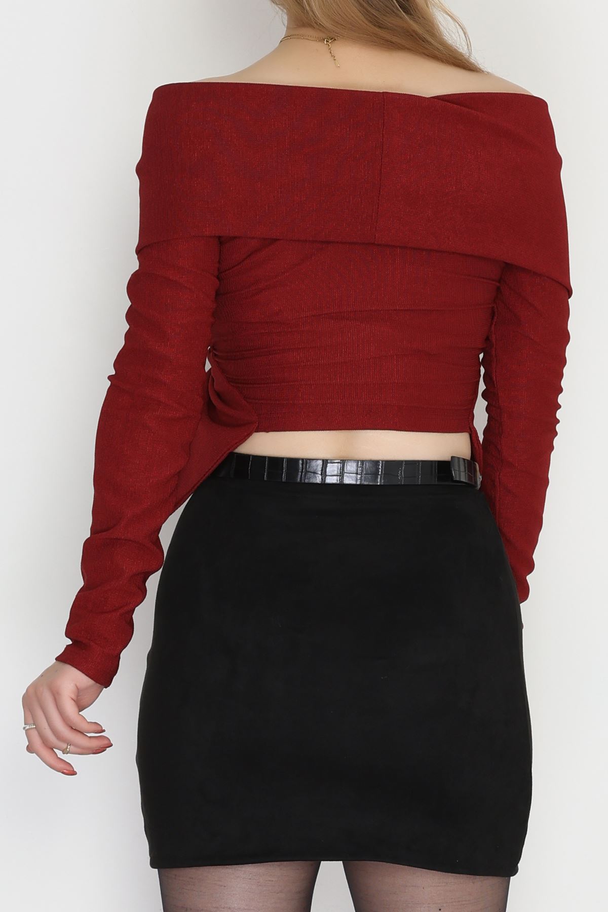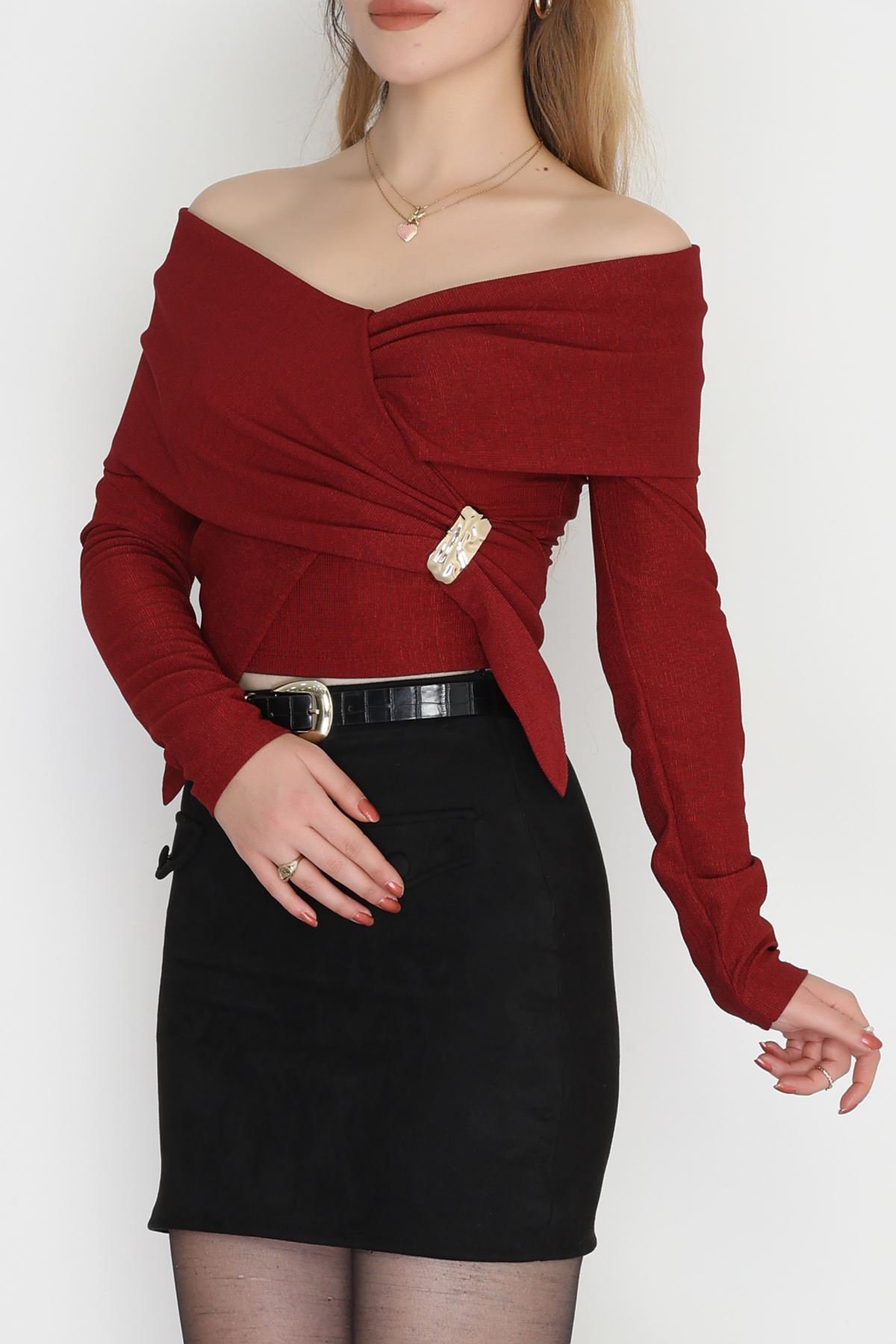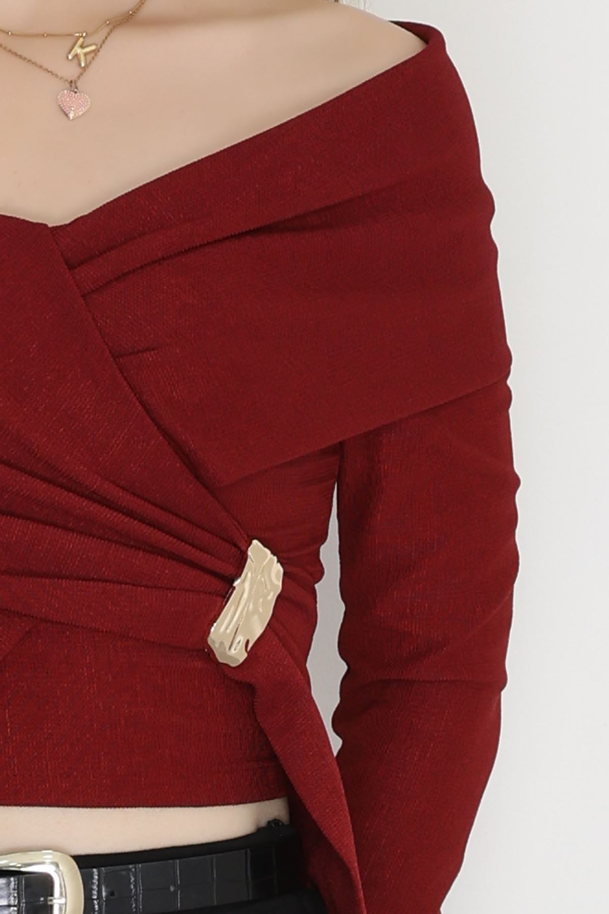 İthal Krep Madonna Yaka Aksesuarlı Bluz Bordo - 70869.148.