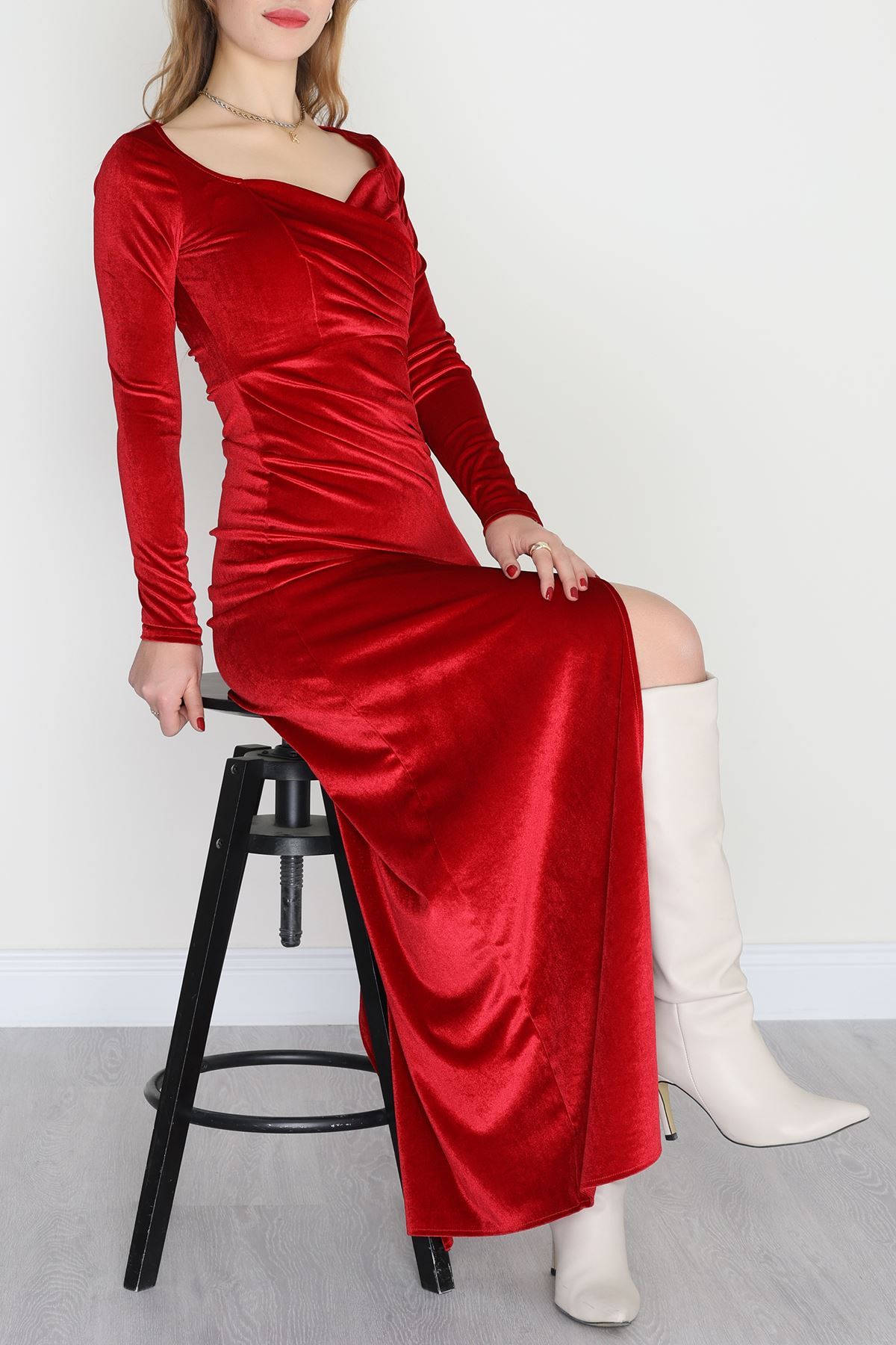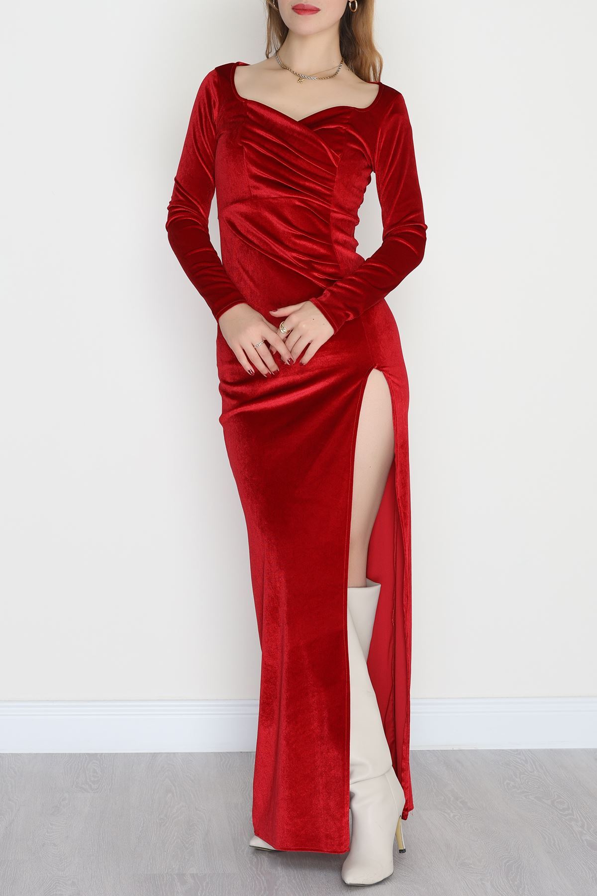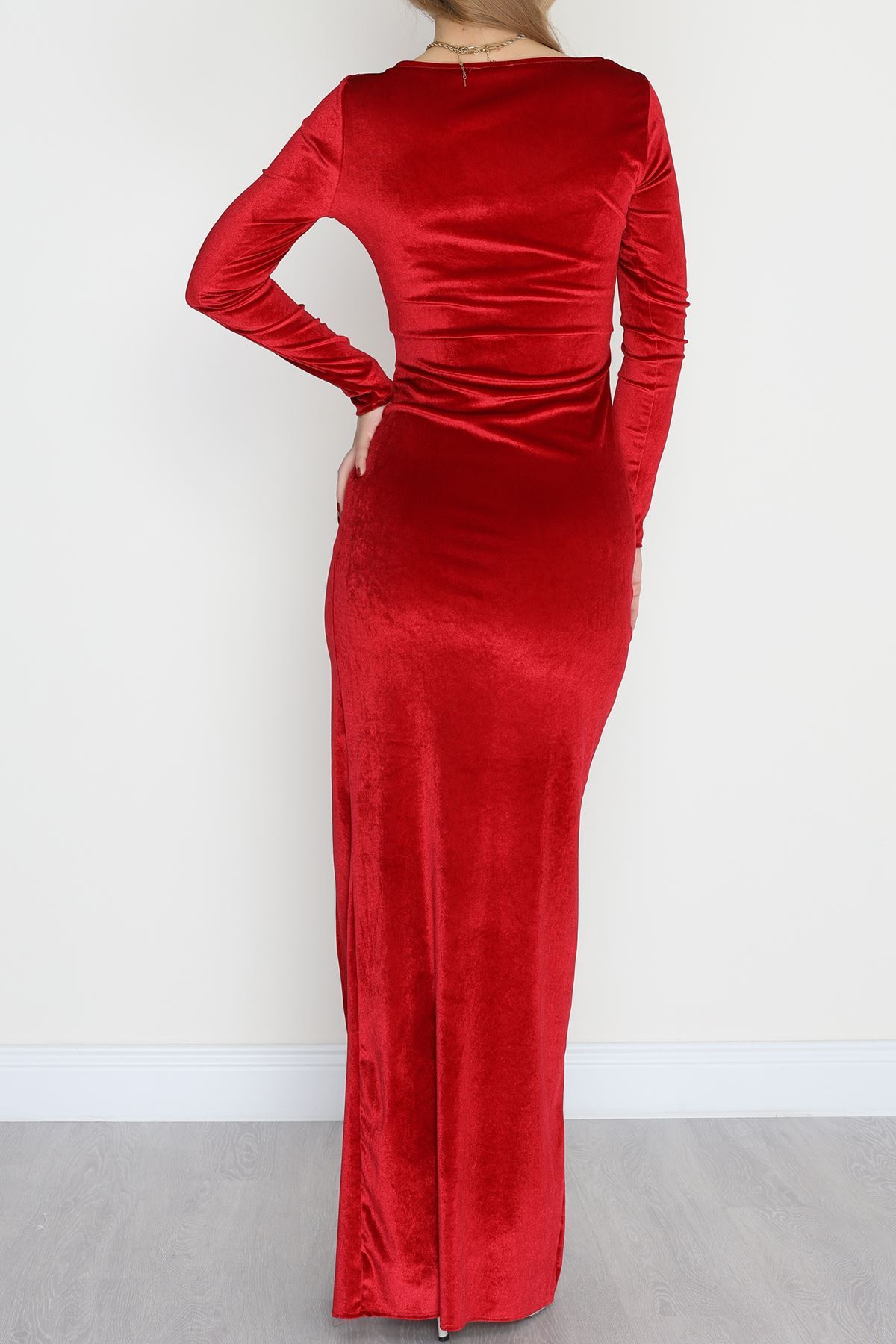 Kalp Yaka Kadife Elbise Kırmızı - 582294.1592.